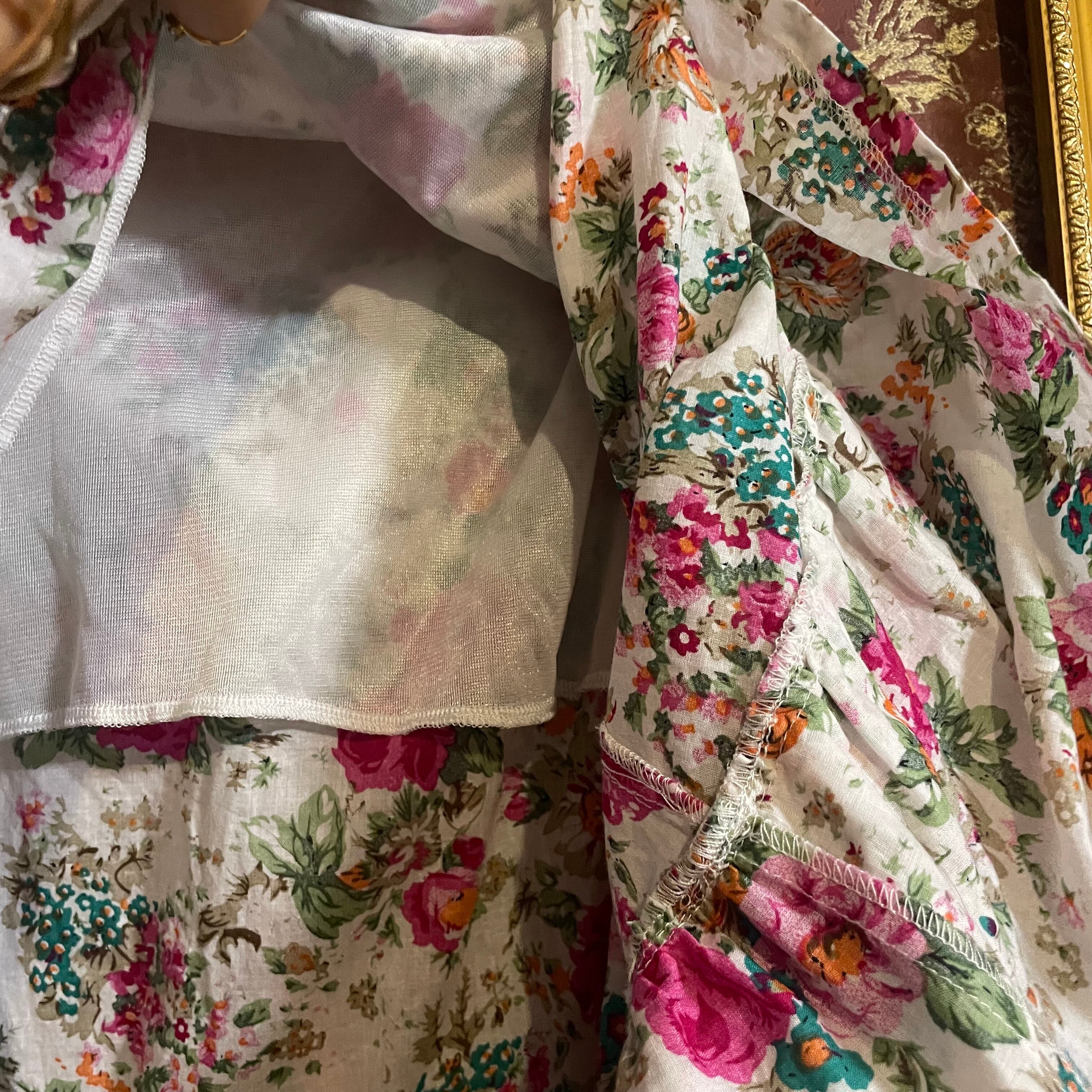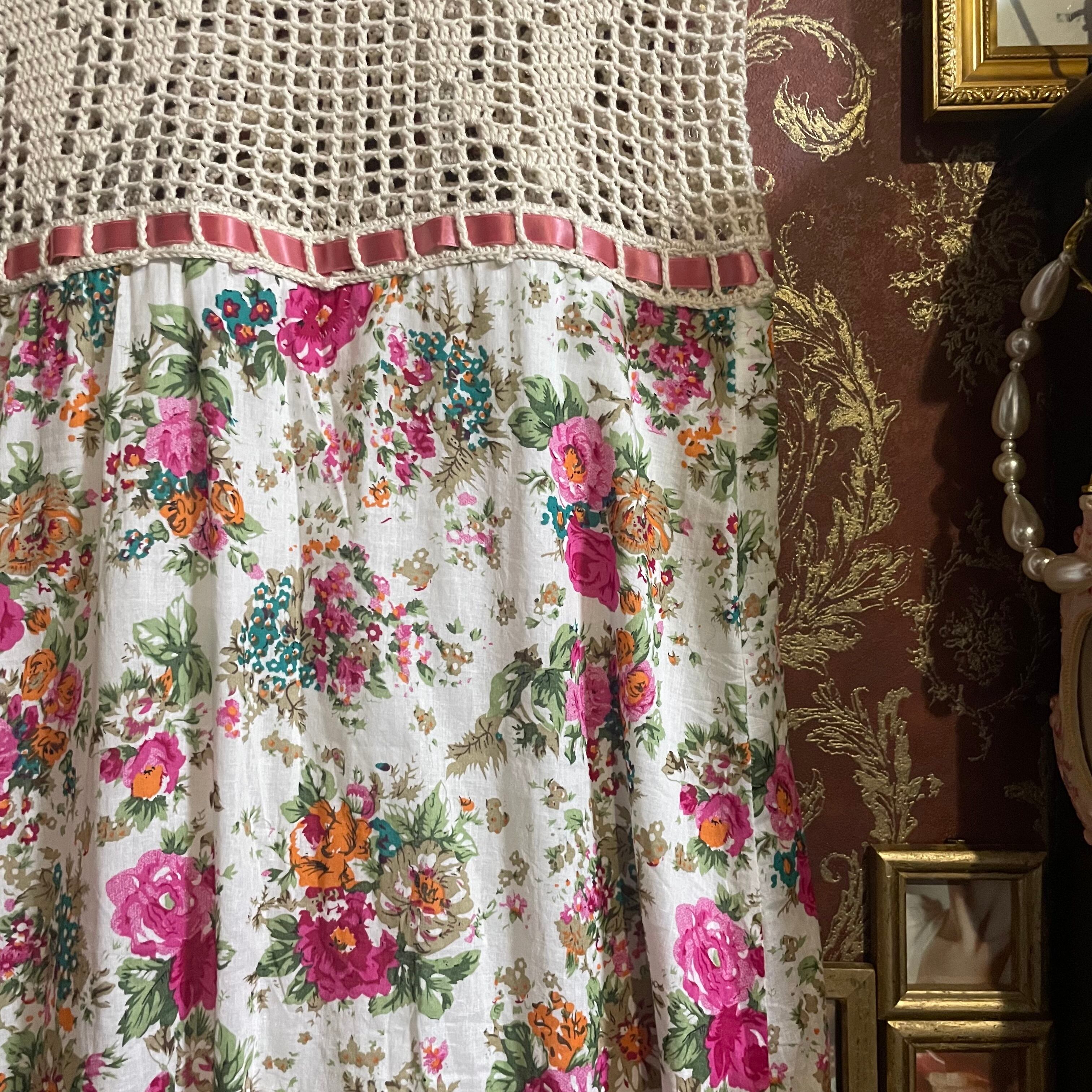 スカート部分は、花柄のプリントが華やかなコットン素材でふんわりと柔らかく広がるナチュラルなシルエットです。