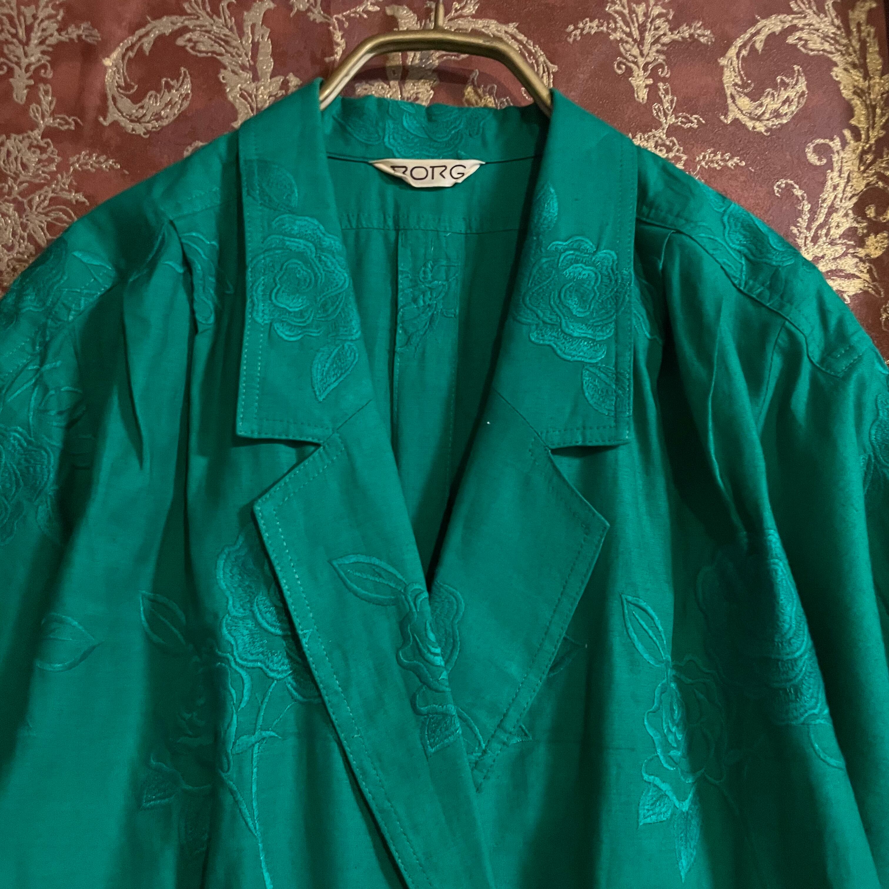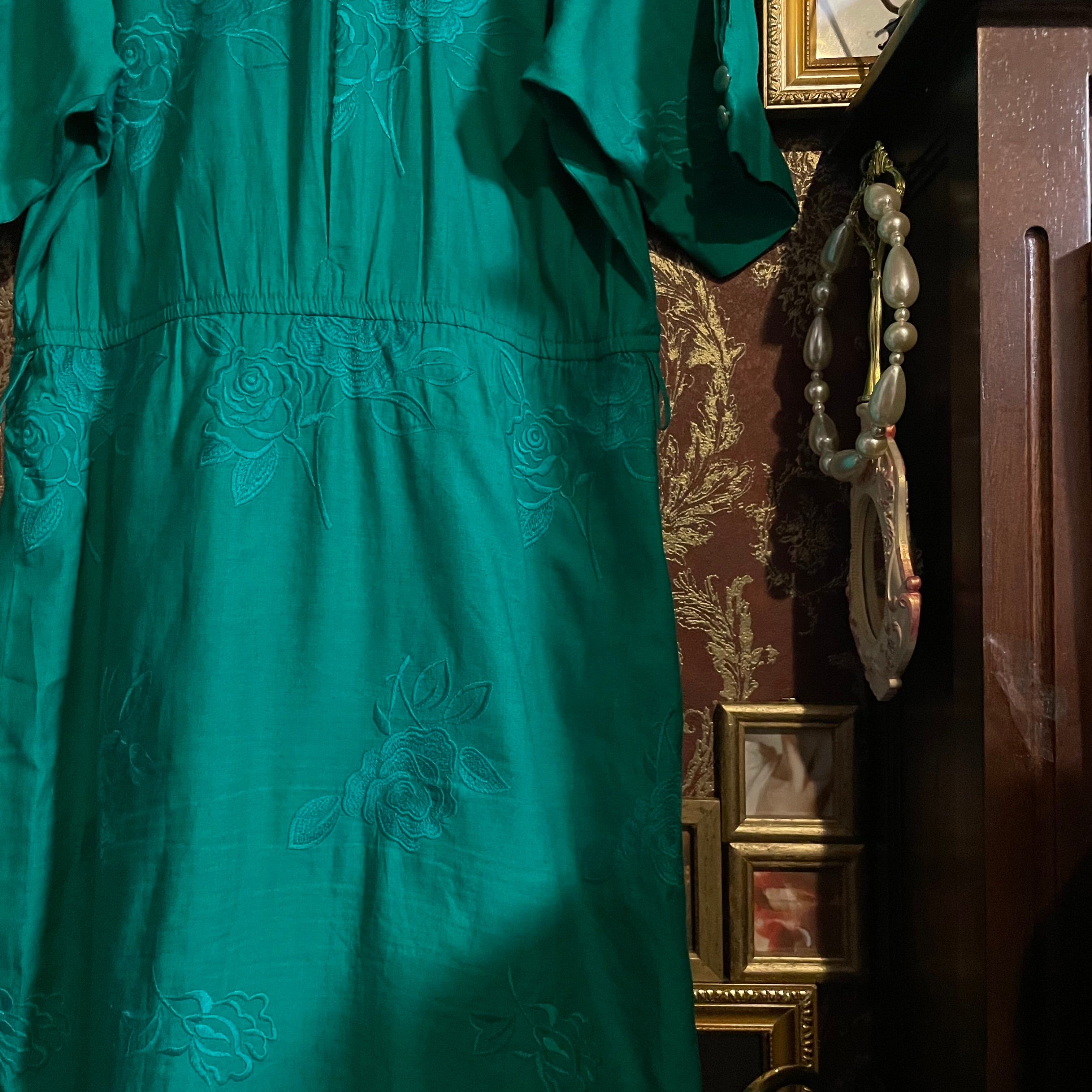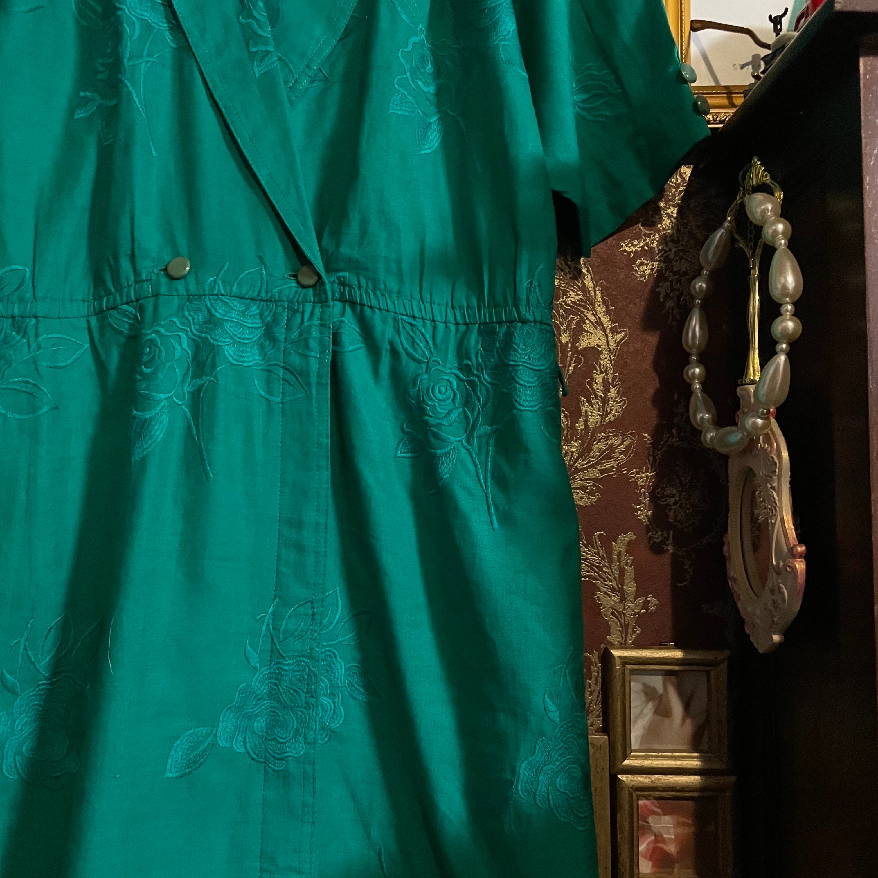 鮮やかなエメラルドグリーン(鮮やかな#0c786d)が目を惹く、ヴィンテージの半袖ワンピースです。