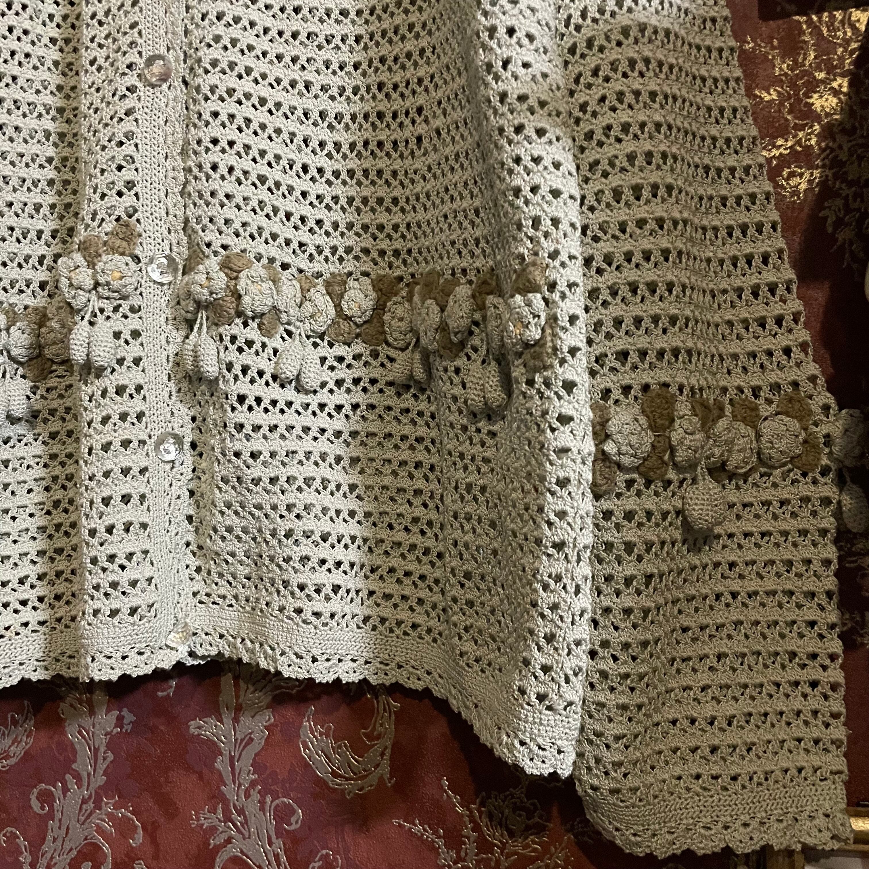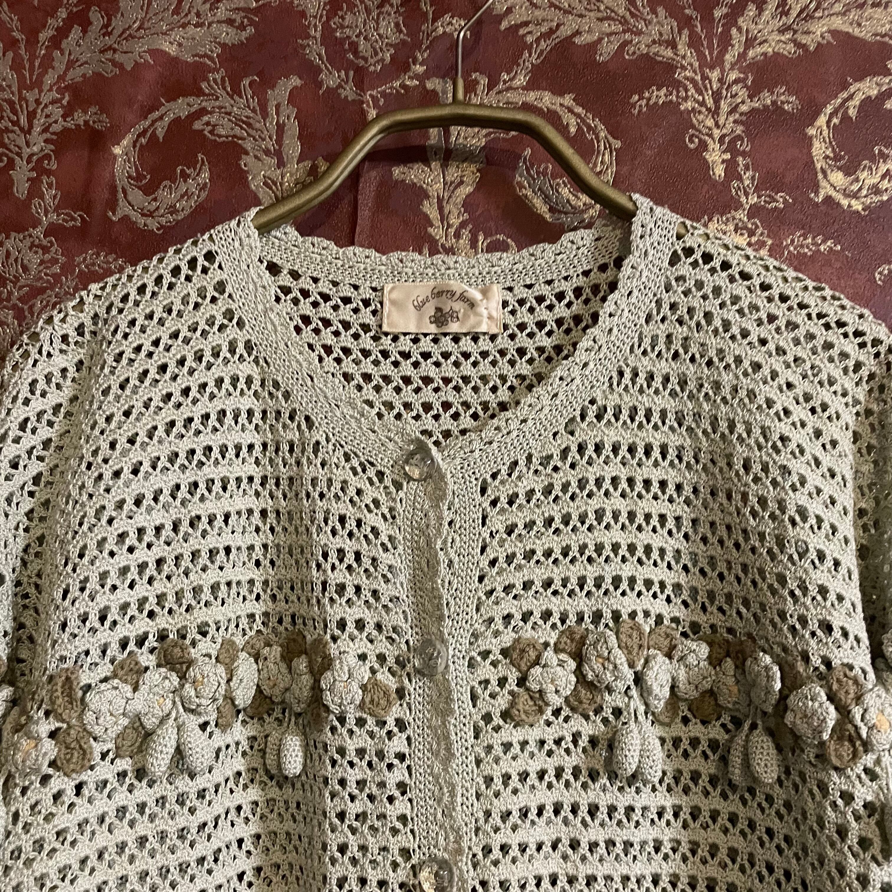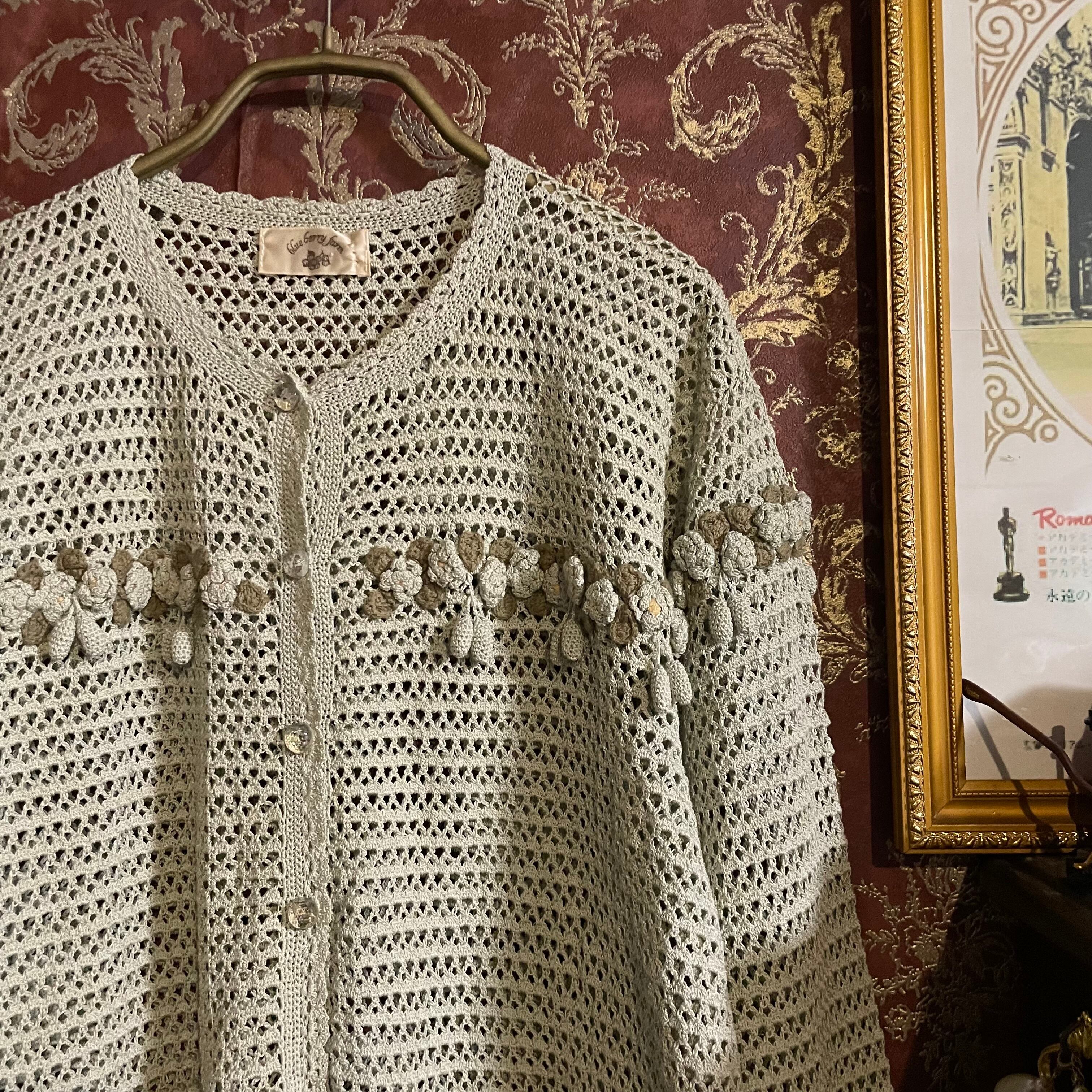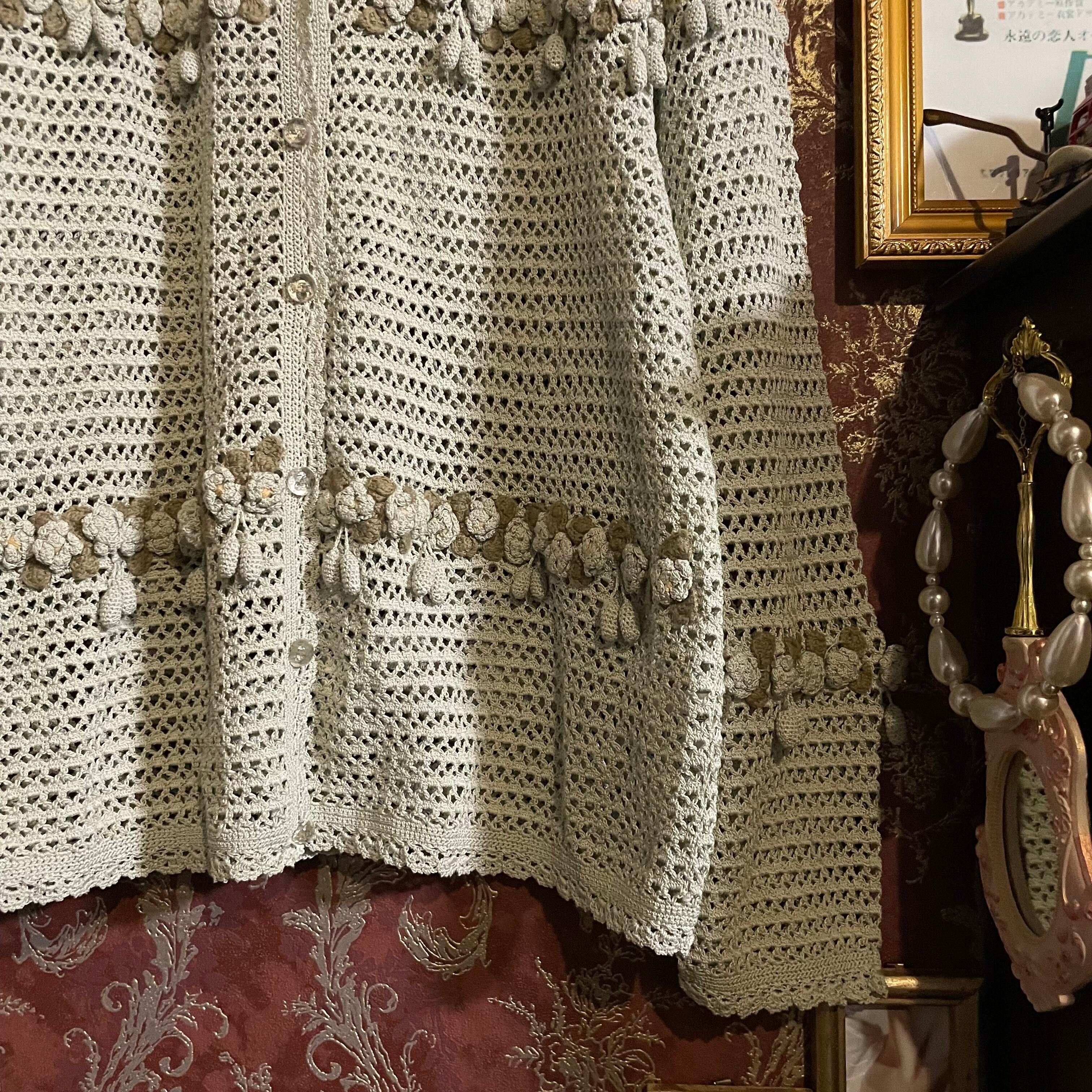 全体は透かし編みで軽やかに仕上げられ、立体的なフラワーモチーフとドロップ型の飾り編みがぐるりとあしらわれています。