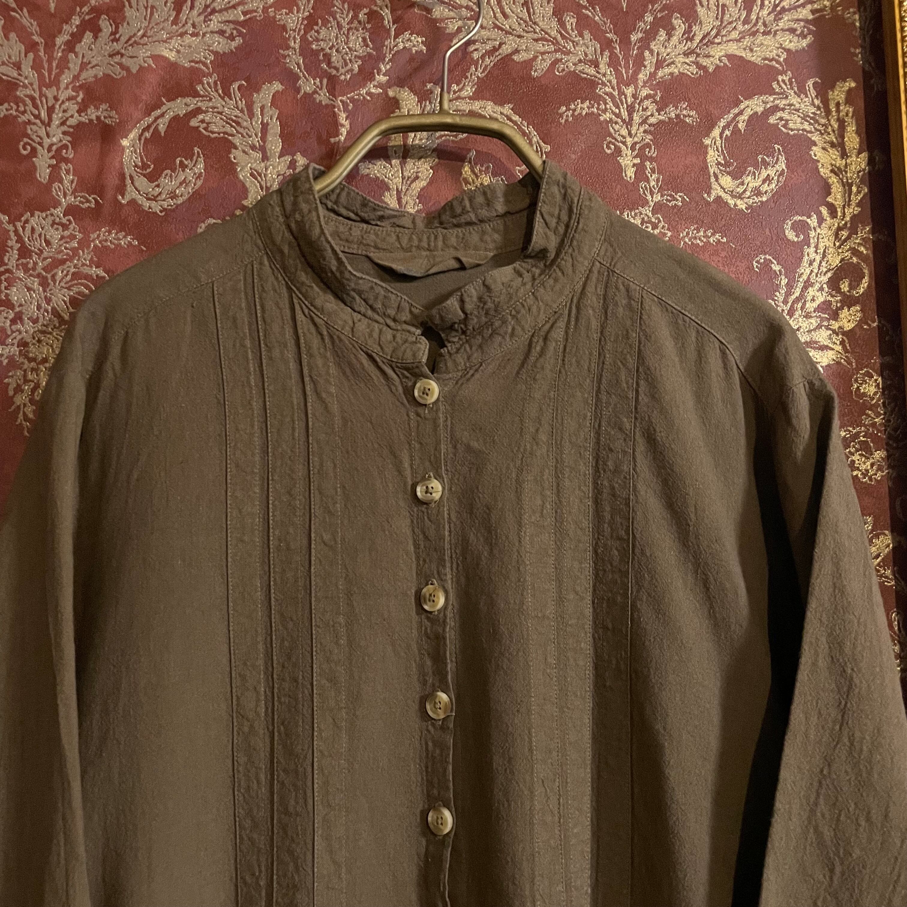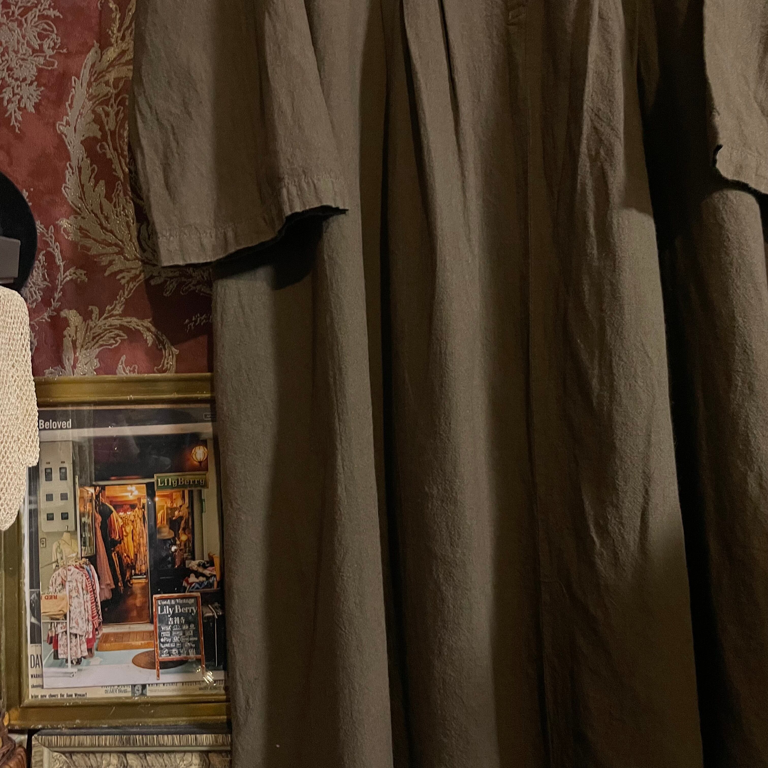 落ち着いた深みのあるカーキブラウン(#3b3526)が魅力の、綿麻混紡ワンピースです。