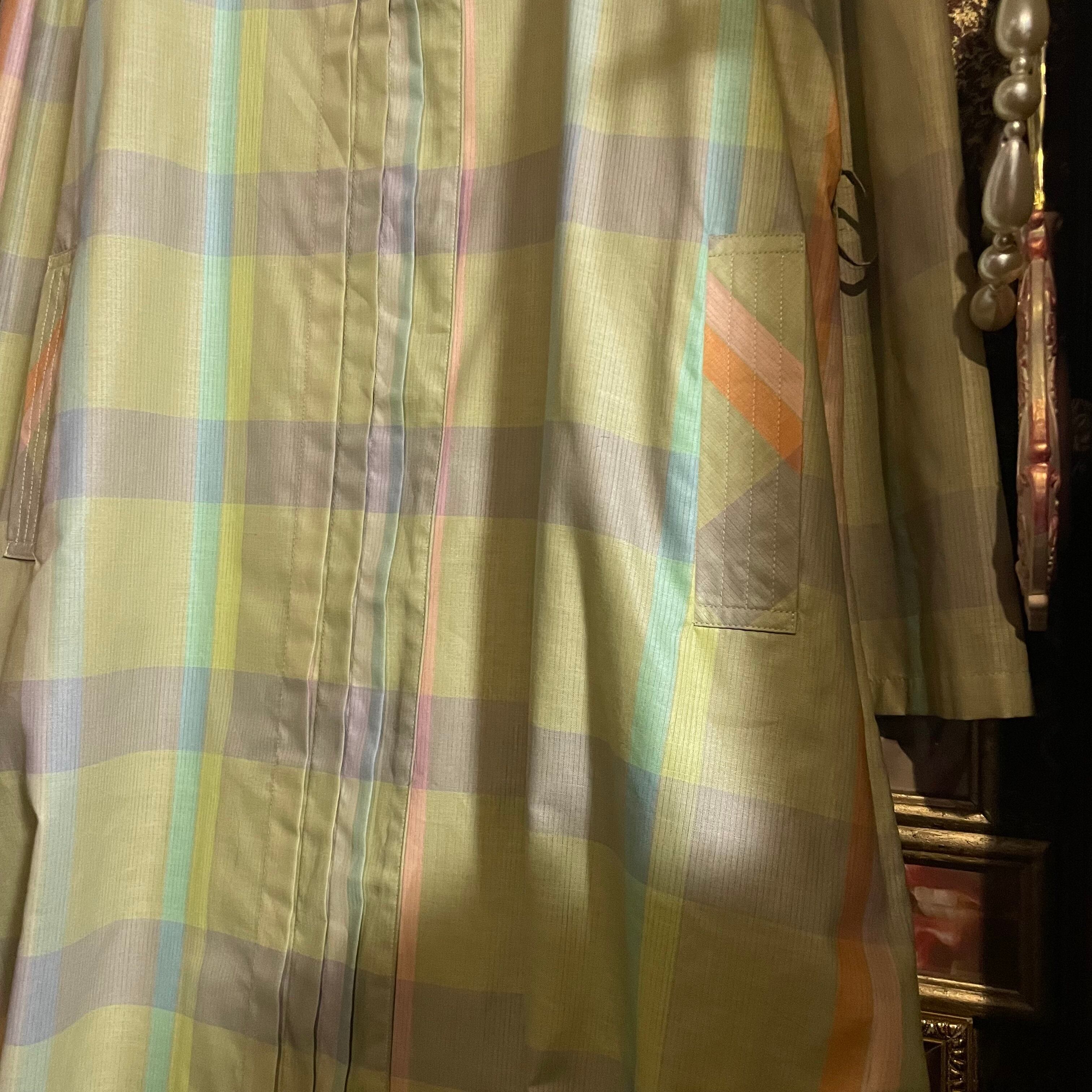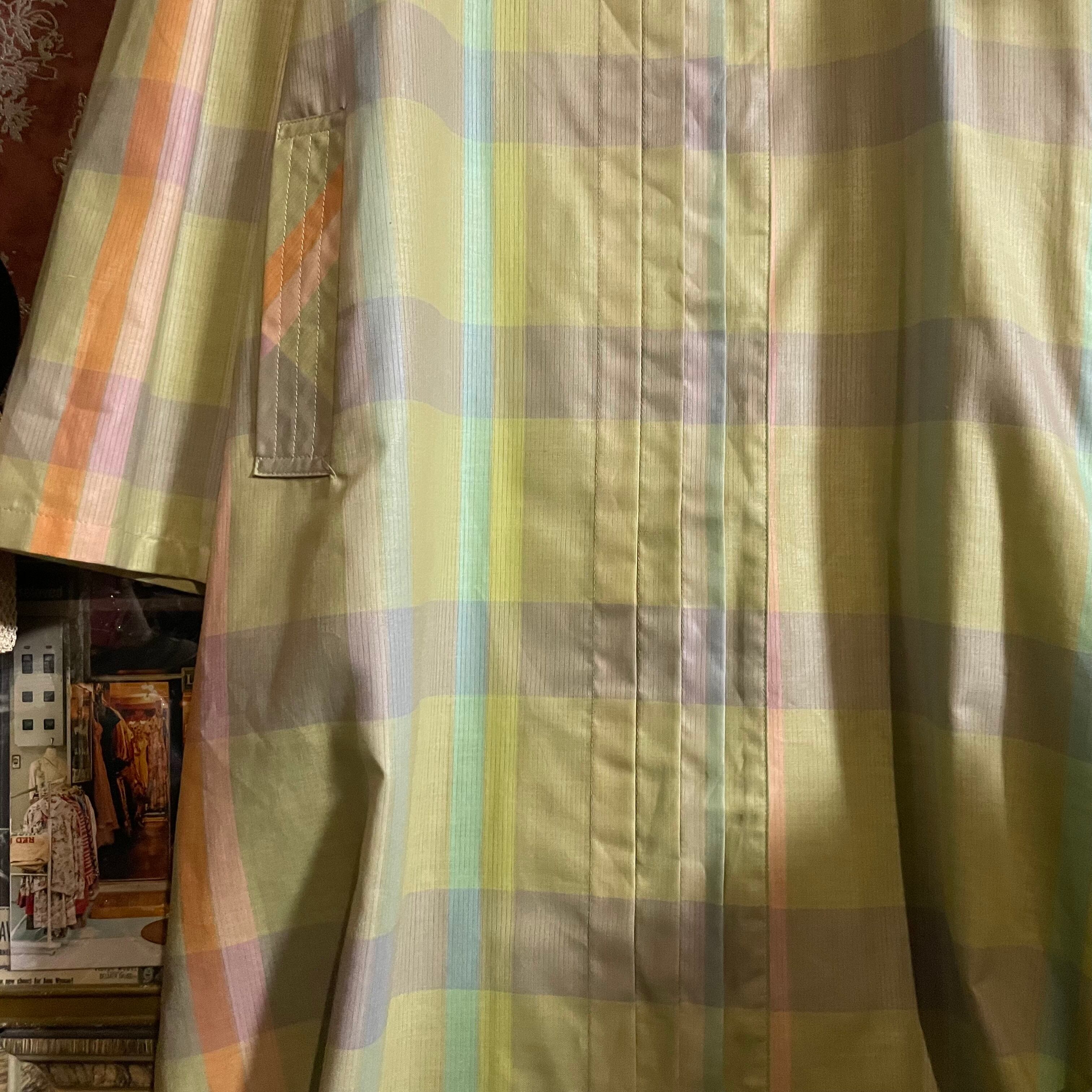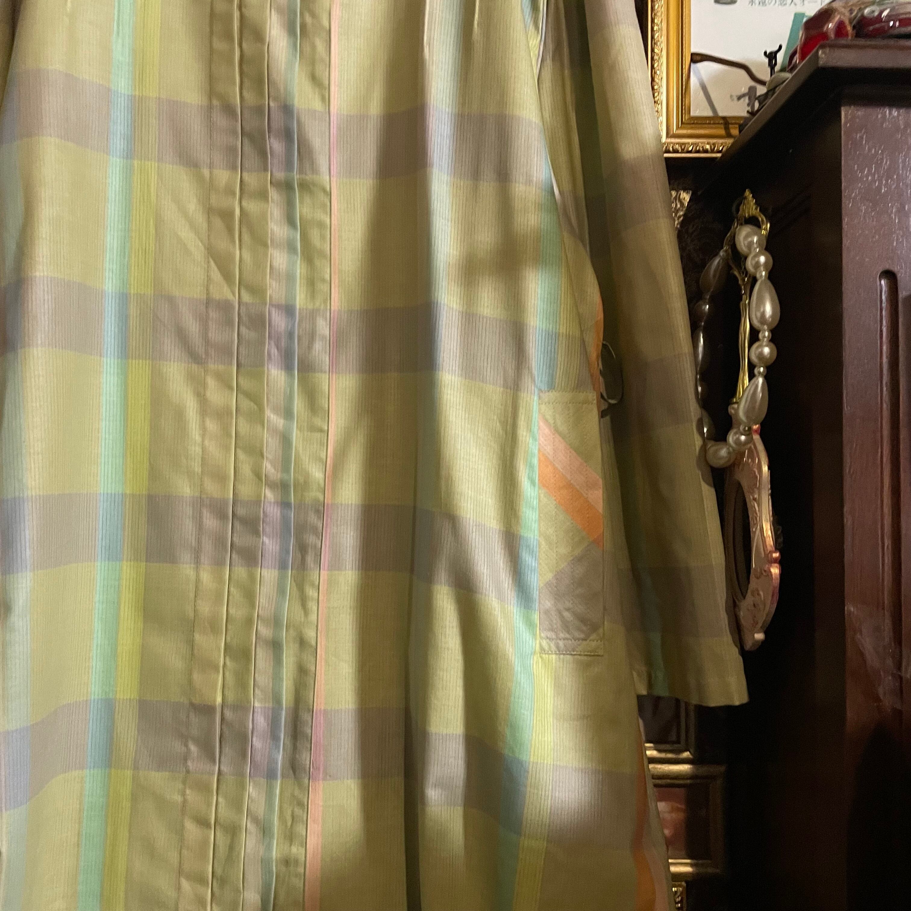 ずんだのような淡い緑(#b5b88d)をベースに、パステル調のオレンジ・ピンク・ブルー・イエローが優しく交差する大きめチェック柄の軽やかな羽織りです。