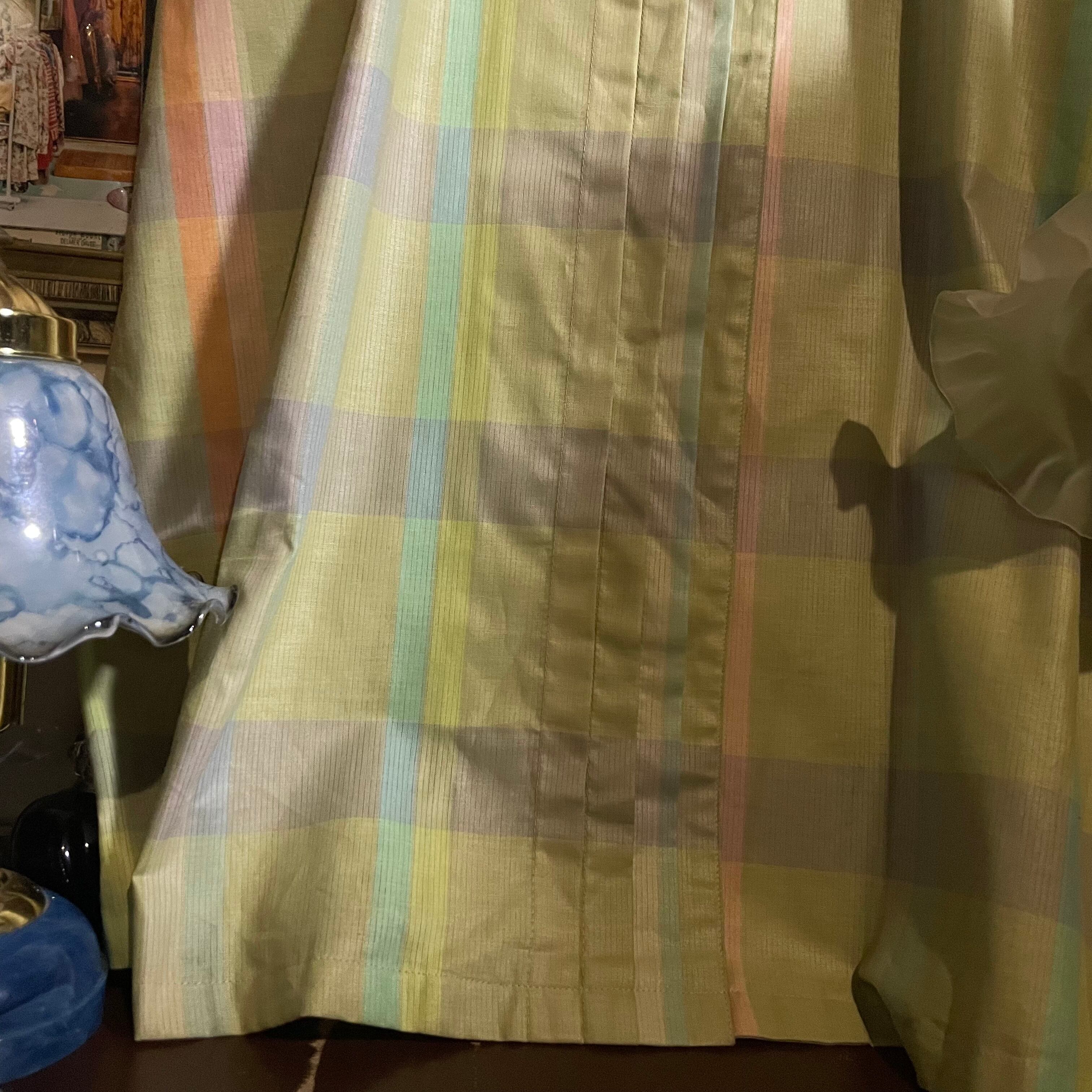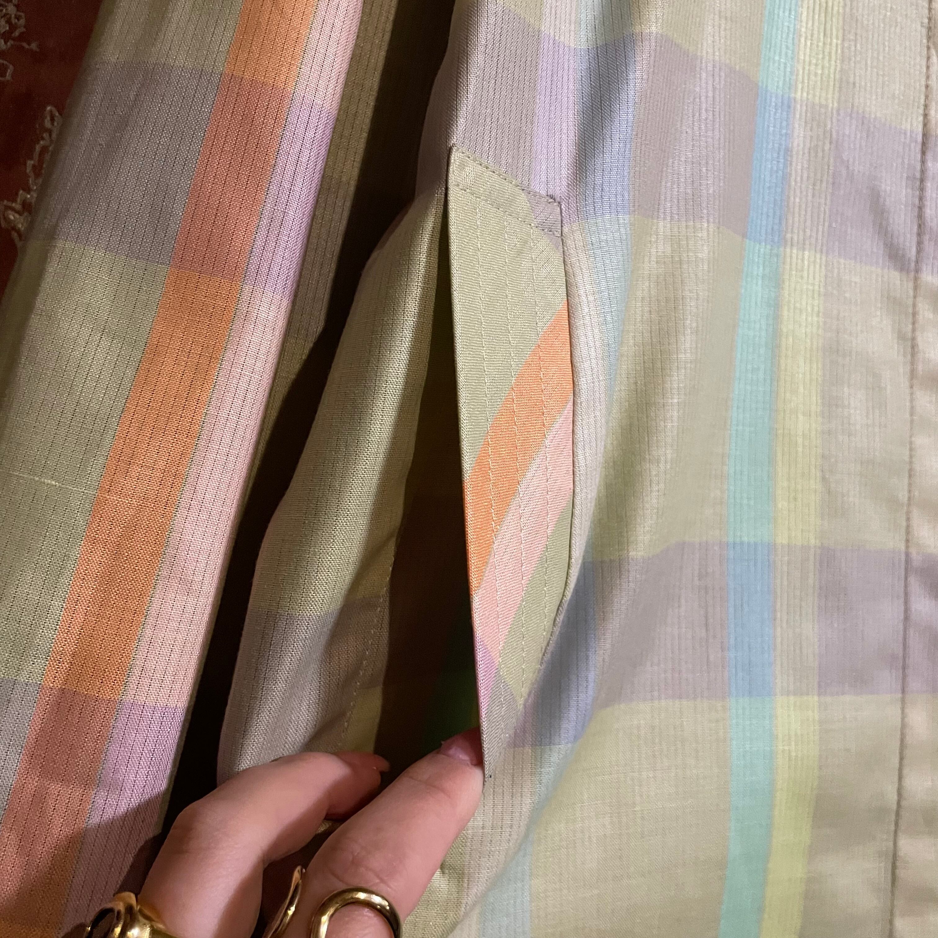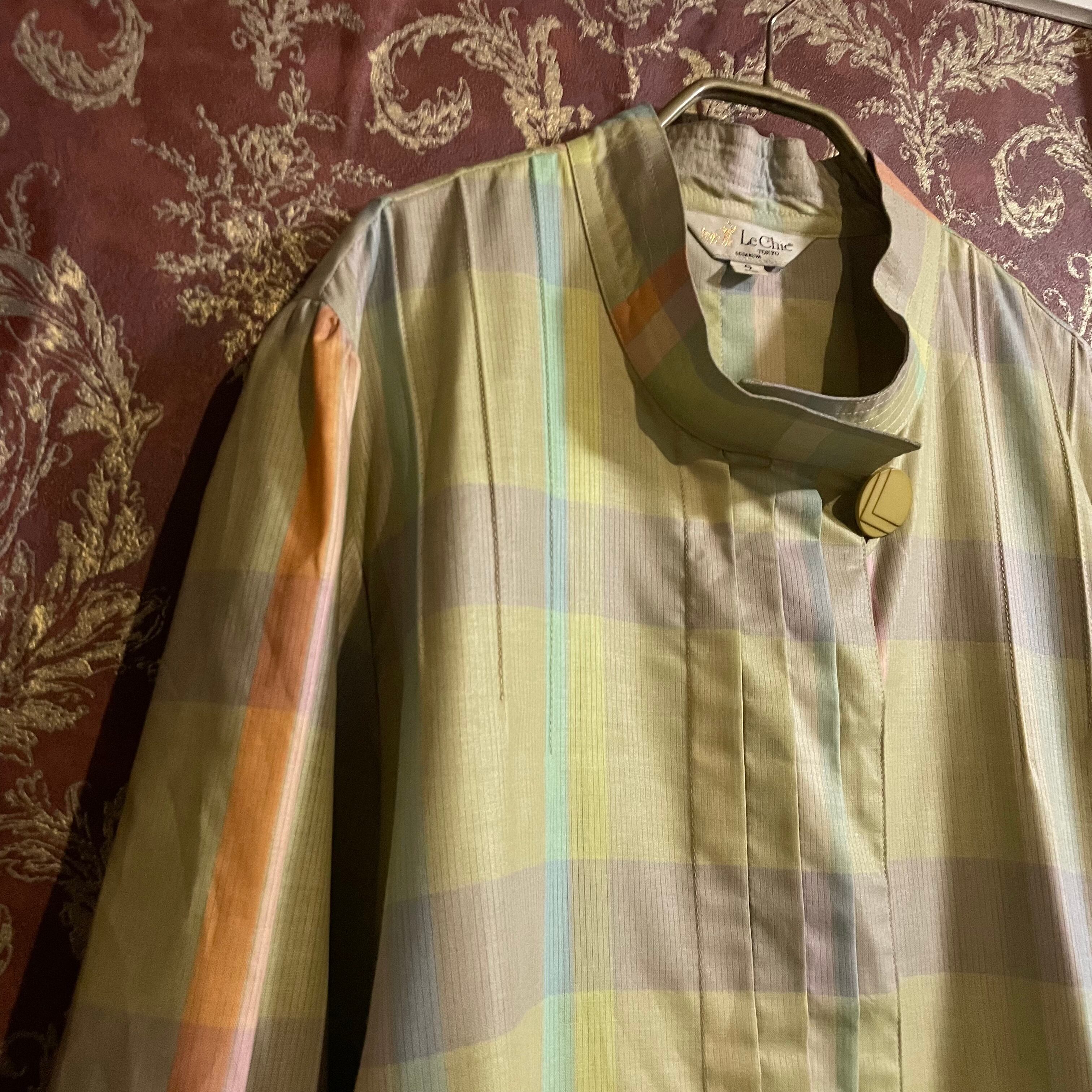 ずんだのような淡い緑(#b5b88d)をベースに、パステル調のオレンジ・ピンク・ブルー・イエローが優しく交差する大きめチェック柄の軽やかな羽織りです。