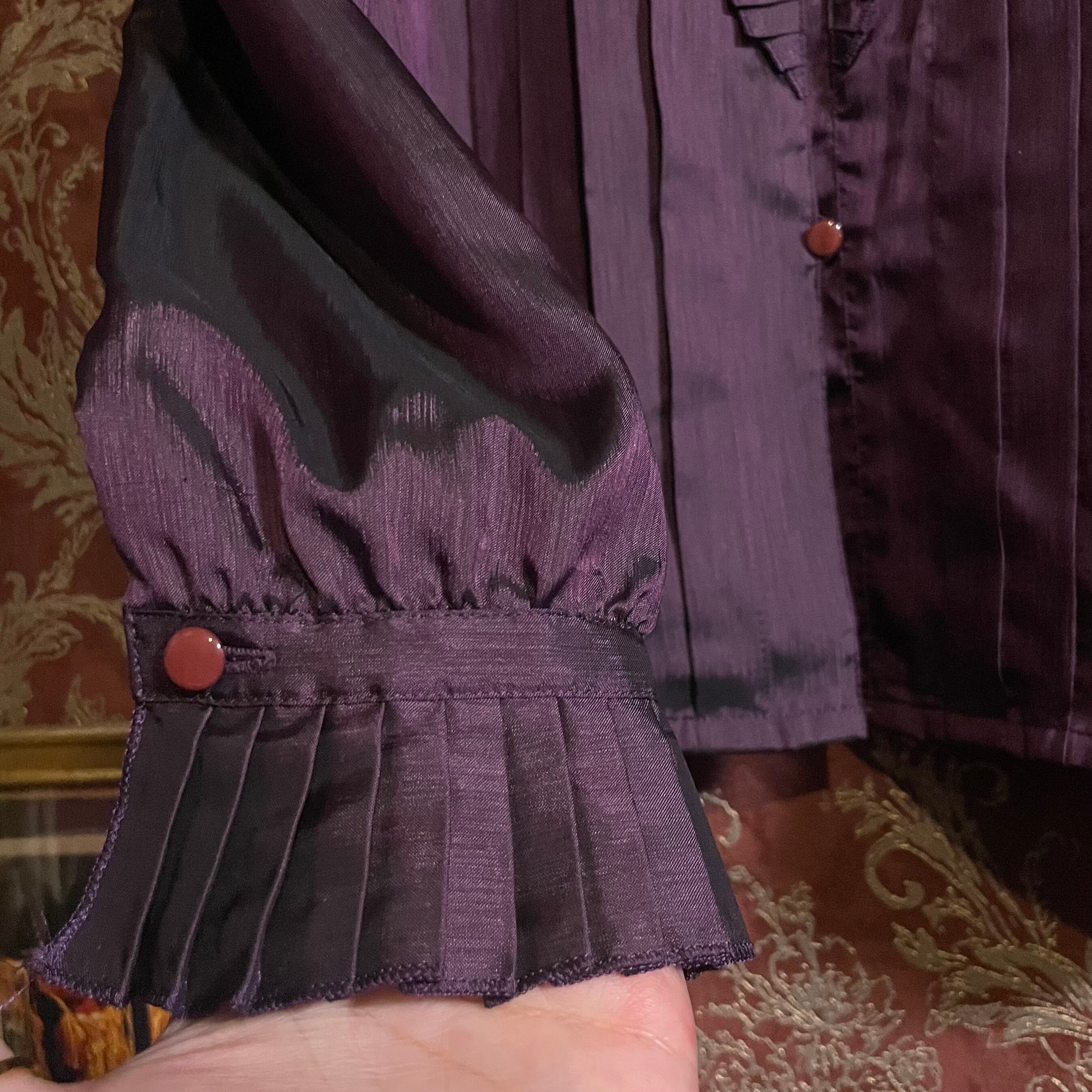 深みのあるパープルの玉虫生地を使用した長袖ブラウスです。
