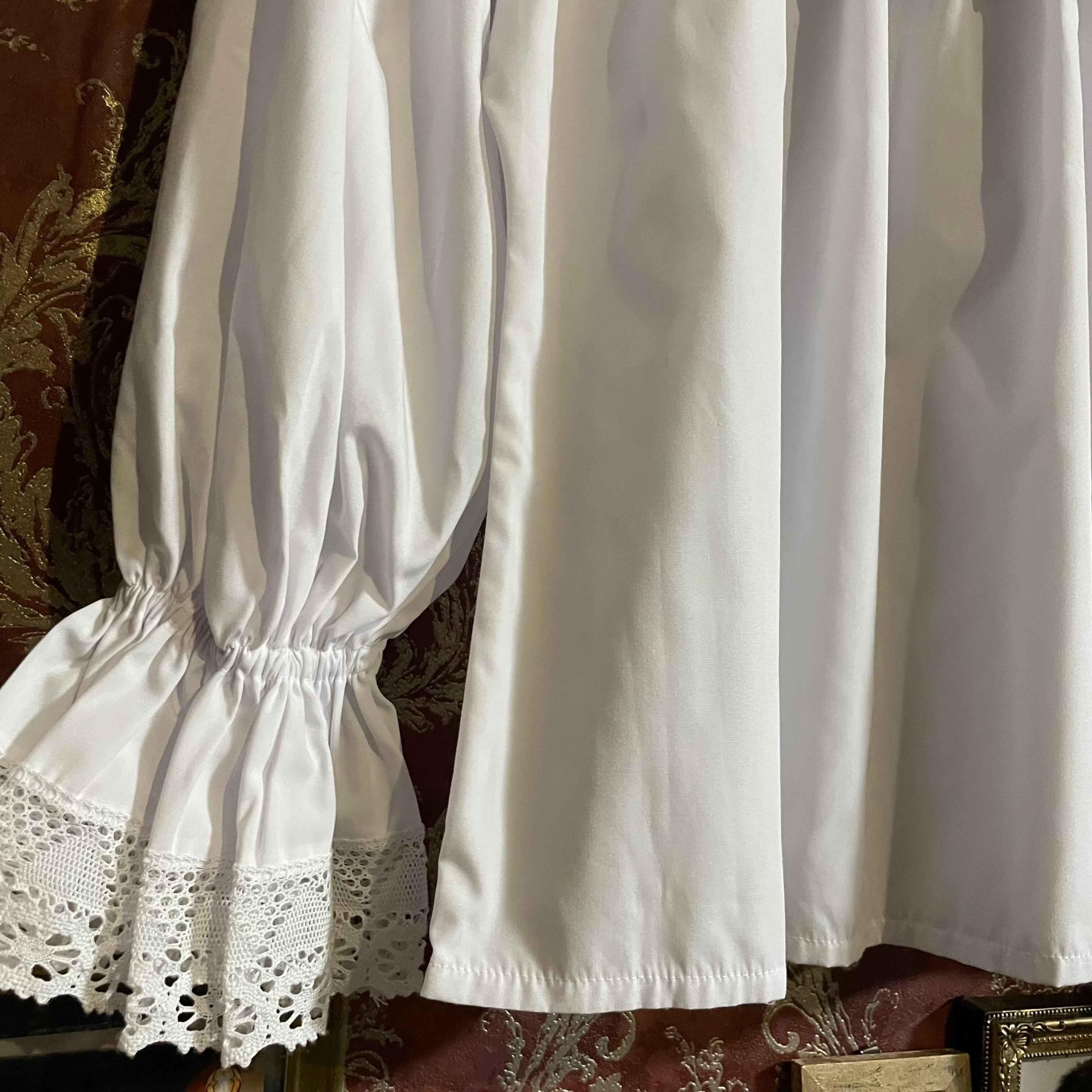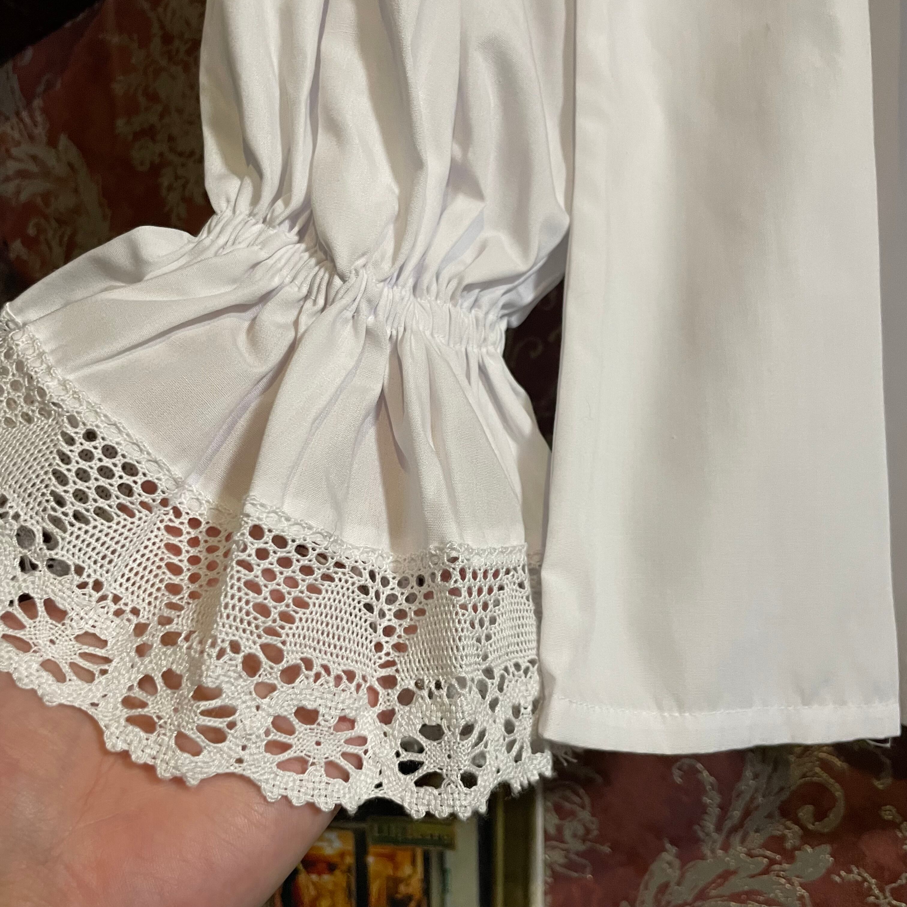 大きめのスクエアネックに重ねたレースフリルと、袖口のシャーリング&フリルが華やかなアクセントのブラウスです。