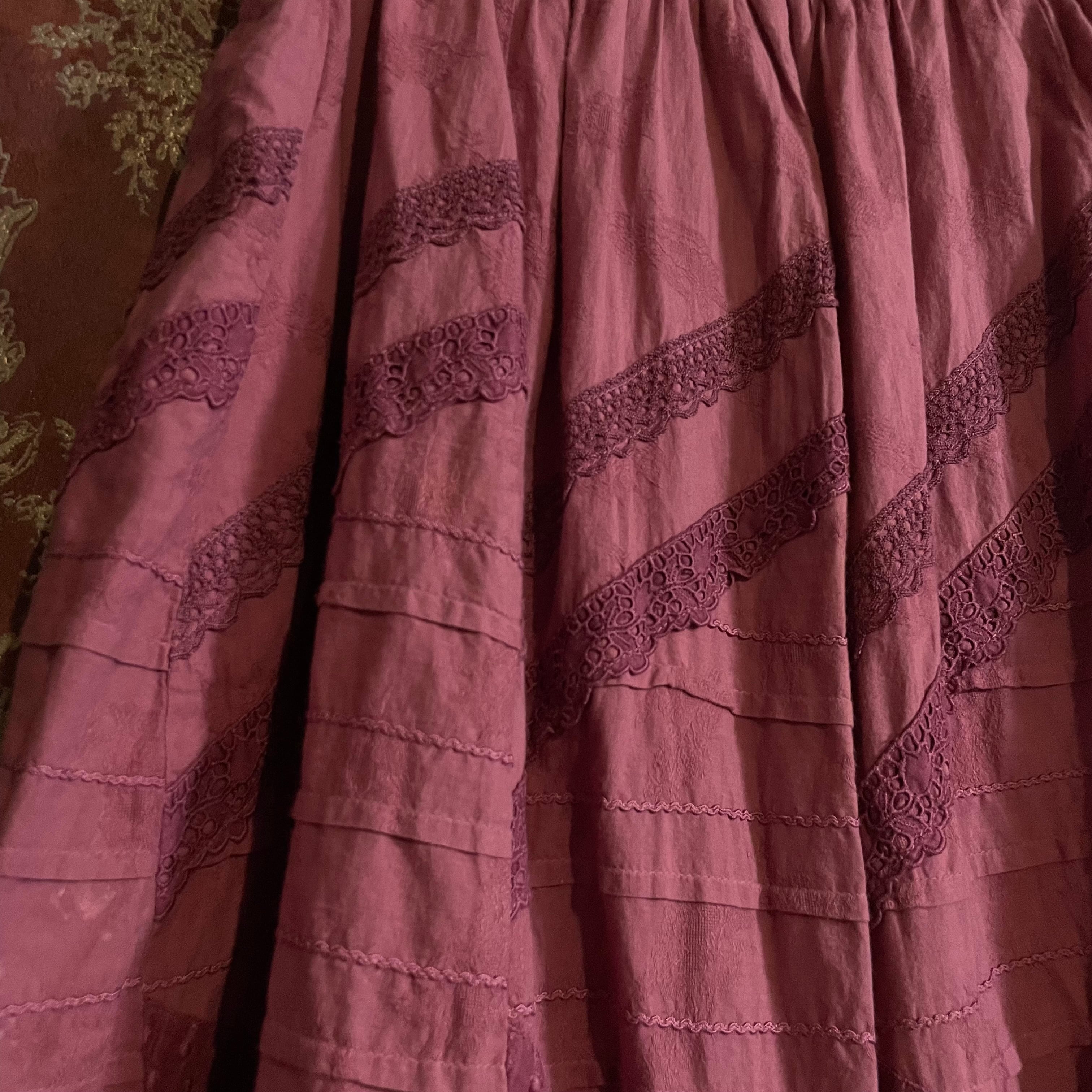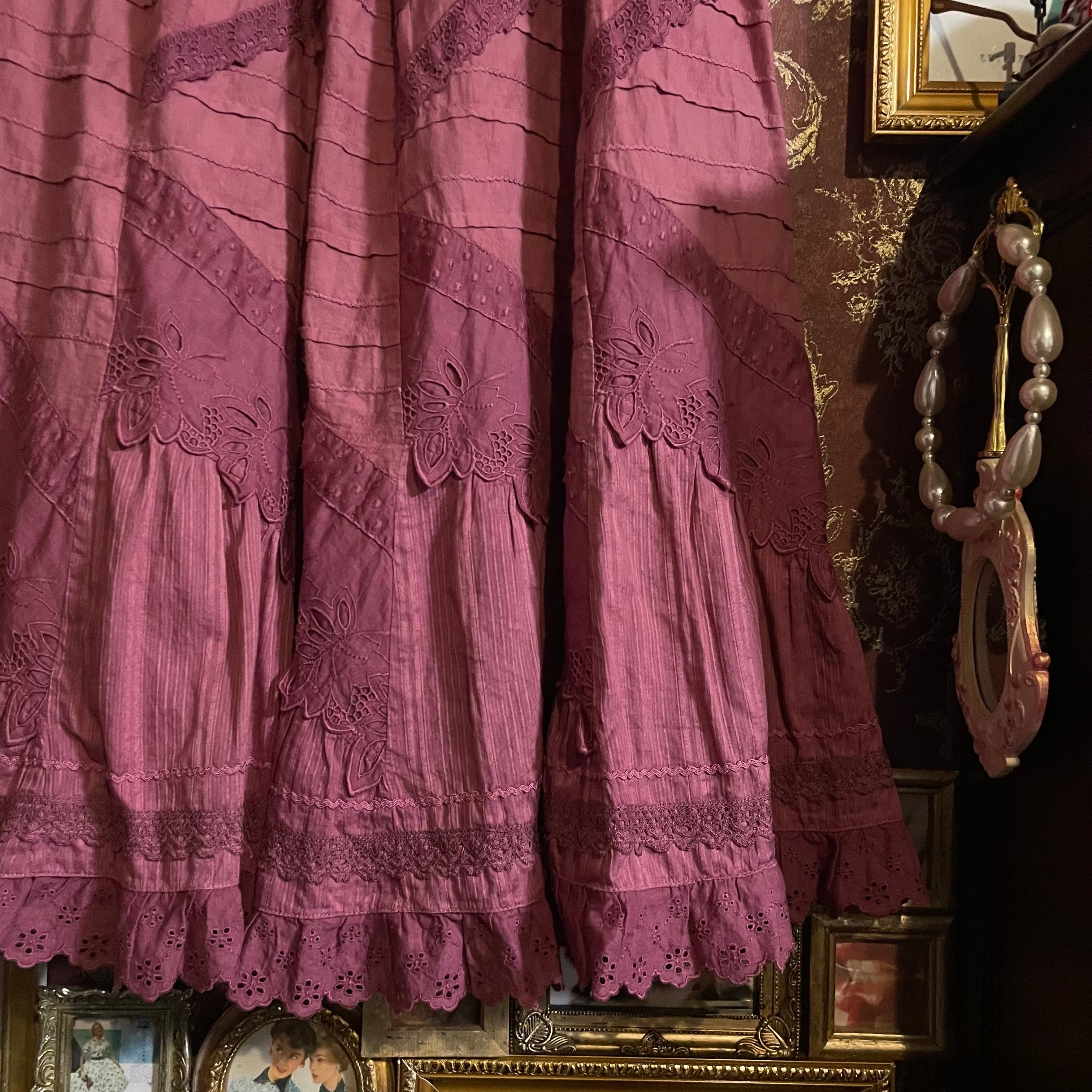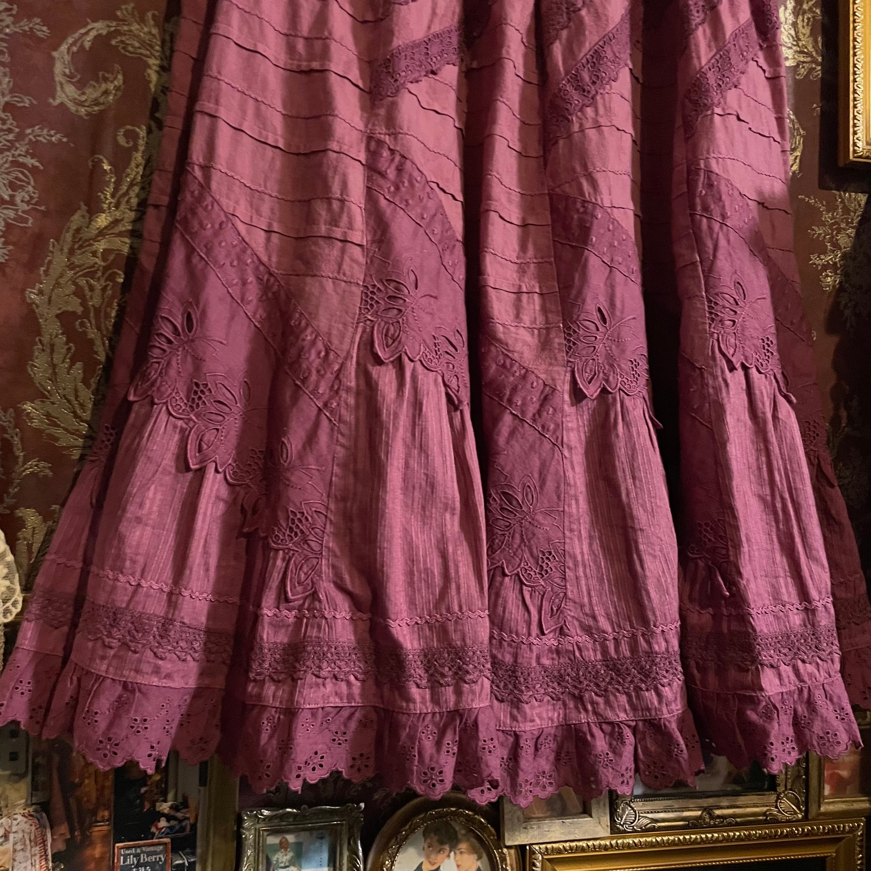 深みのあるパープルピンク(#803b5c)が目を惹く、びーどろぽえむの手染めスカートです。