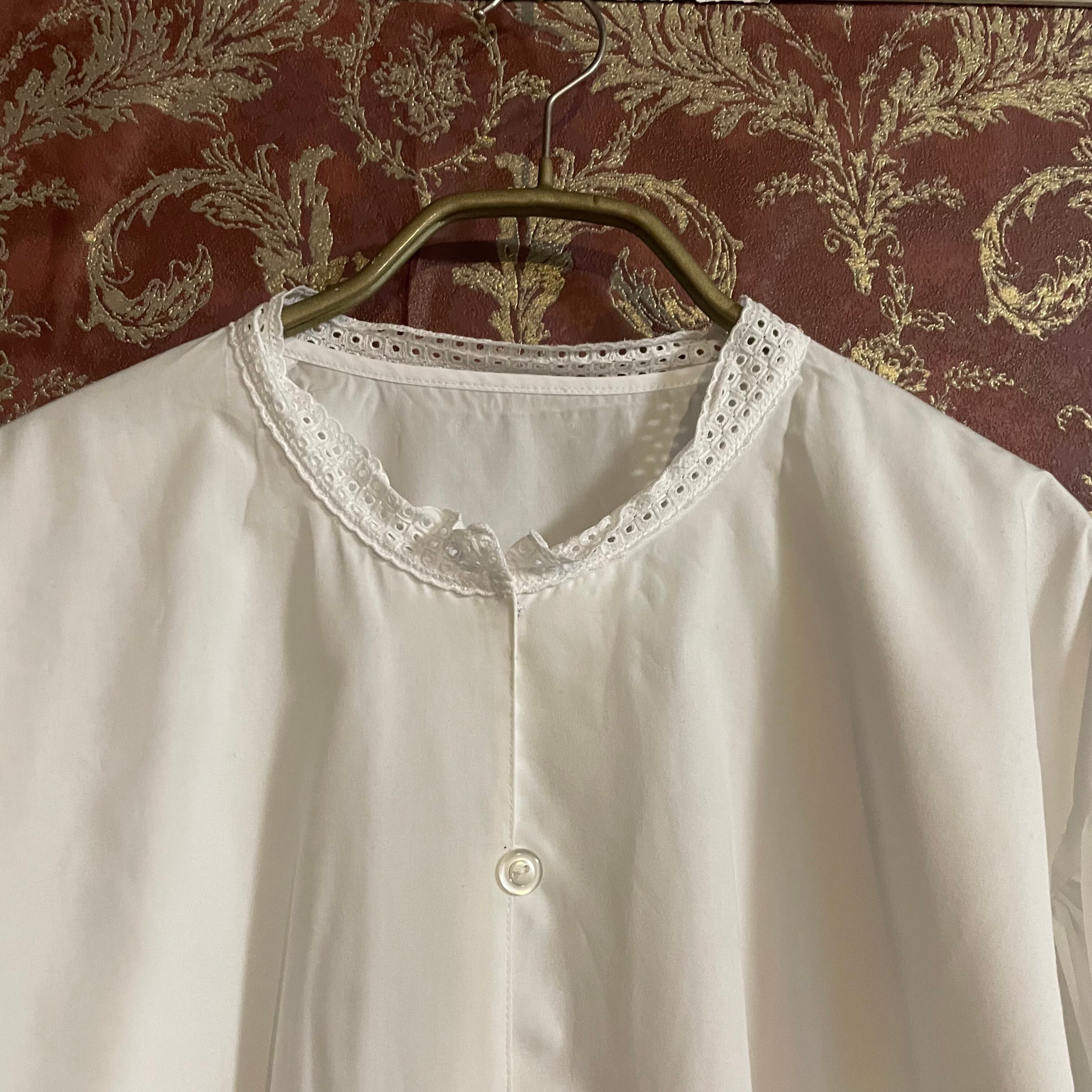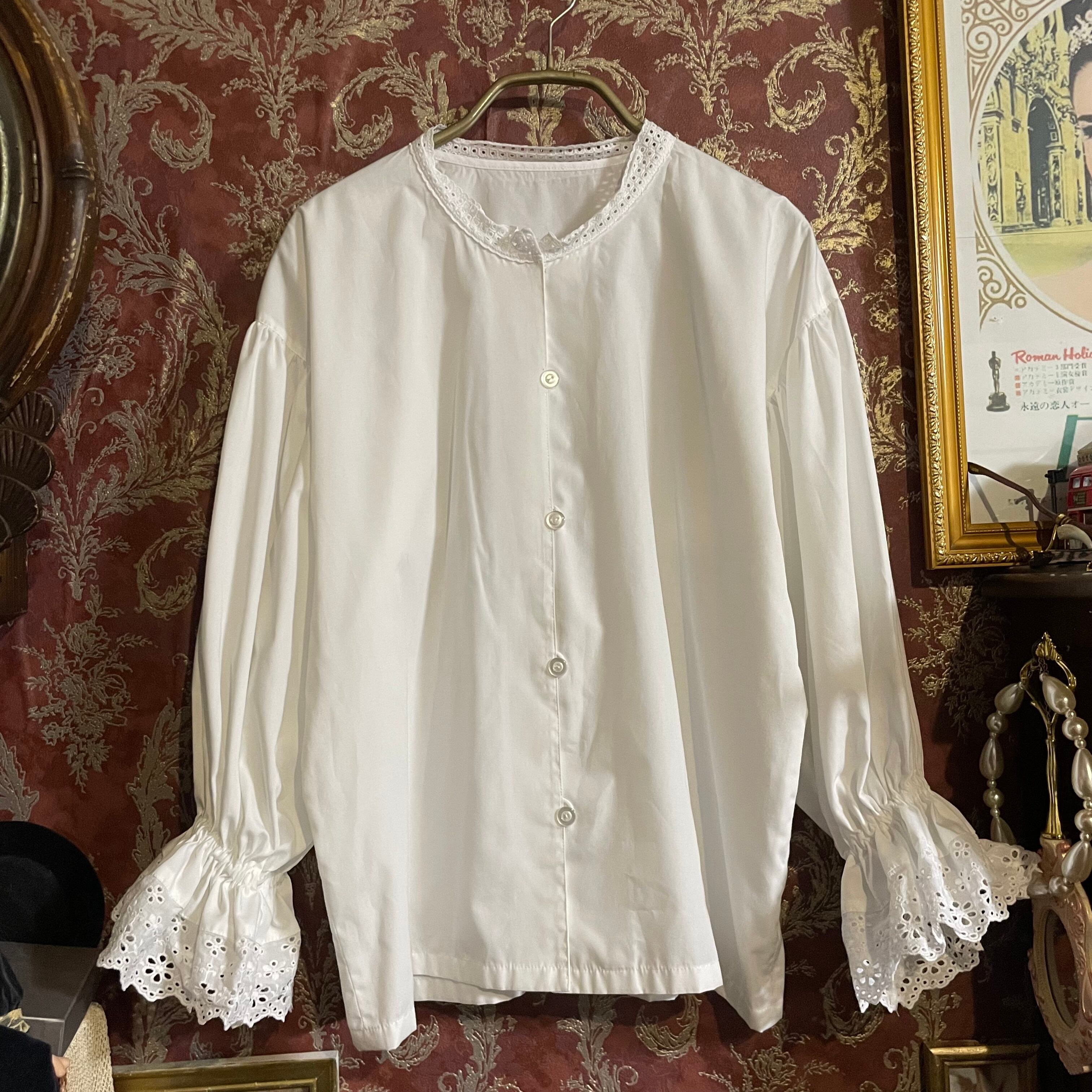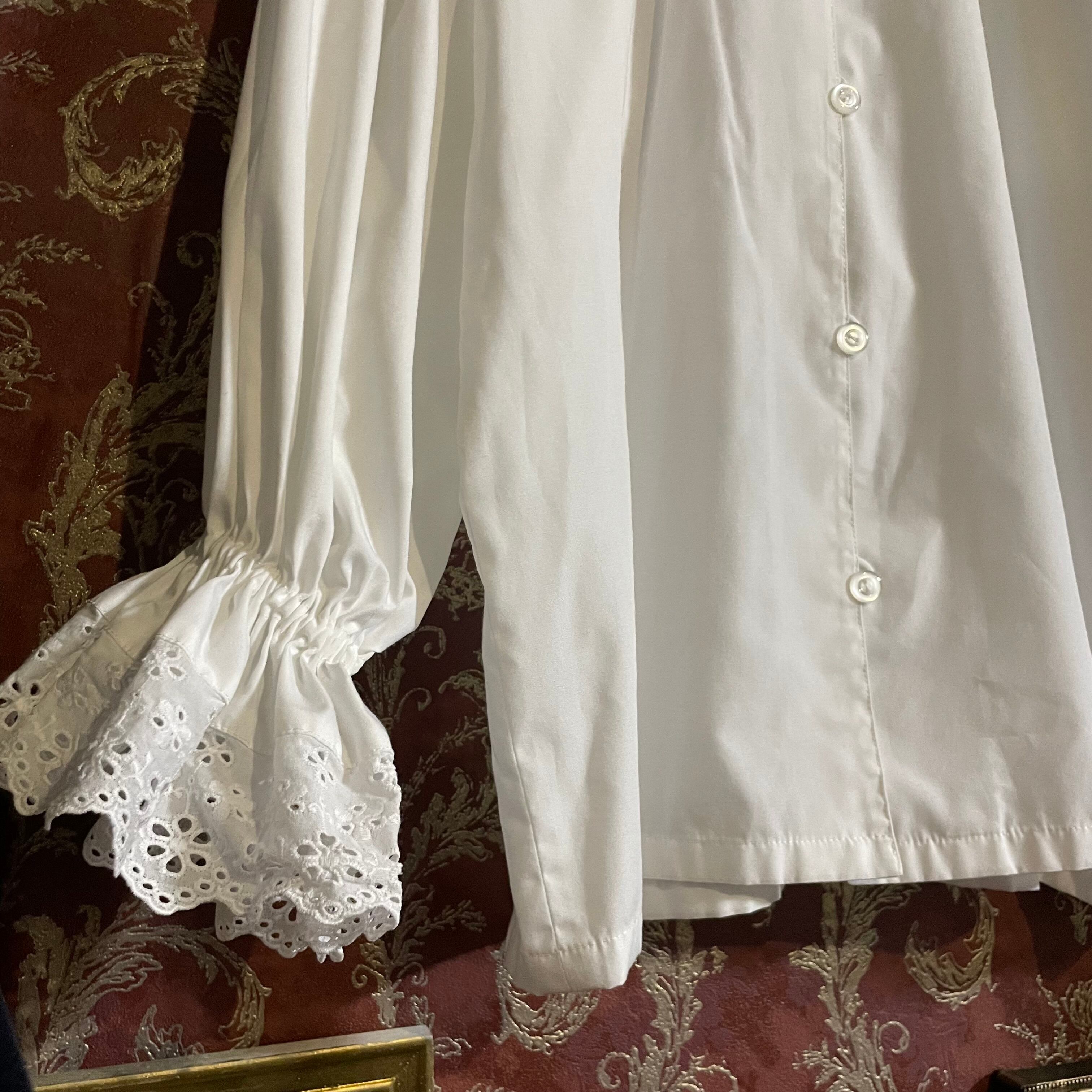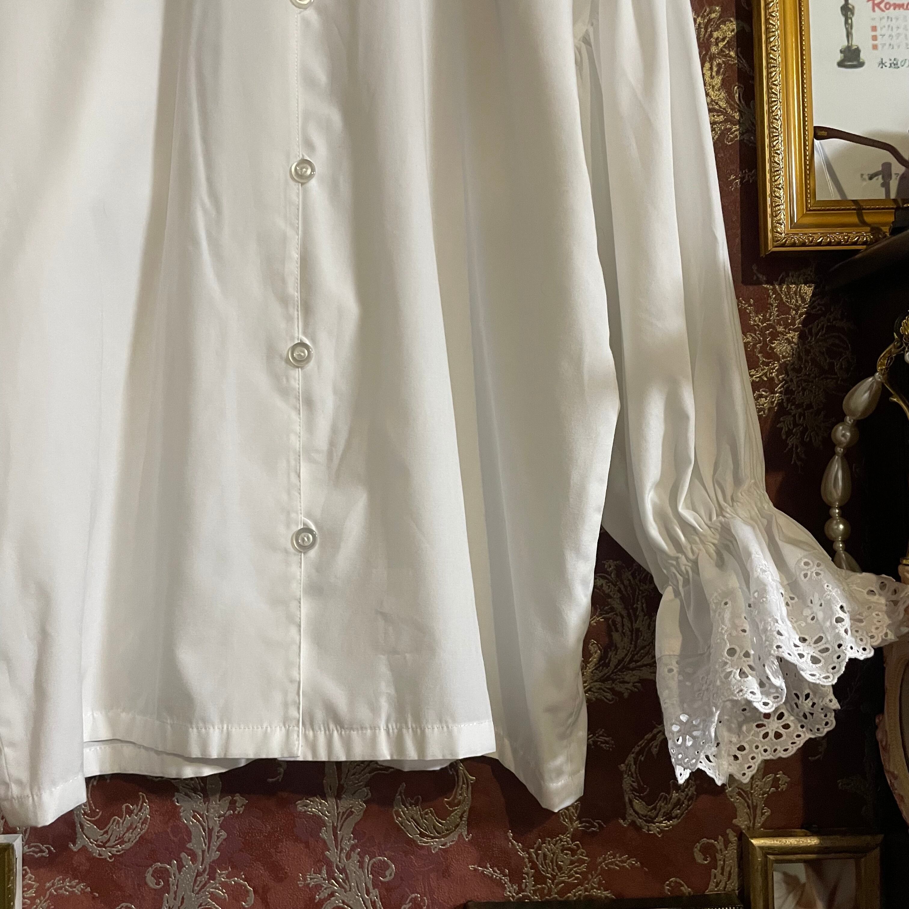 首元には繊細なレーストリム、袖口にはカットワークレースが贅沢にあしらわれ、手元を華やかに演出します。