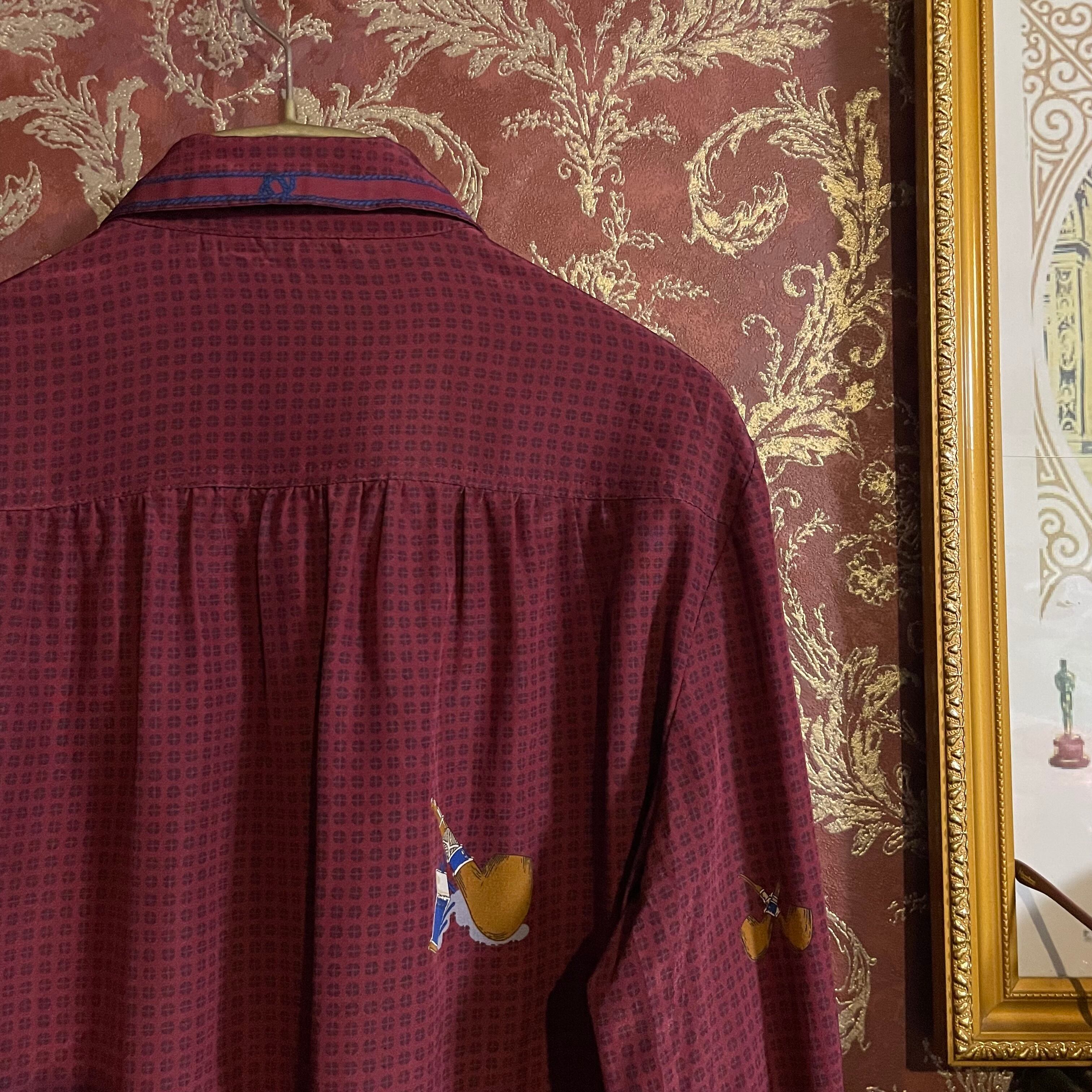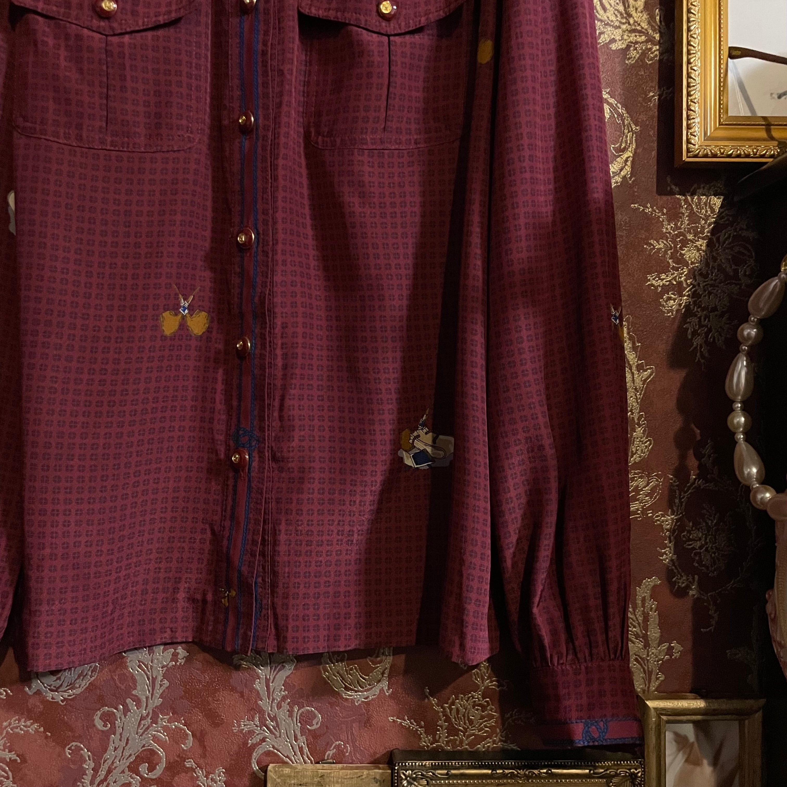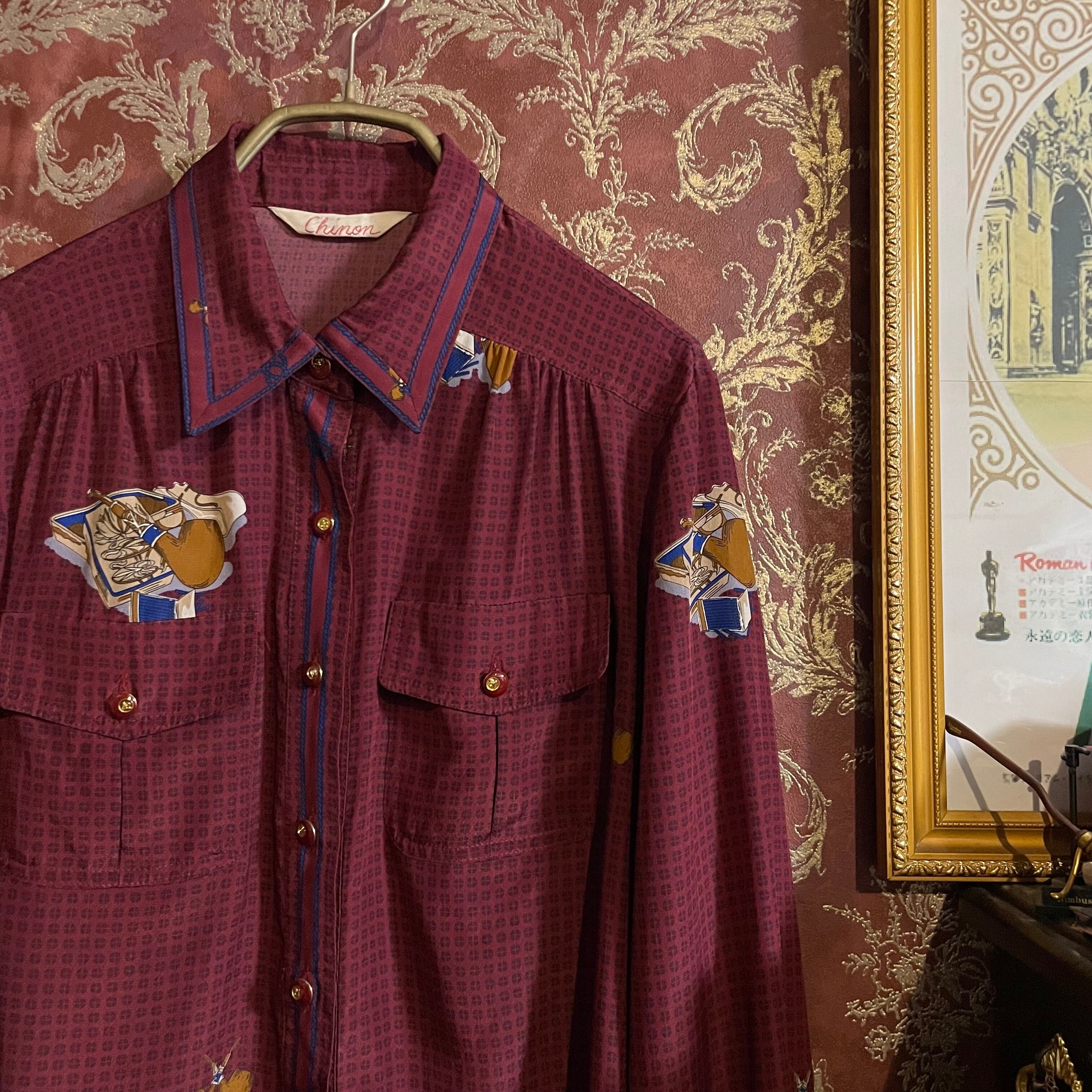 深みのあるワインレッドをベースに、クラシックなタバコパイプのモチーフが散りばめられたユニークなブラウスです。