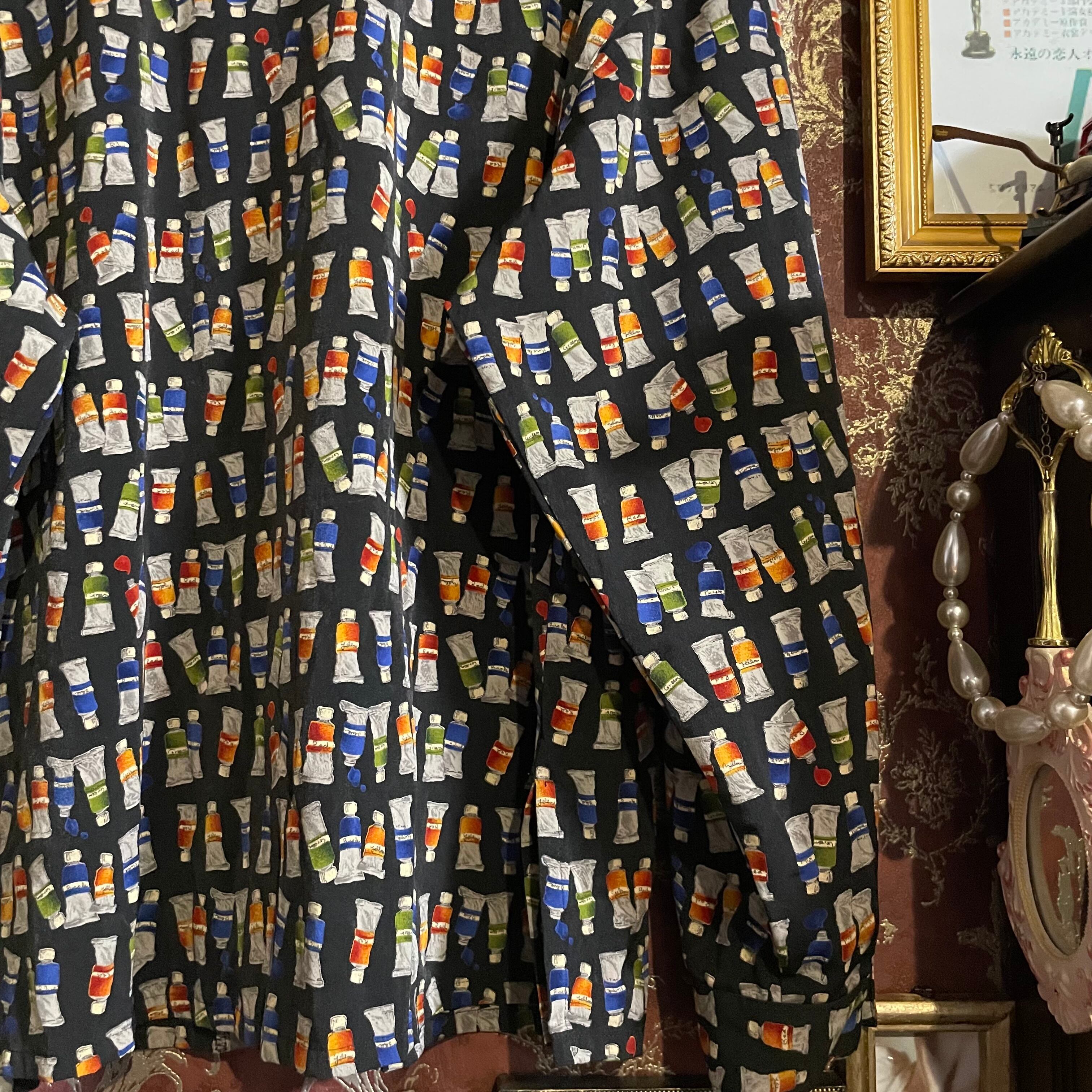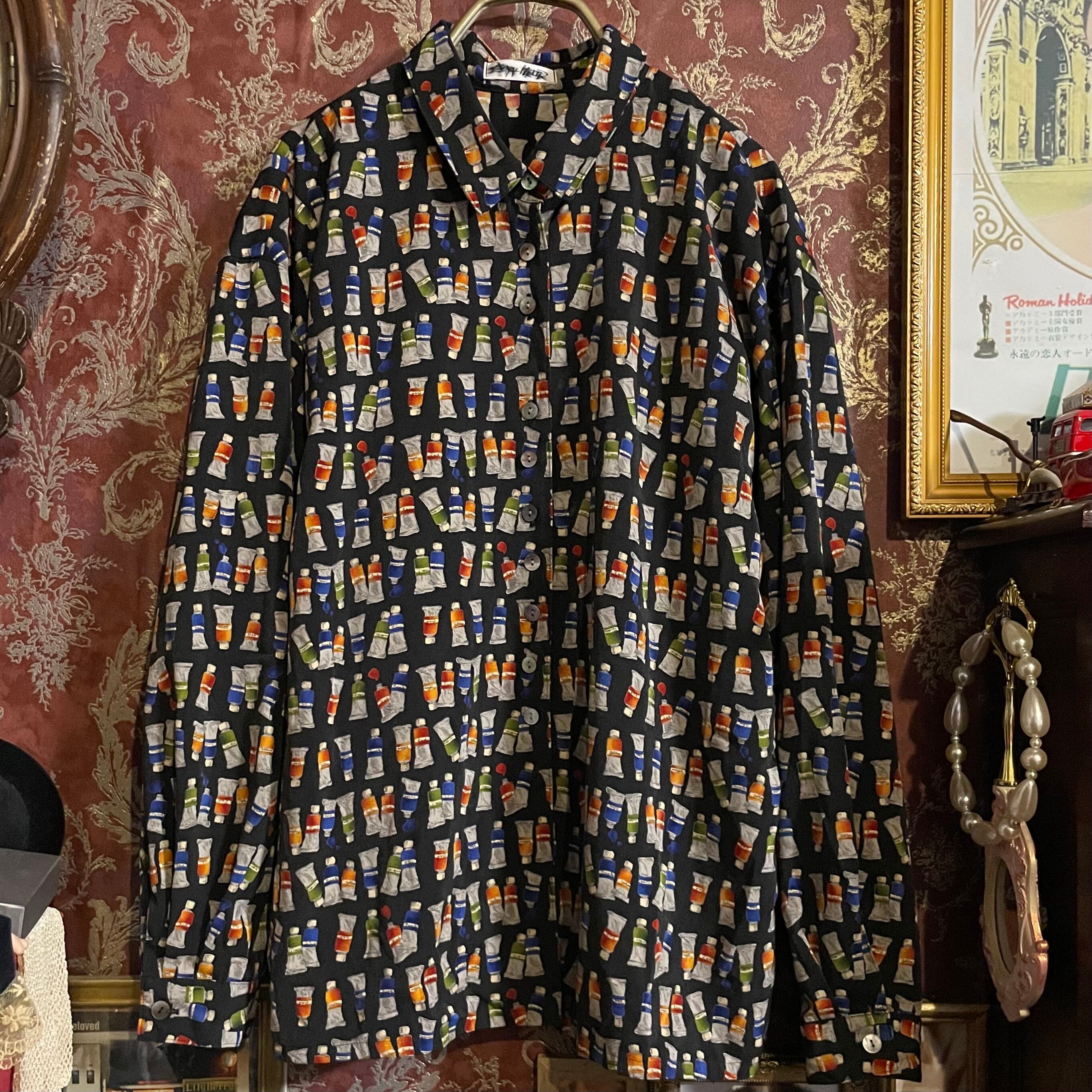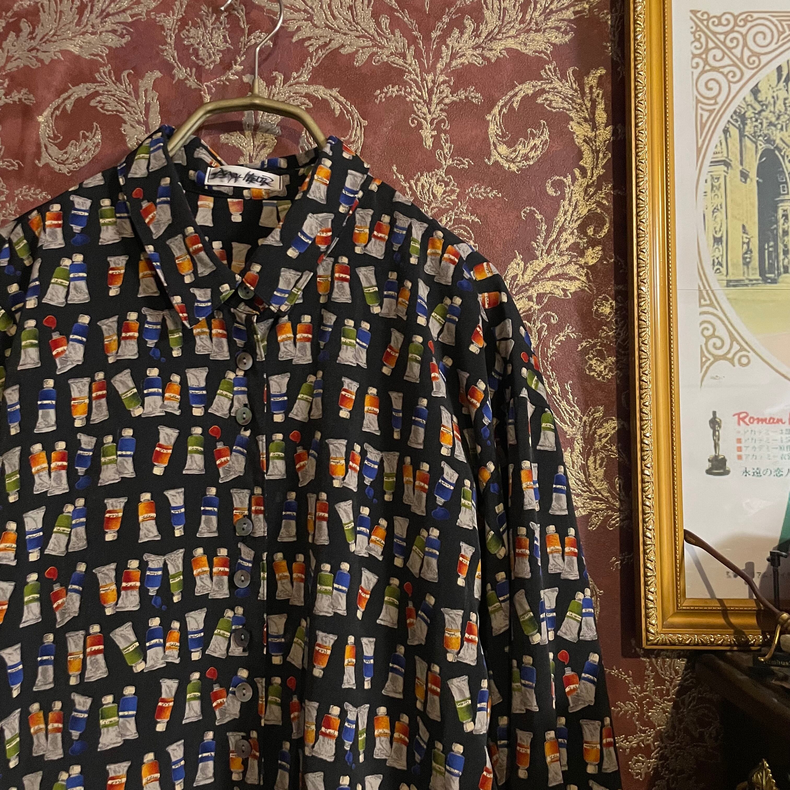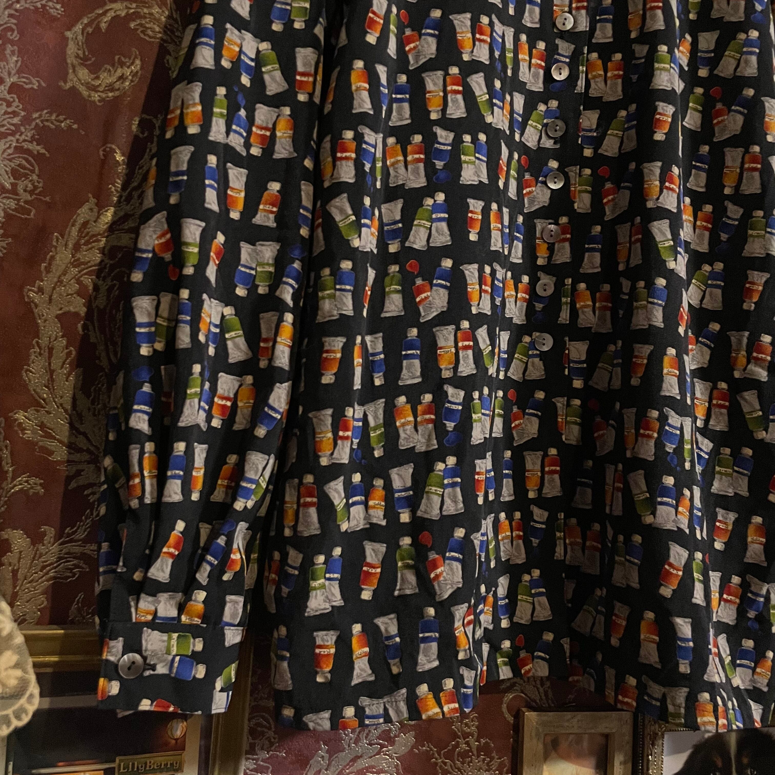 黒に近い紺にカラフルな絵の具チューブが並んだ、遊び心あふれるプリントシャツです。