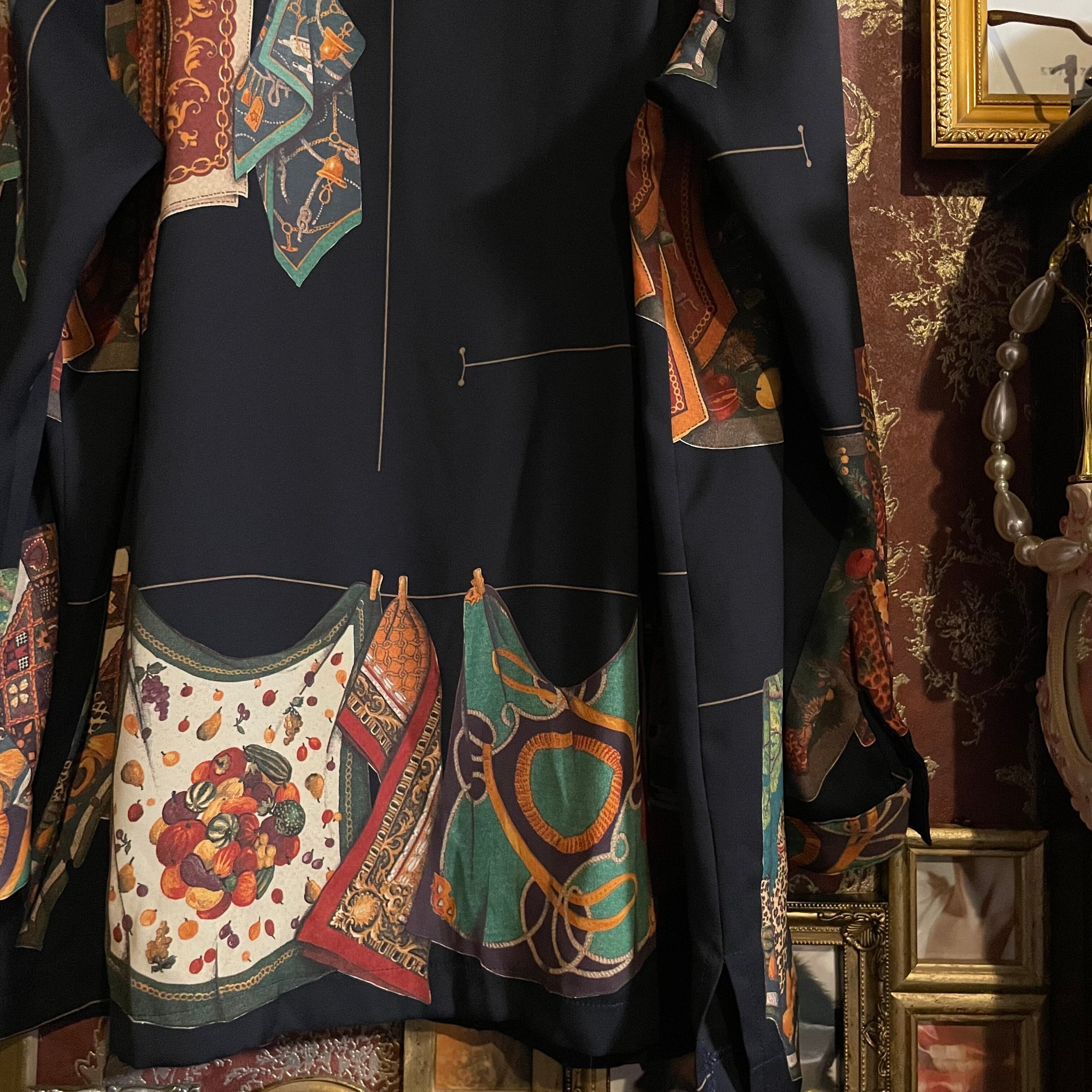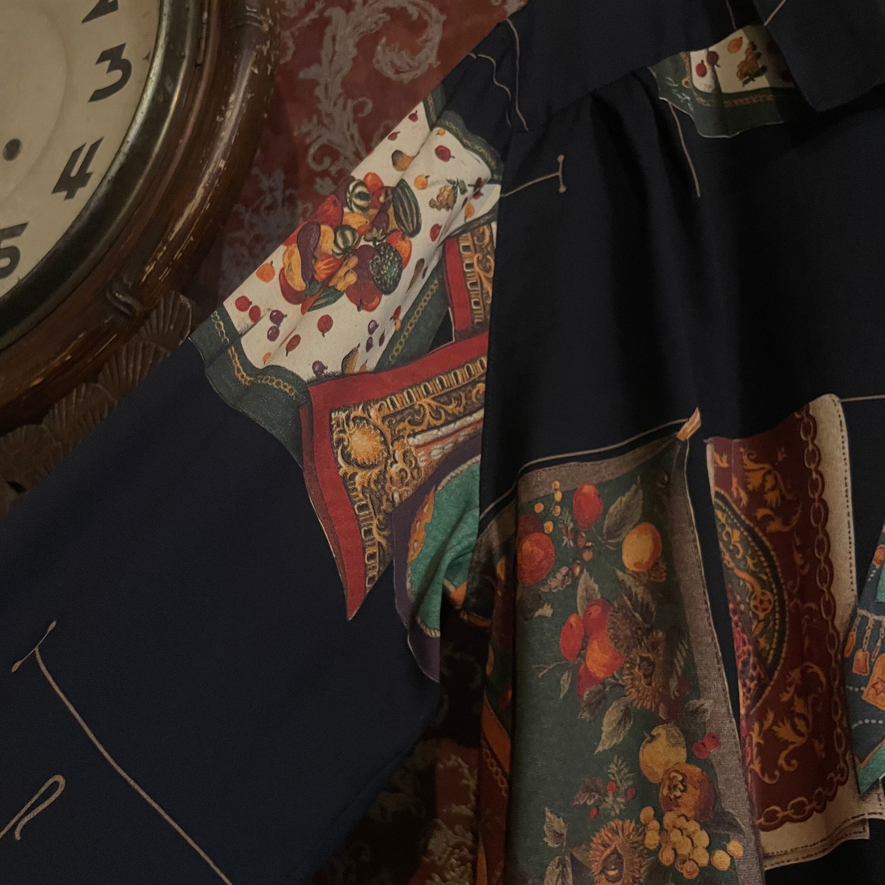 深みのあるネイビーカラーをベースに、鮮やかなスカーフモチーフがデザインされたヴィンテージブラウスです。