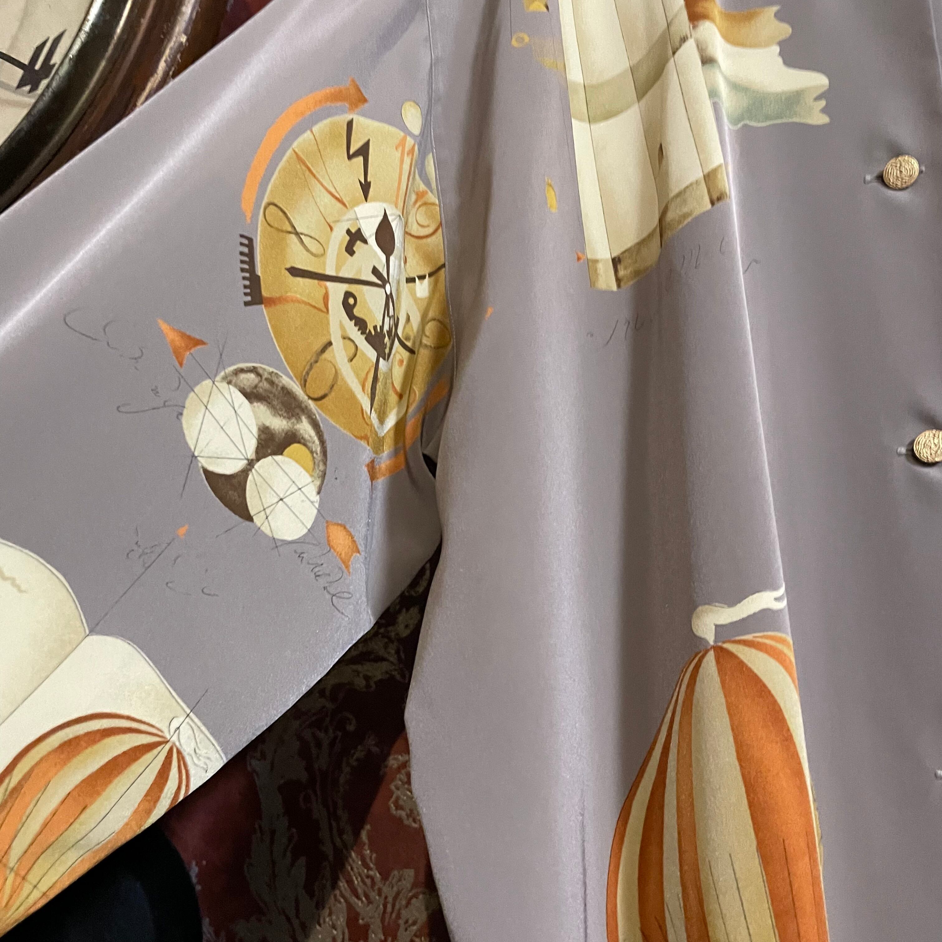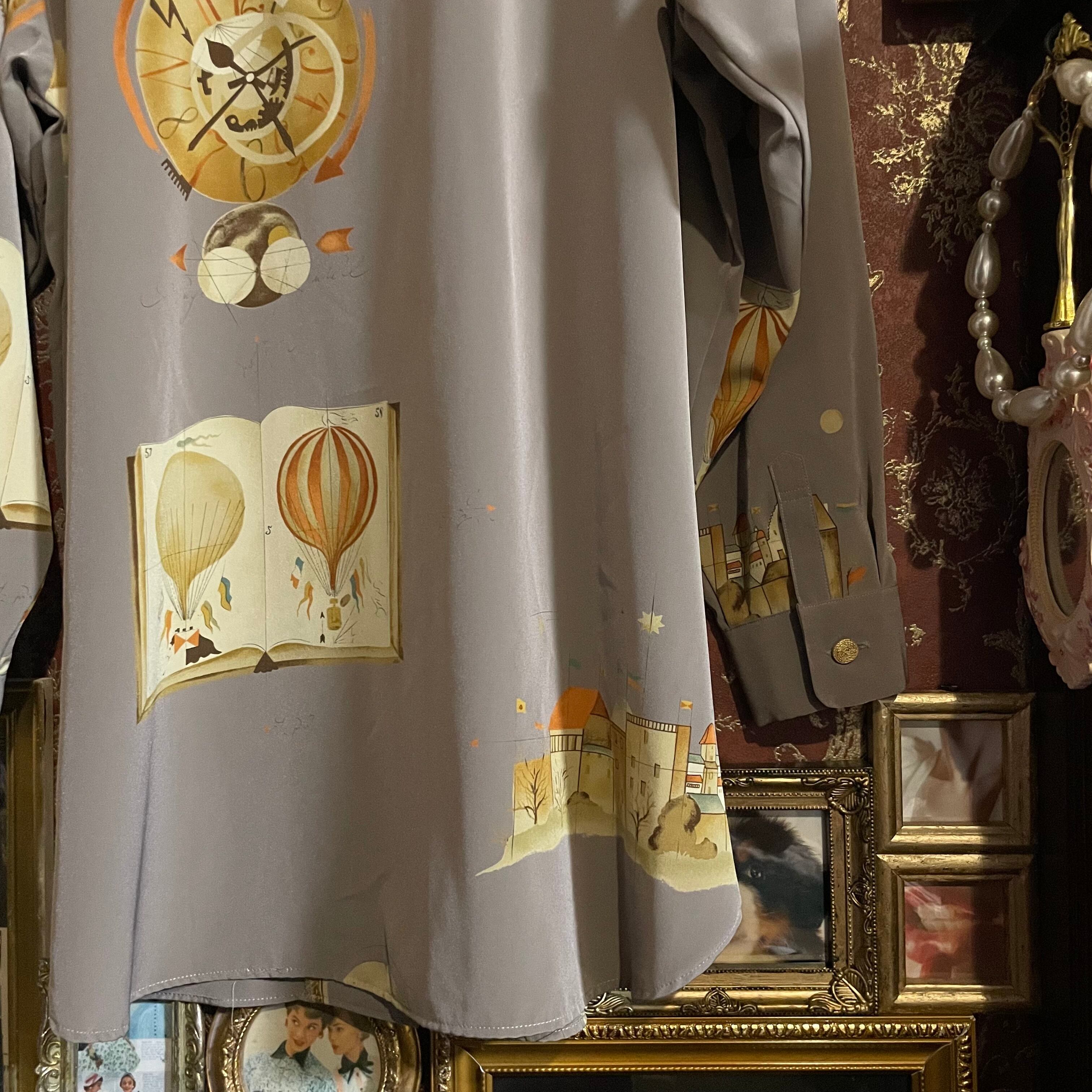 やわらかなグレーをベースに、気球や灯台、時計、テーブルが描かれたロマンあふれる一着です。