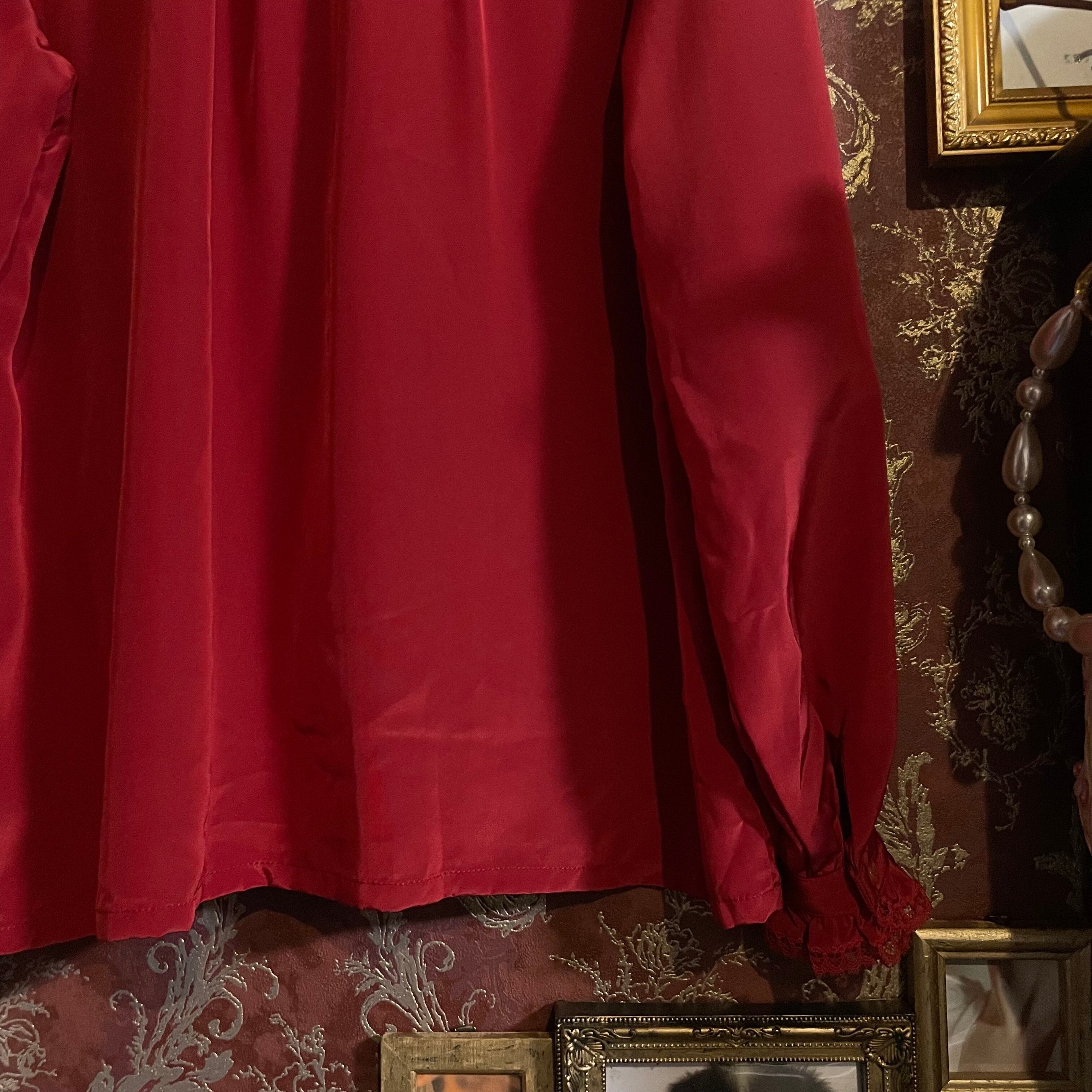 深みのあるボルドー(#a12235)が印象的な、クラシカルなフリルブラウスです。