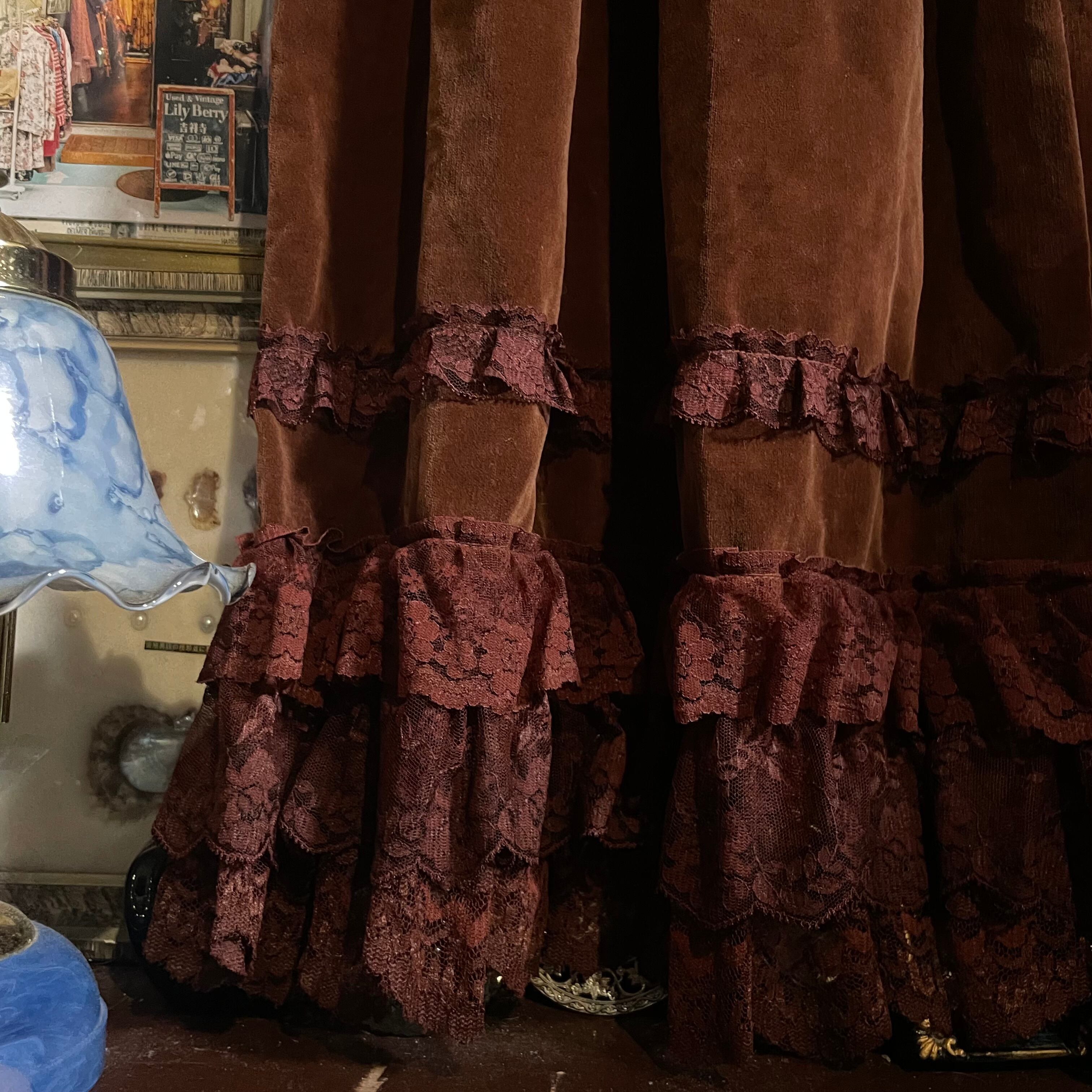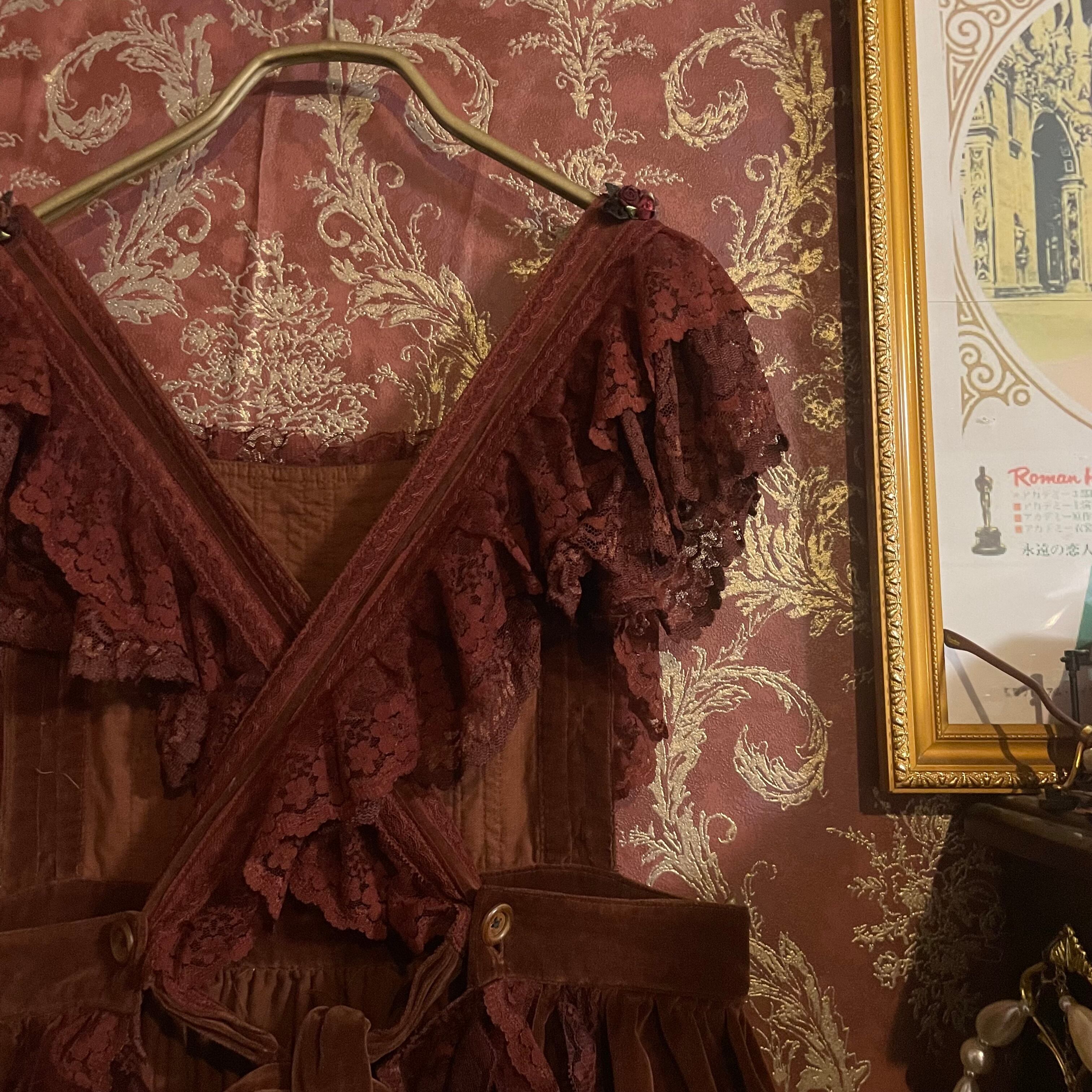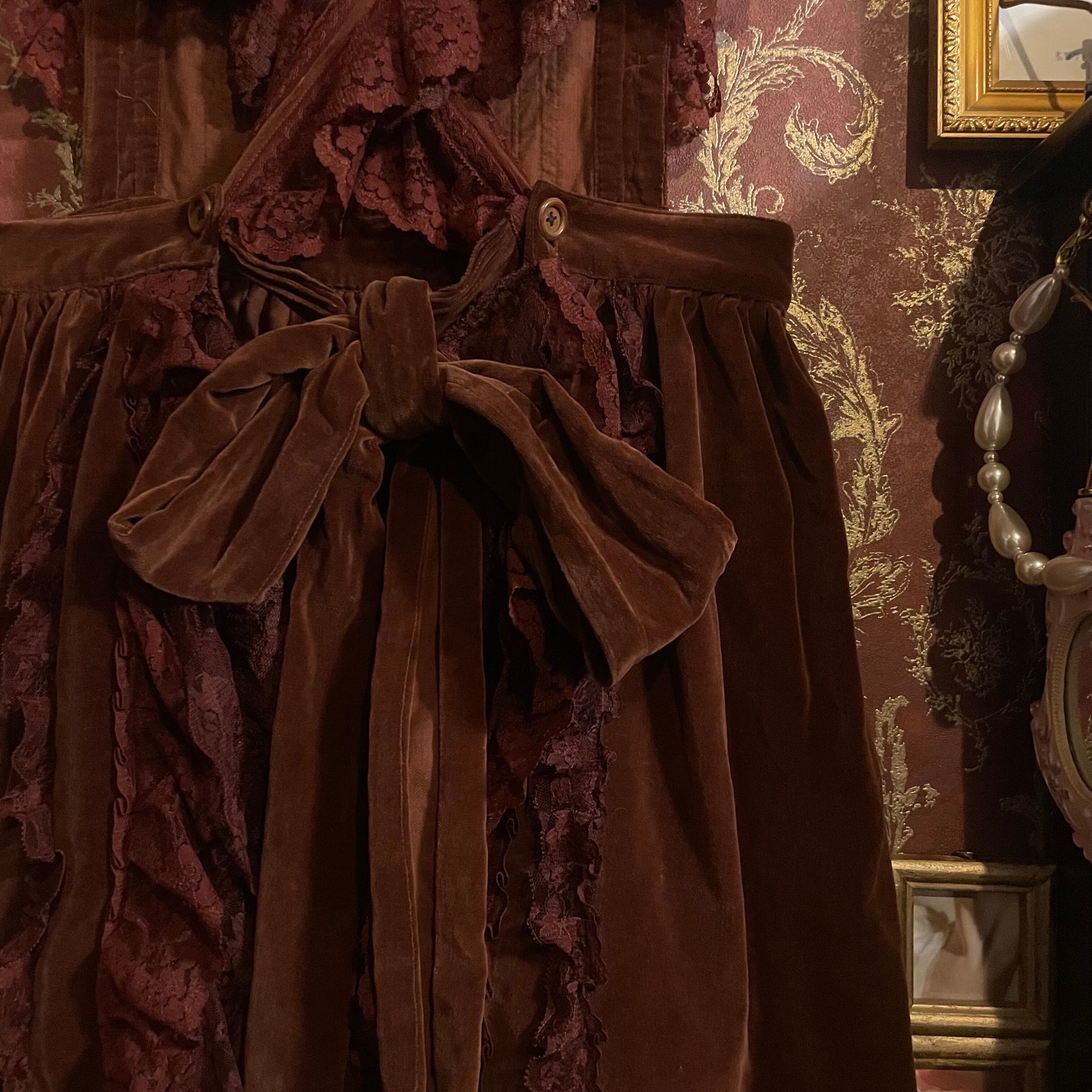 重厚感のあるベルベットに繊細なレースをたっぷりとあしらった、クラシカルなワンピースです。