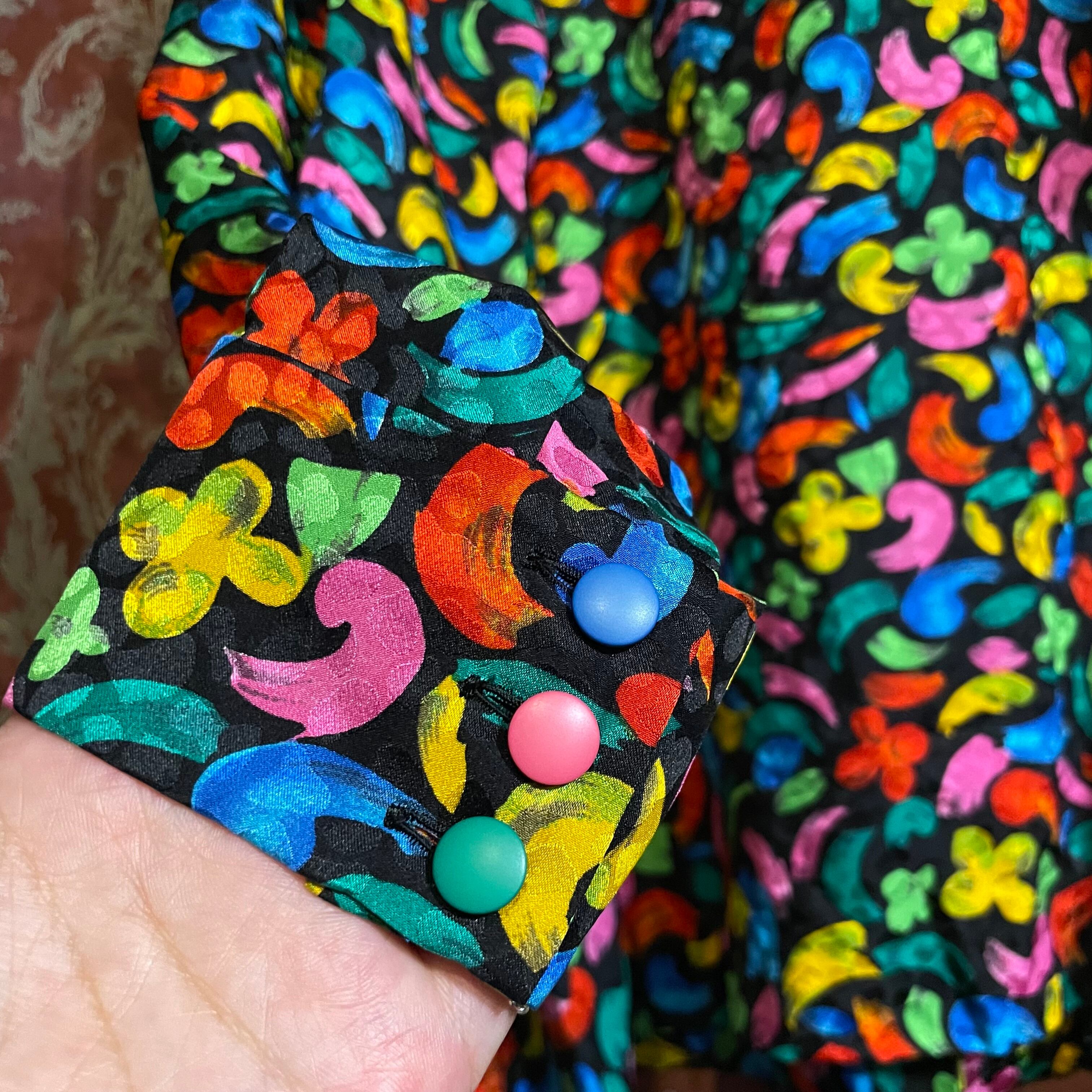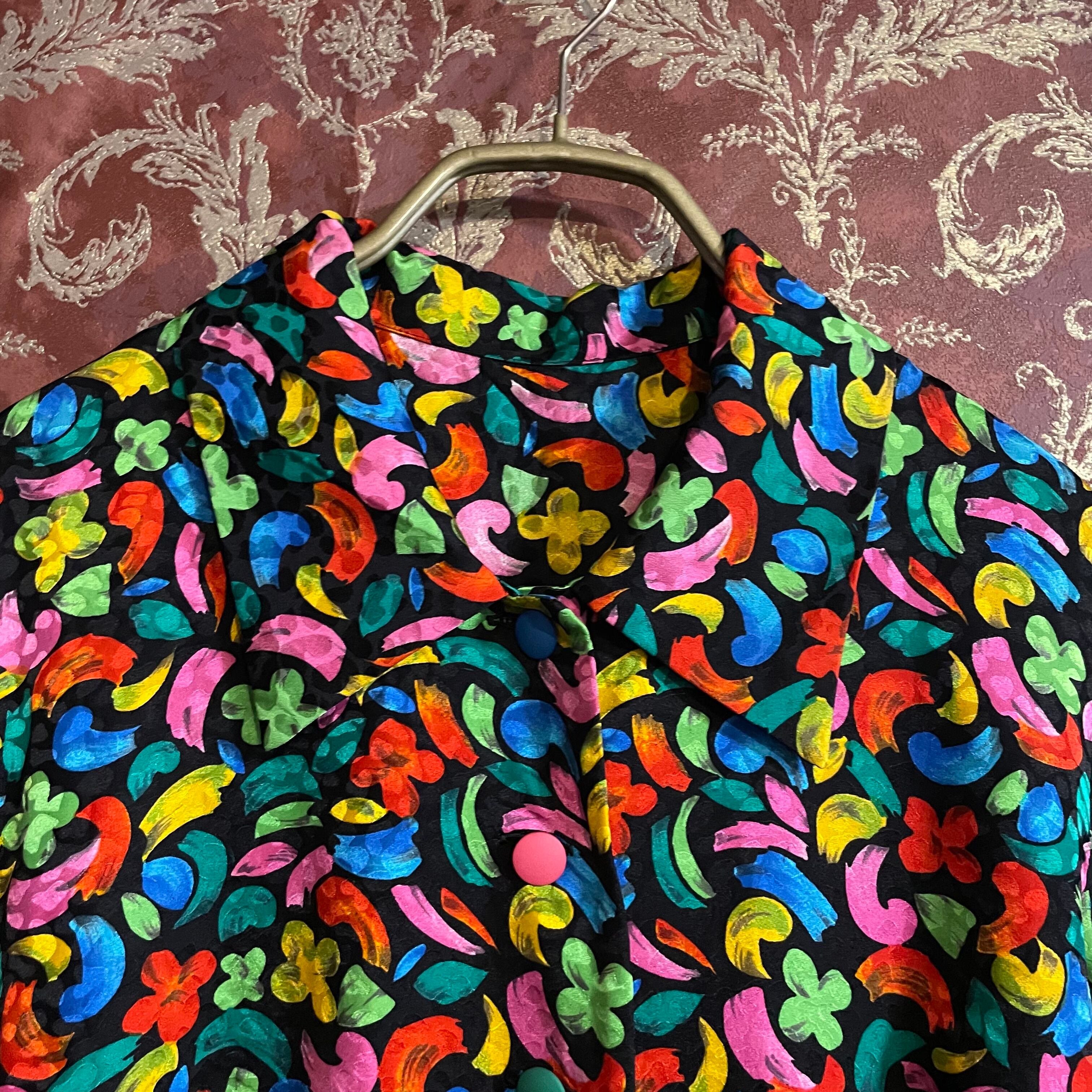 ビビッドなマルチカラーが目を惹く、総柄のヴィンテージシャツです。