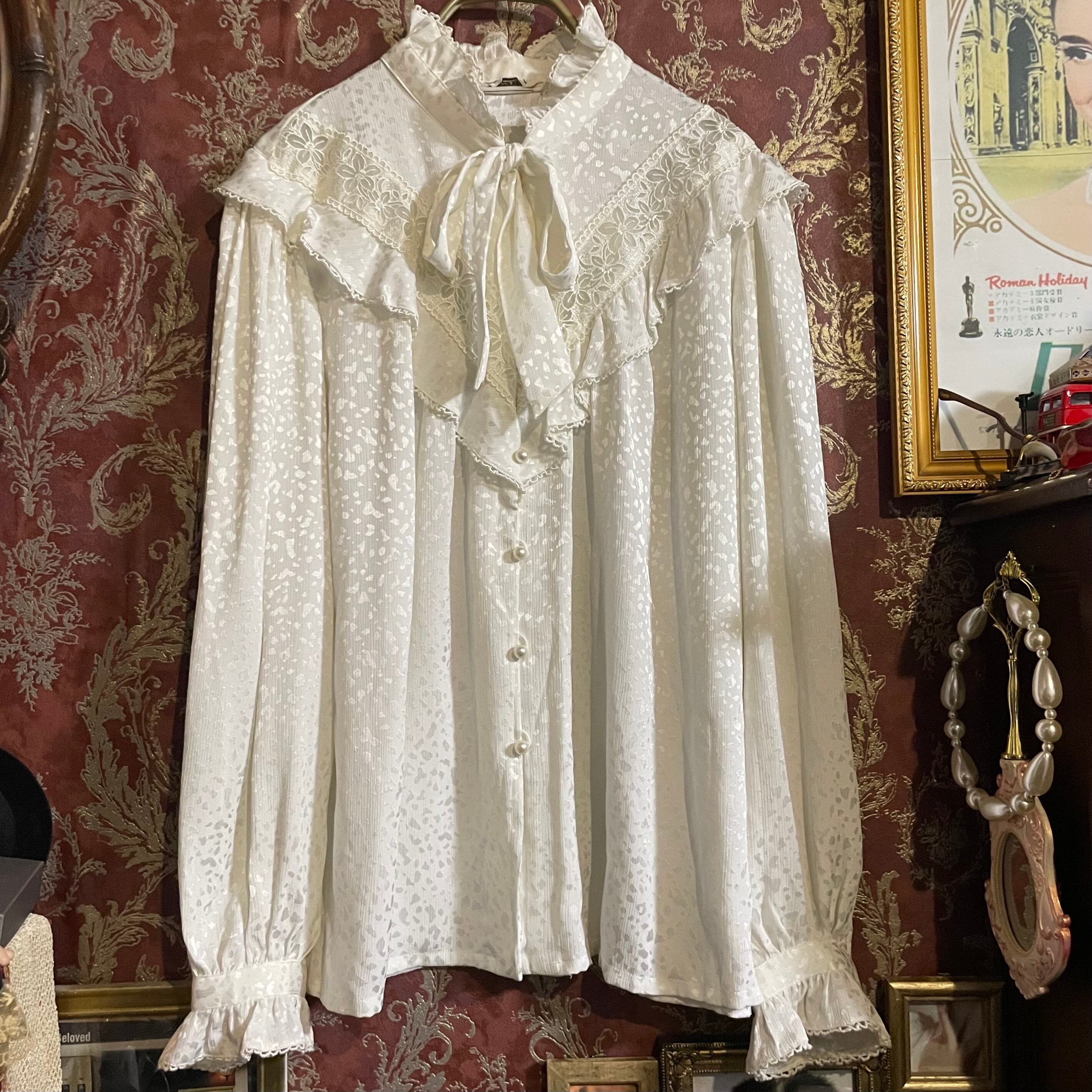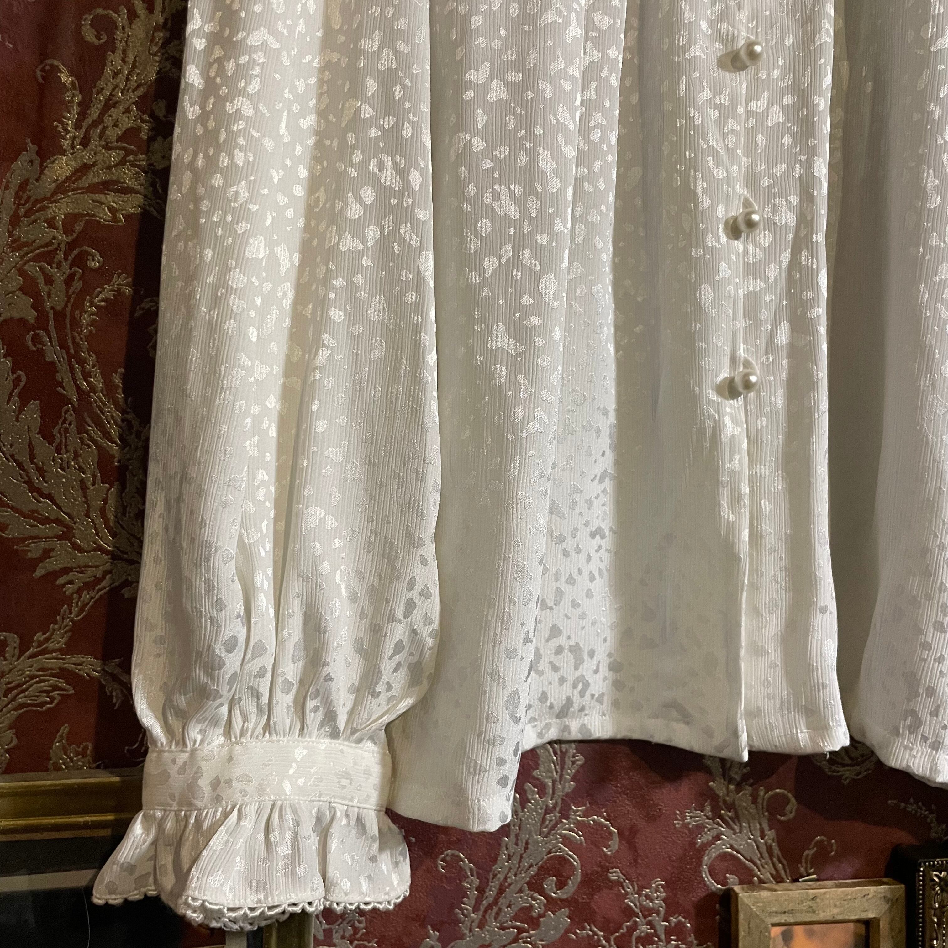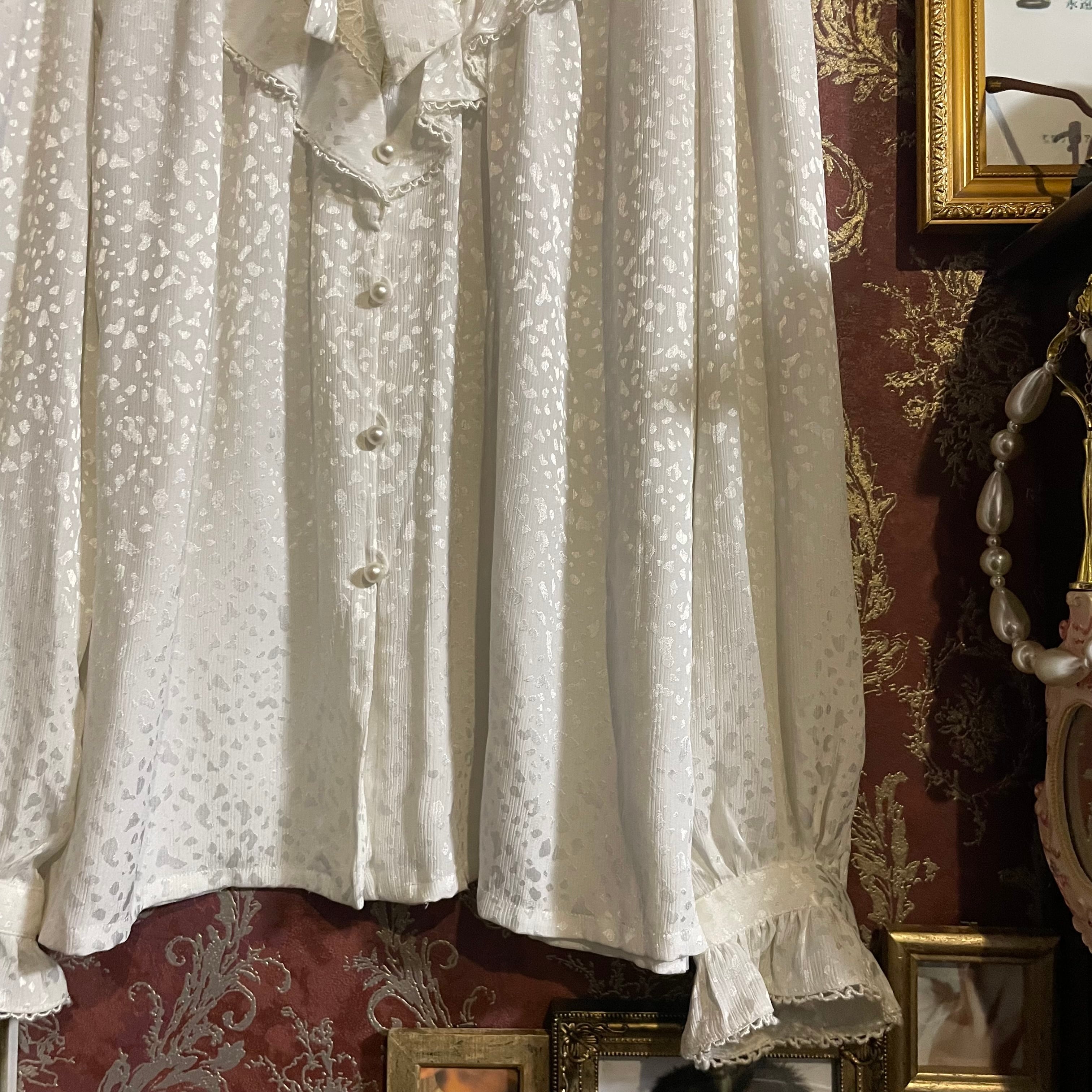 光沢のあるレオパード柄が浮かぶ、ヴィンテージらしいホワイトブラウスです。