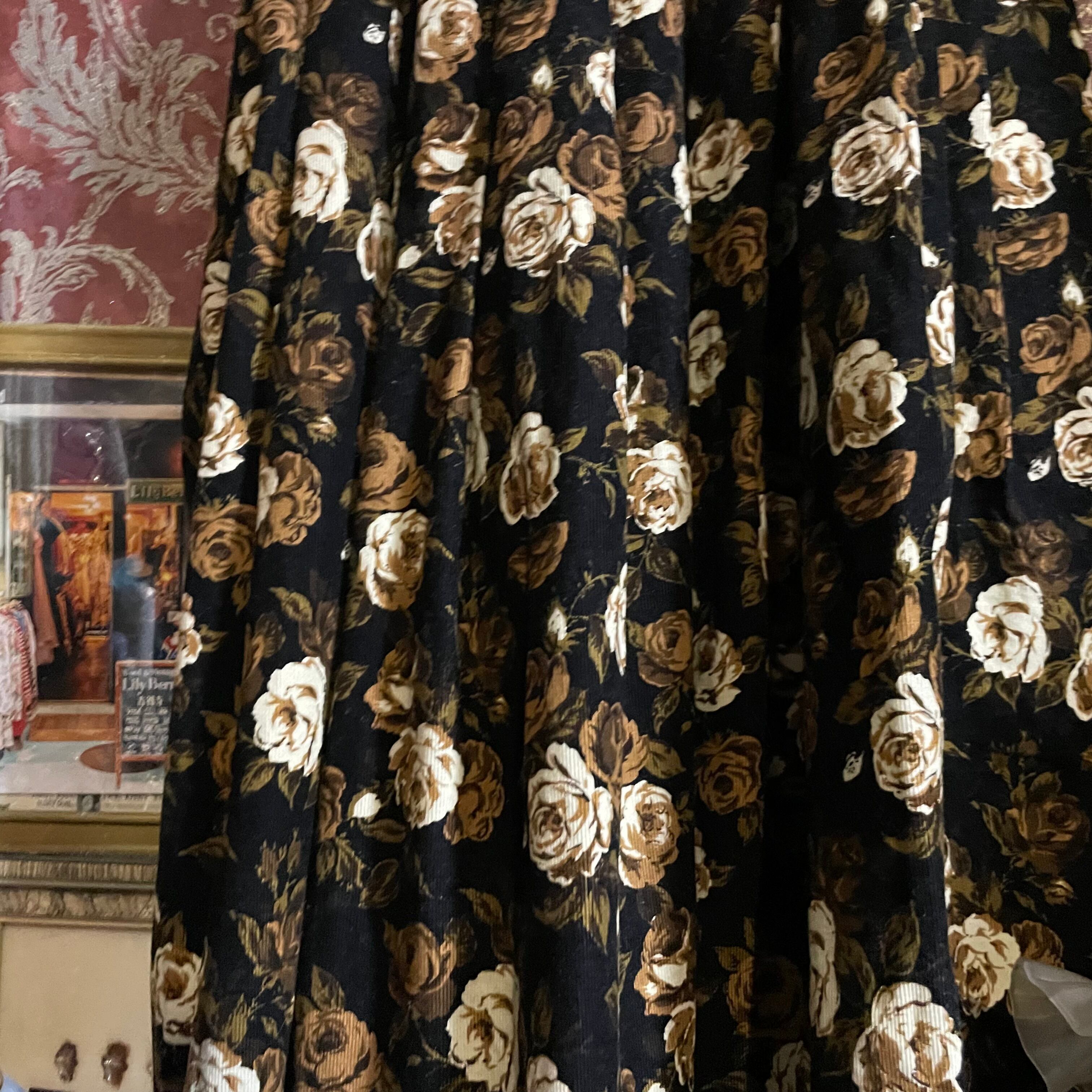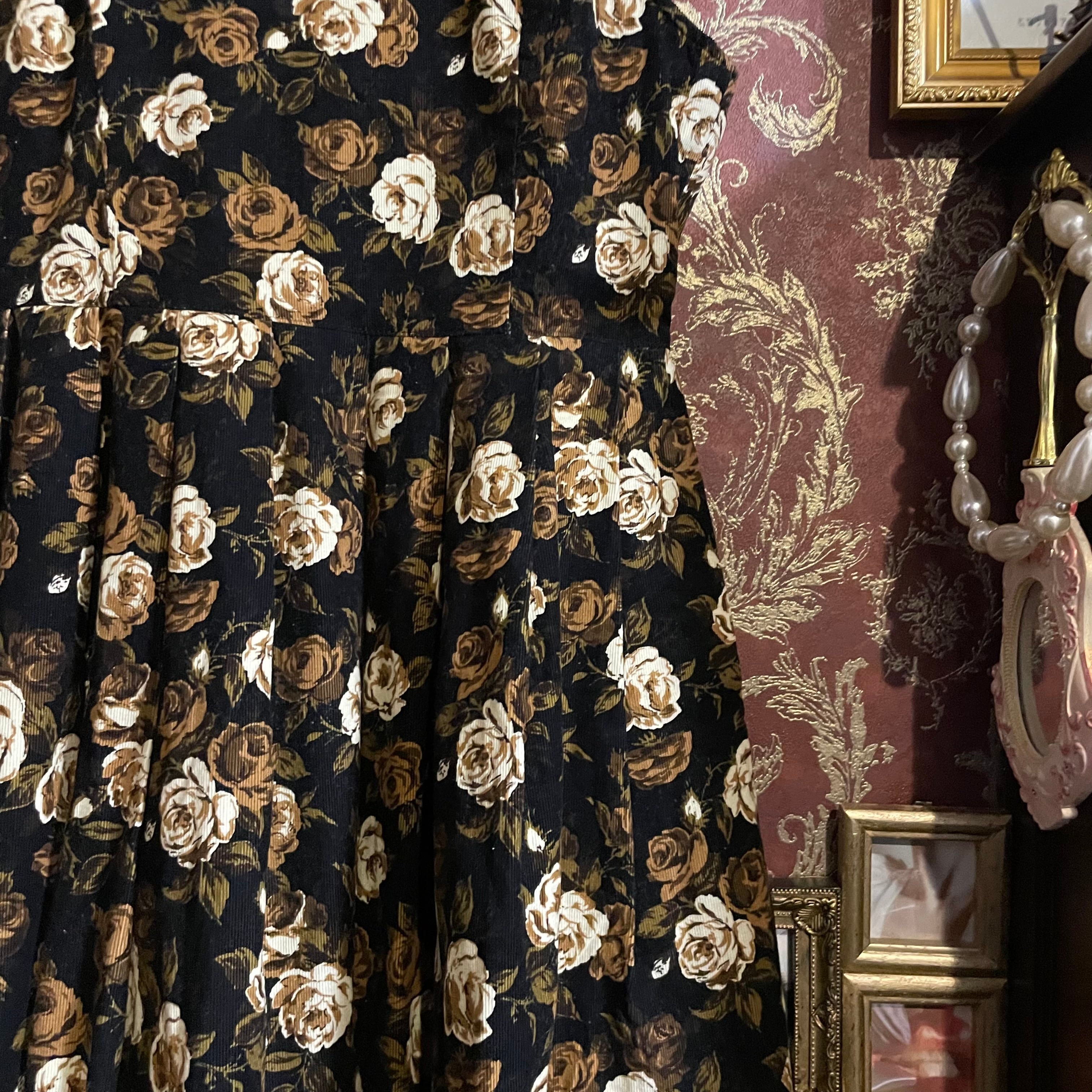 深みのあるブラック地に、アンティークな雰囲気漂うセピアカラーのローズ柄の可愛らしいジャンパースカートです。