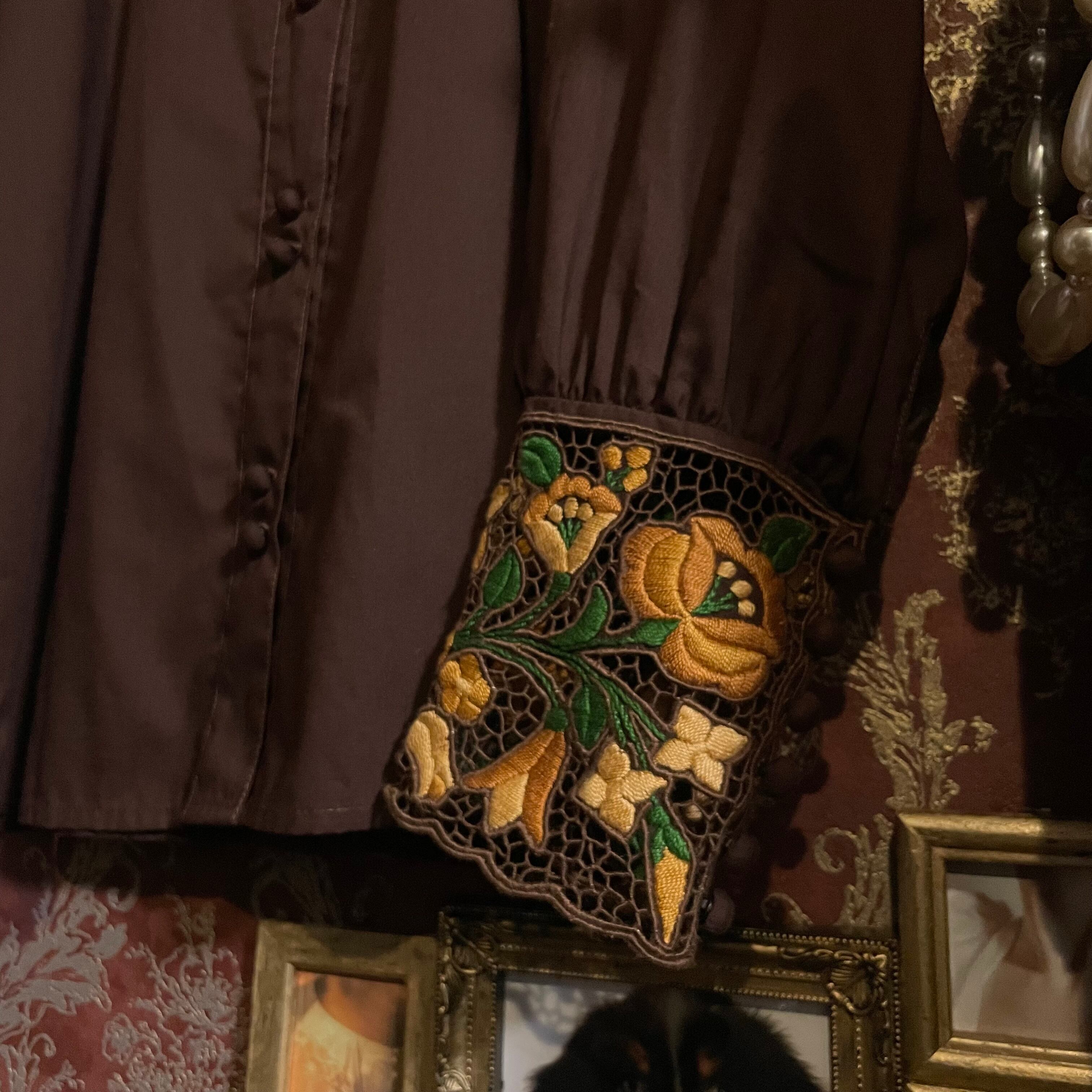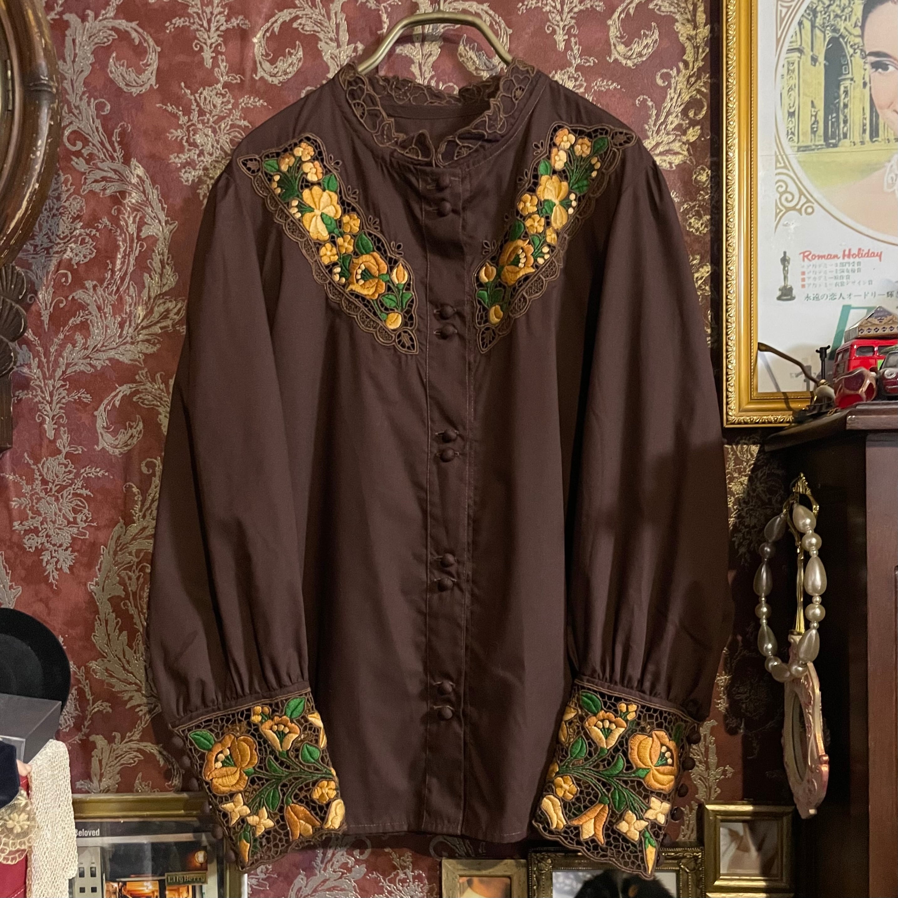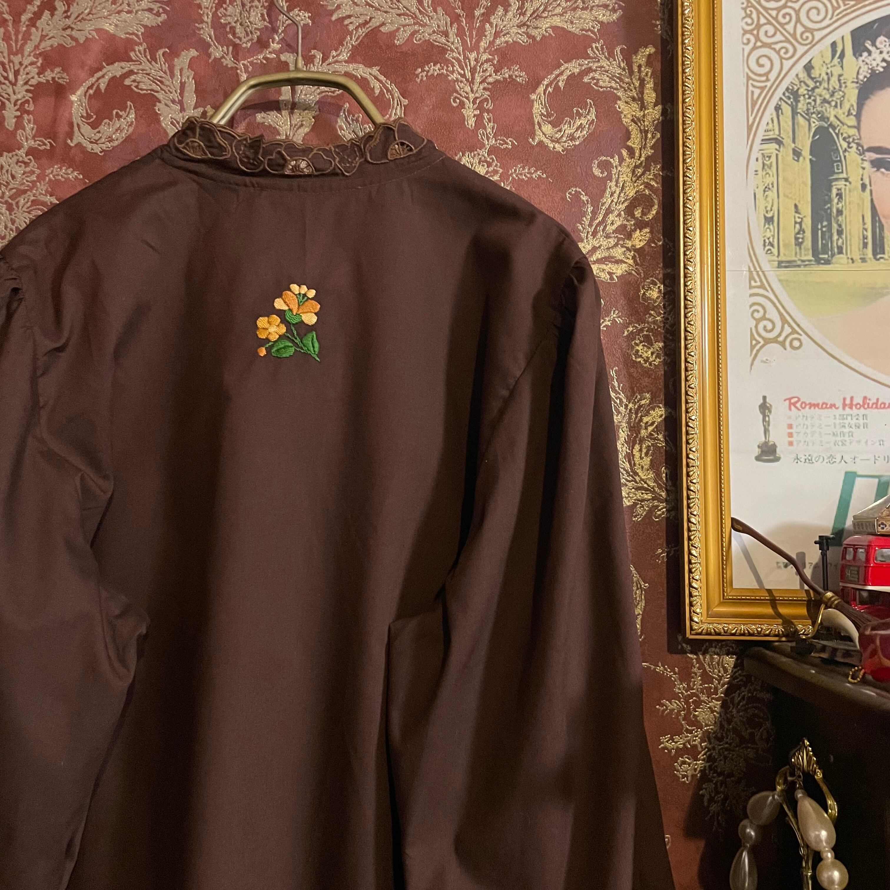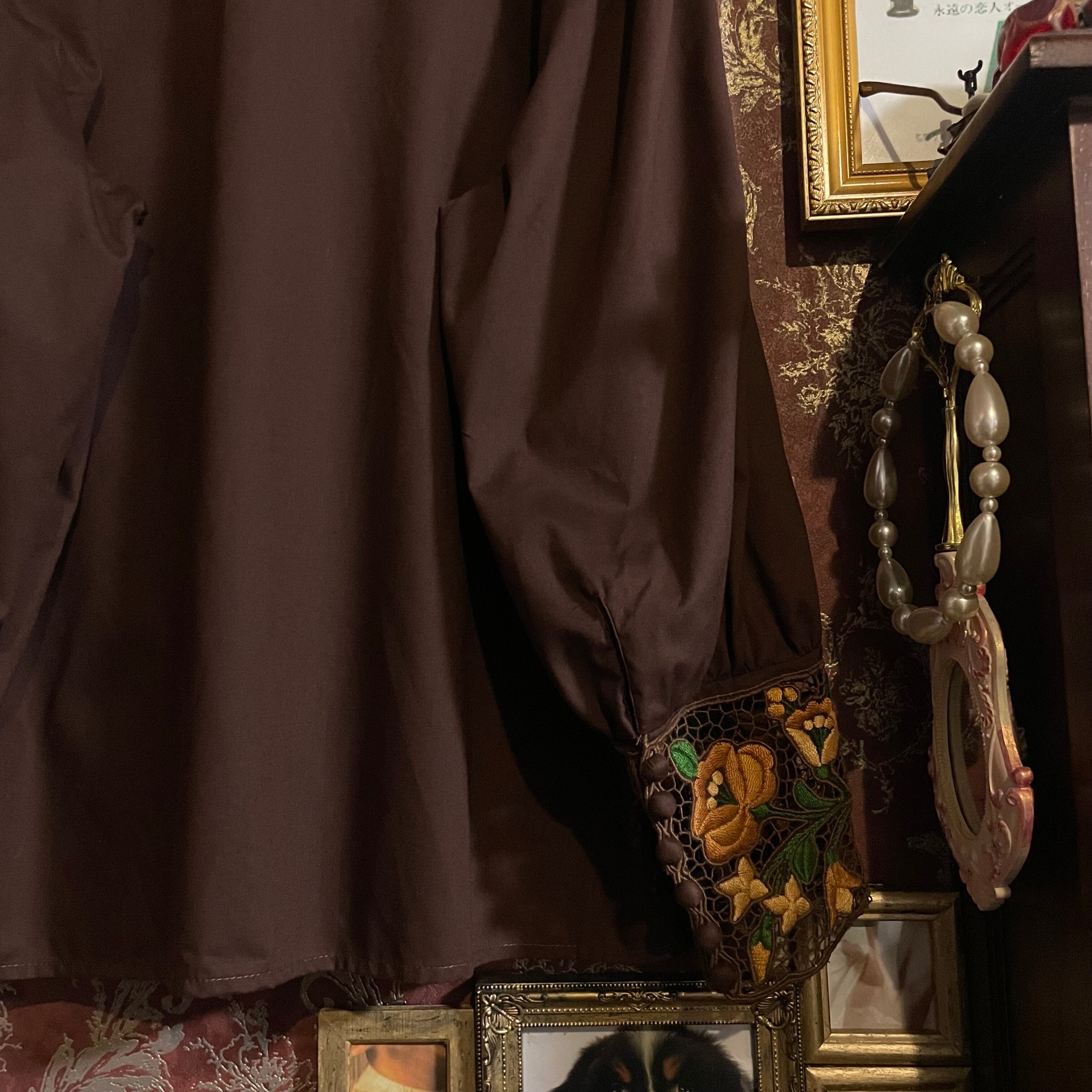 深みのあるチョコレートブラウン(#302120)に、フラワーモチーフの刺繍が華やかに映えるブラウスです。