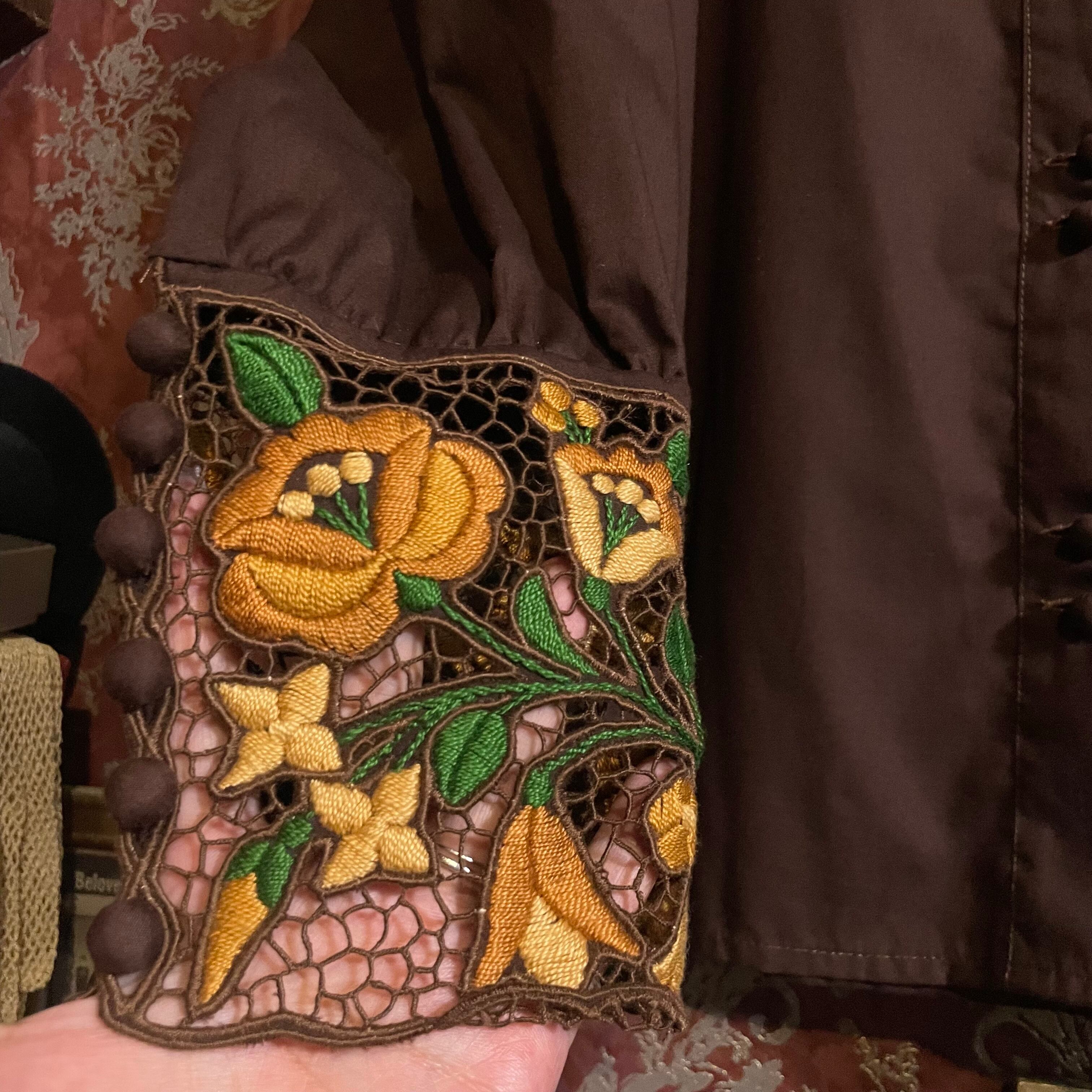 特にカフスが印象的で、美しい刺繍とくるみボタンのロングカフスに仕上げられています。