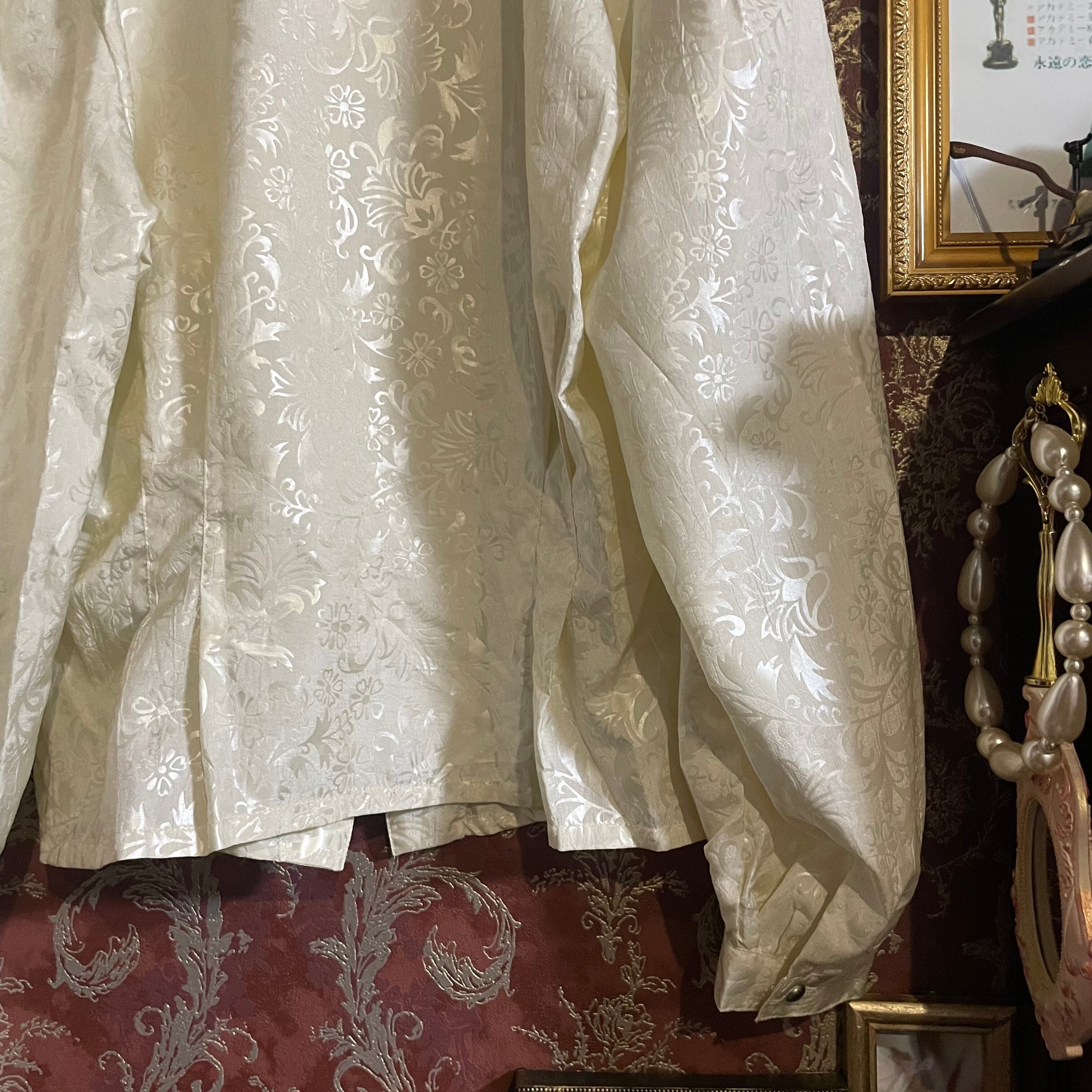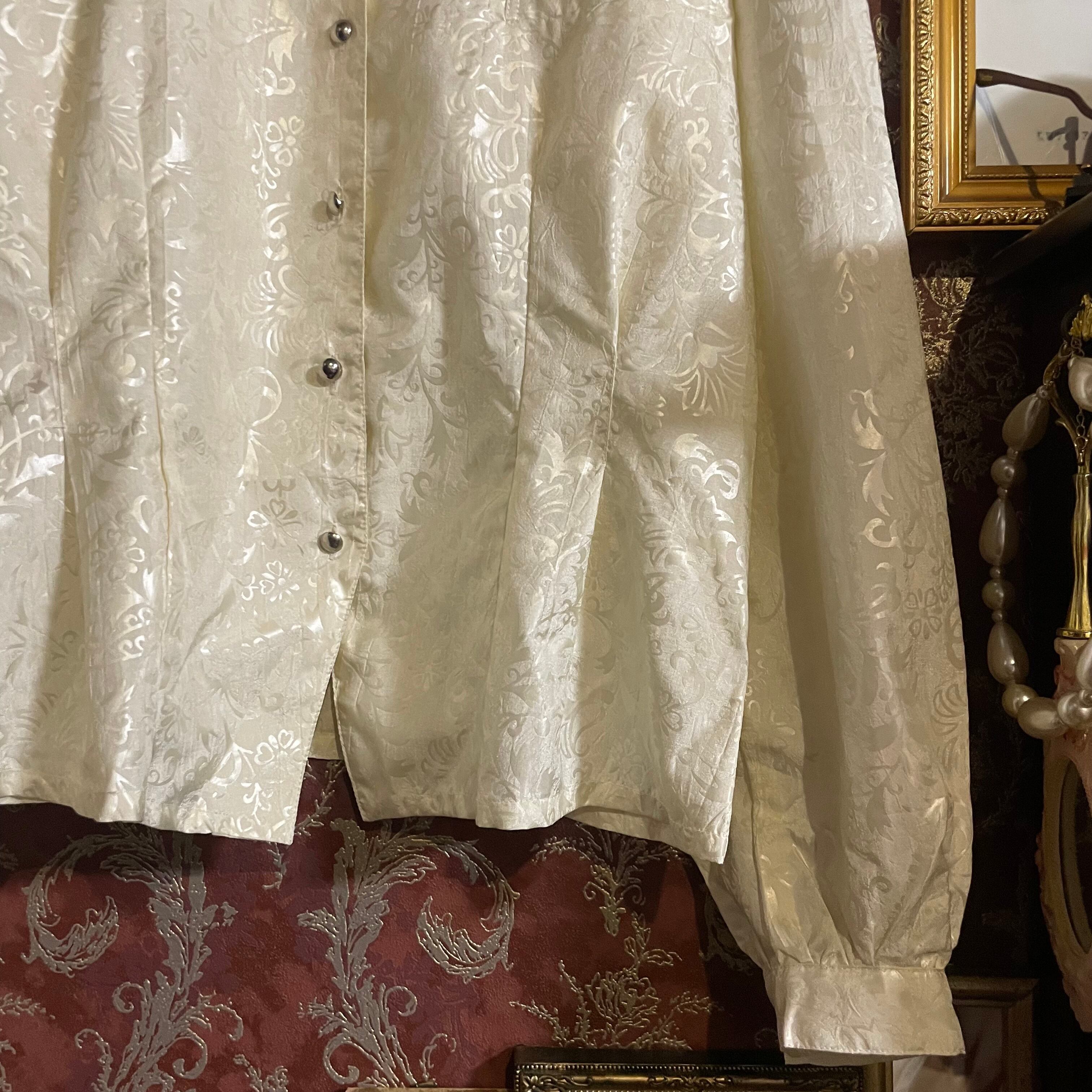 艶やかなアイボリー生地に、草花モチーフのジャガード織りが浮かぶクラシカルなブラウスです。