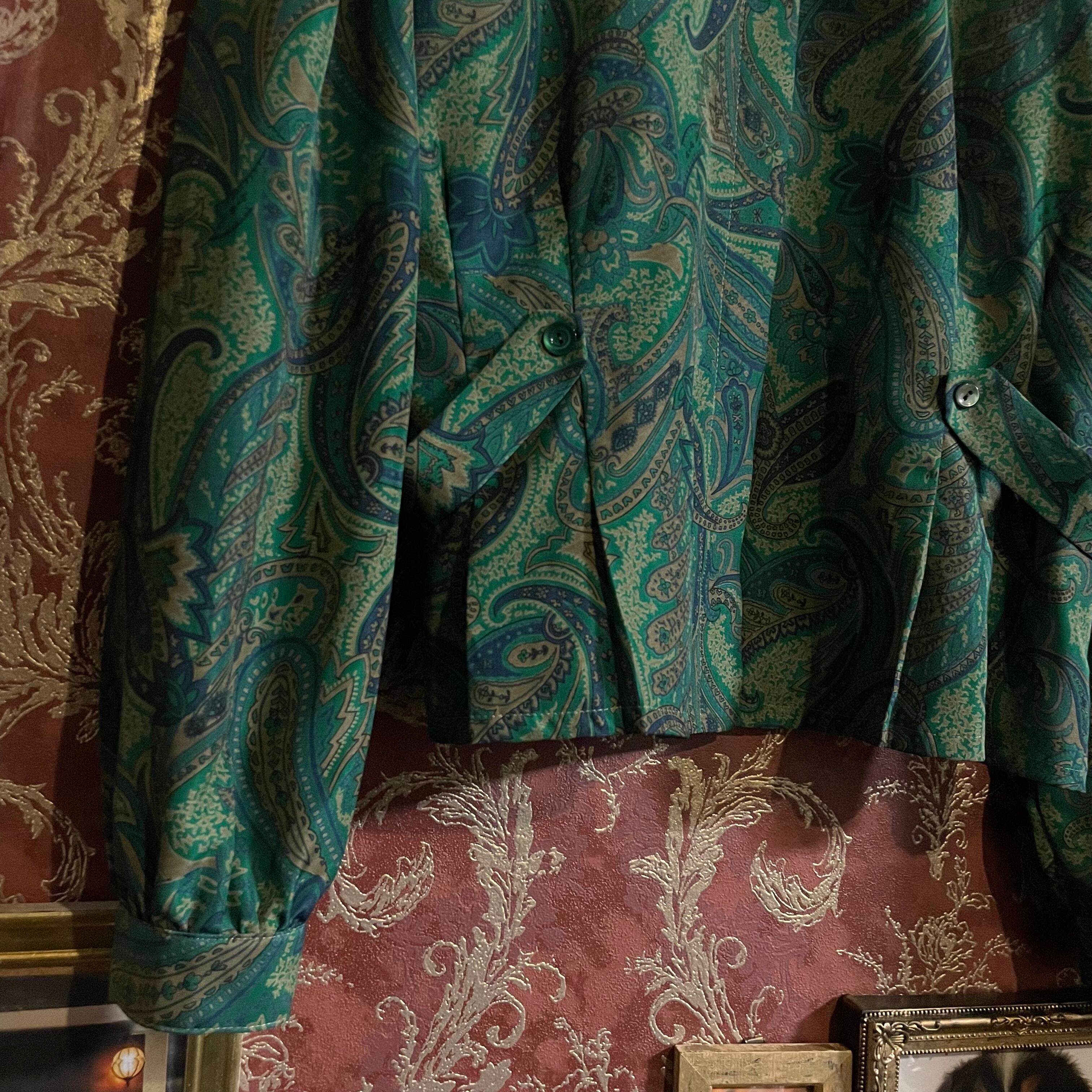 深みのある青系グリーン(ベースカラーは#16686b付近)を基調に、ブルーやグレーを効かせた華やかなペイズリー柄のブラウスです。