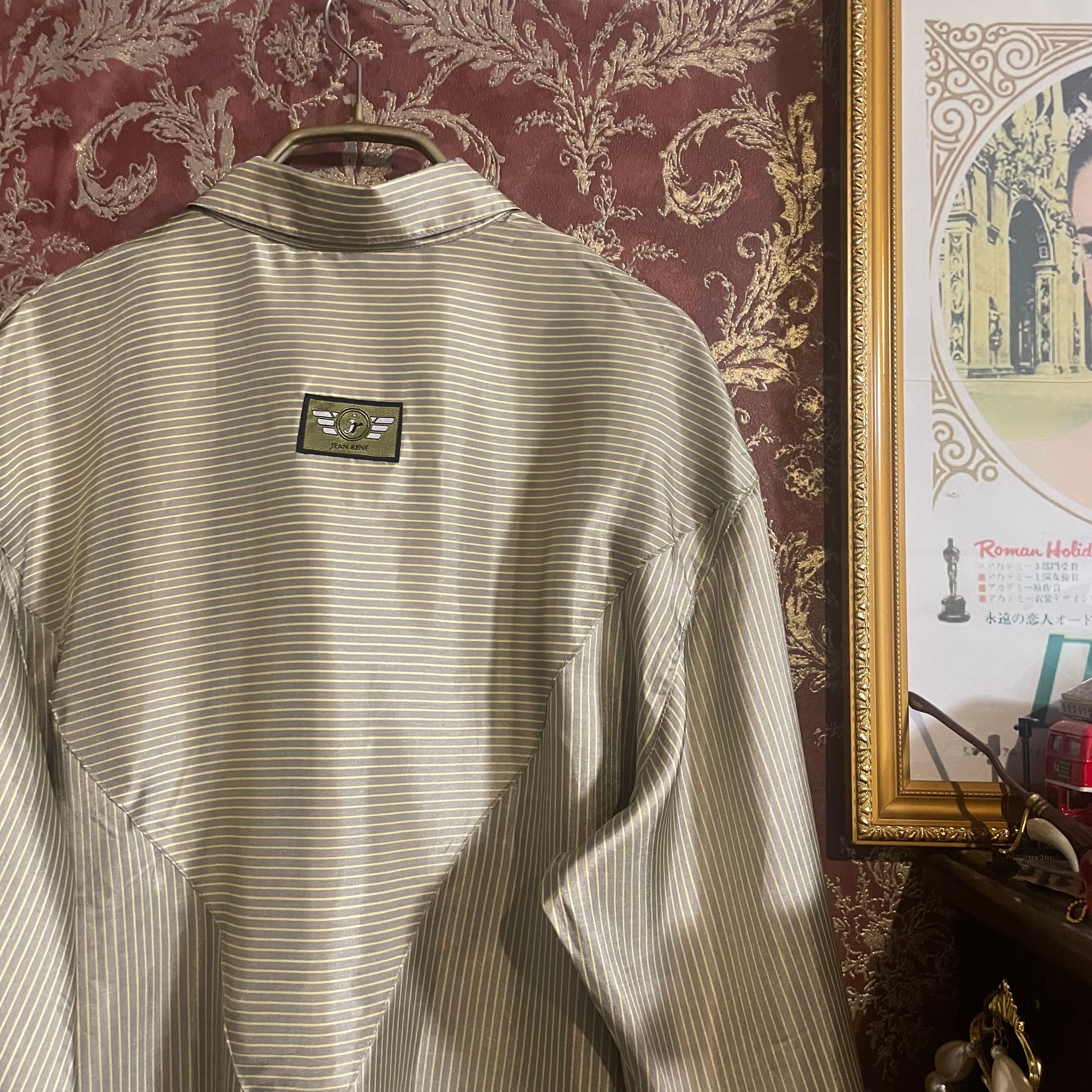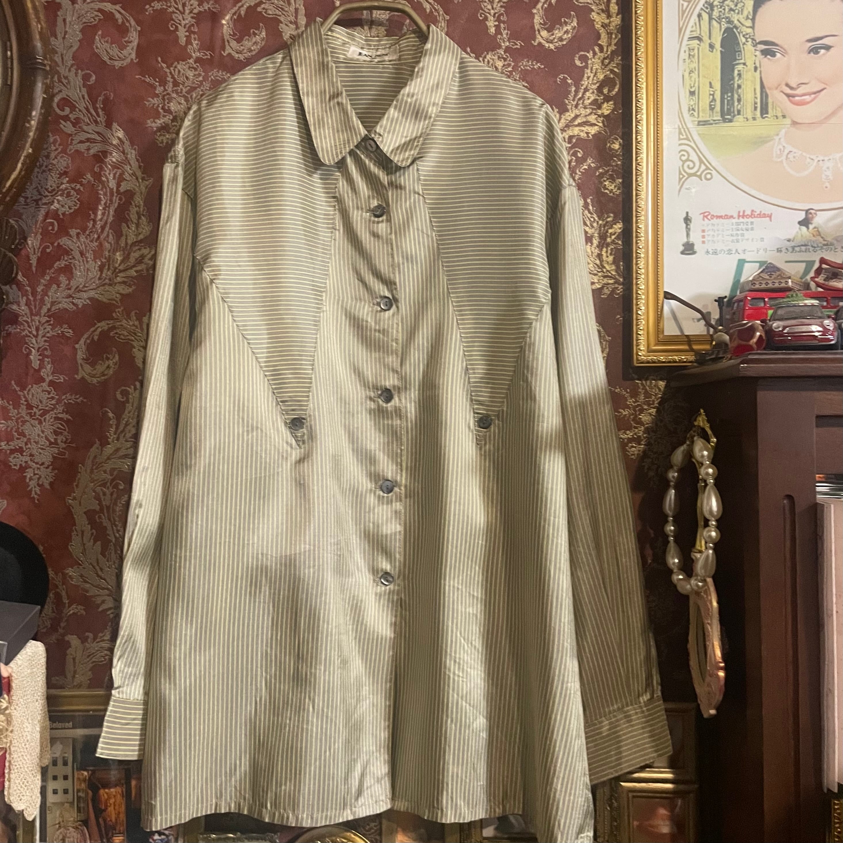 落ち着いたグレイッシュカラー(#8f9184)に、さりげないイエローストライプが走るヴィンテージシャツです。