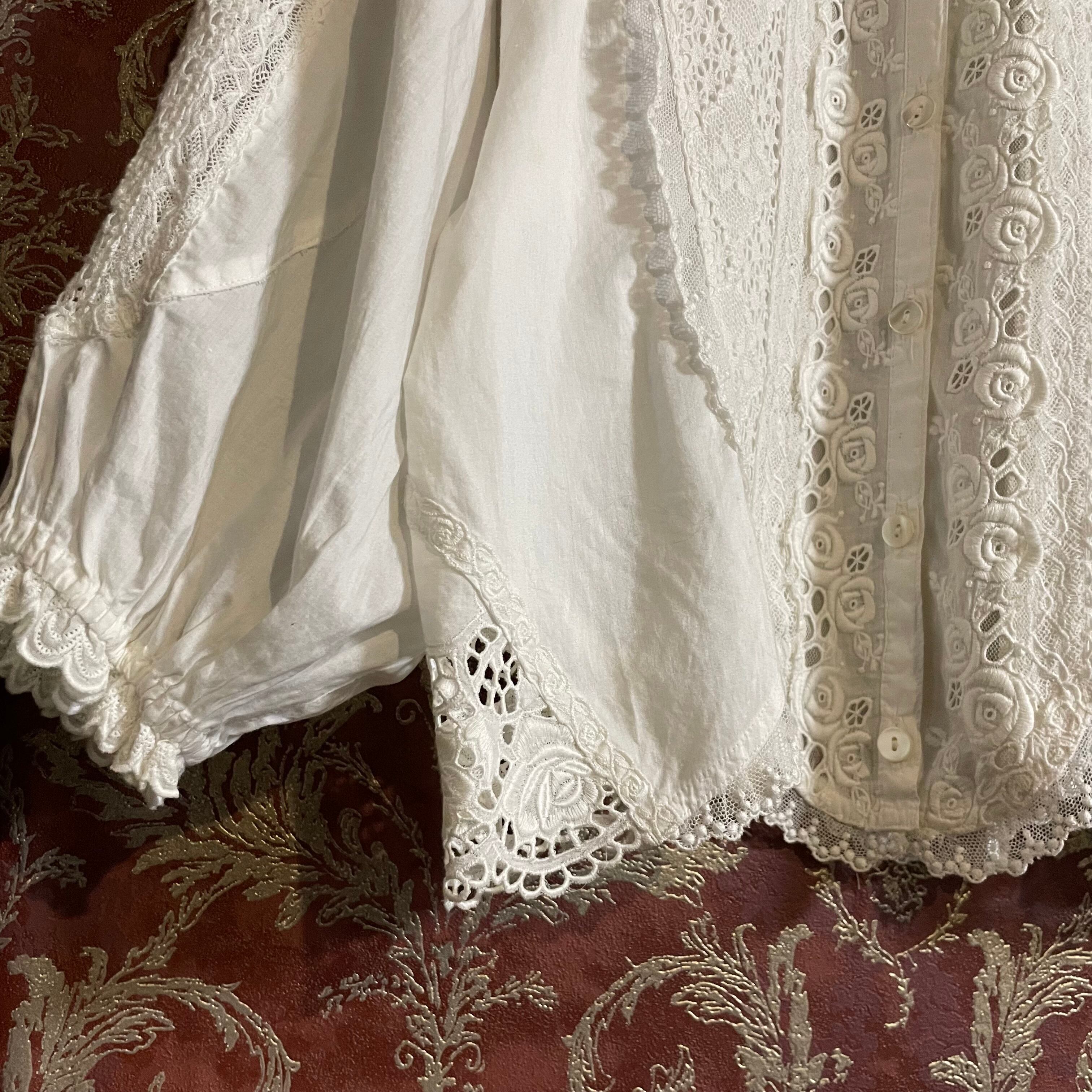 繊細なレースワークとスカラップ仕立てが贅沢に施された、ZIN KATO(ジンカトウ)のホワイトブラウスです。