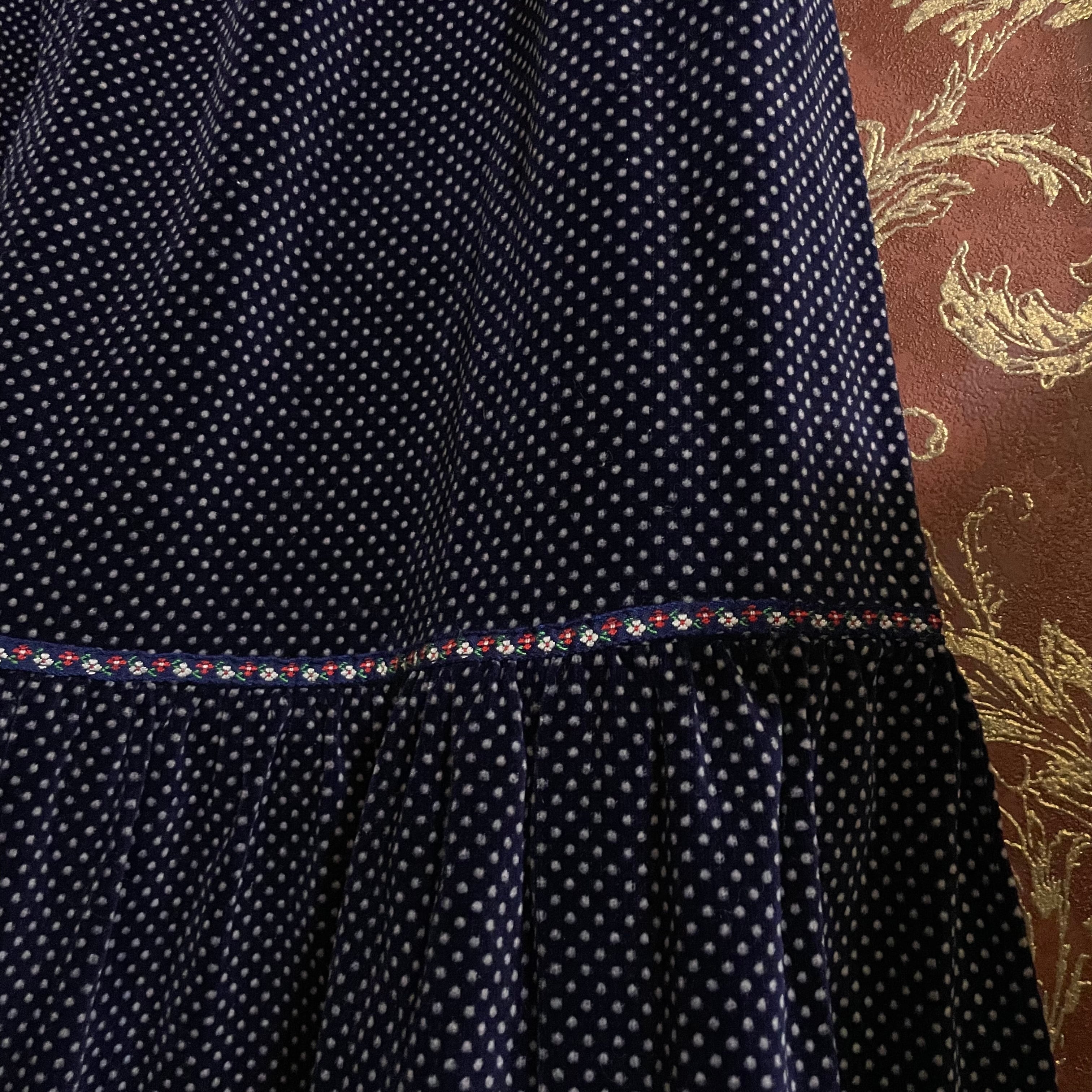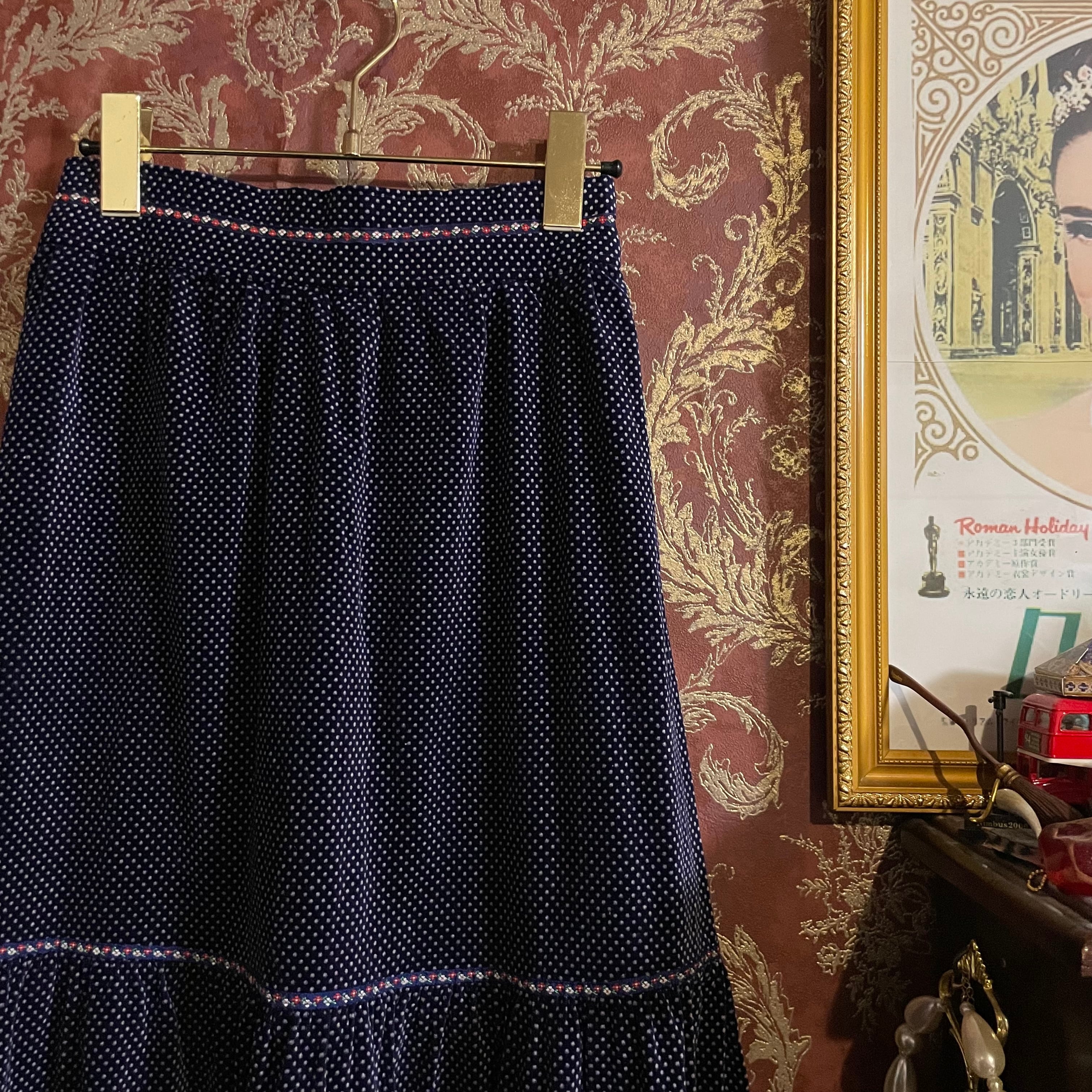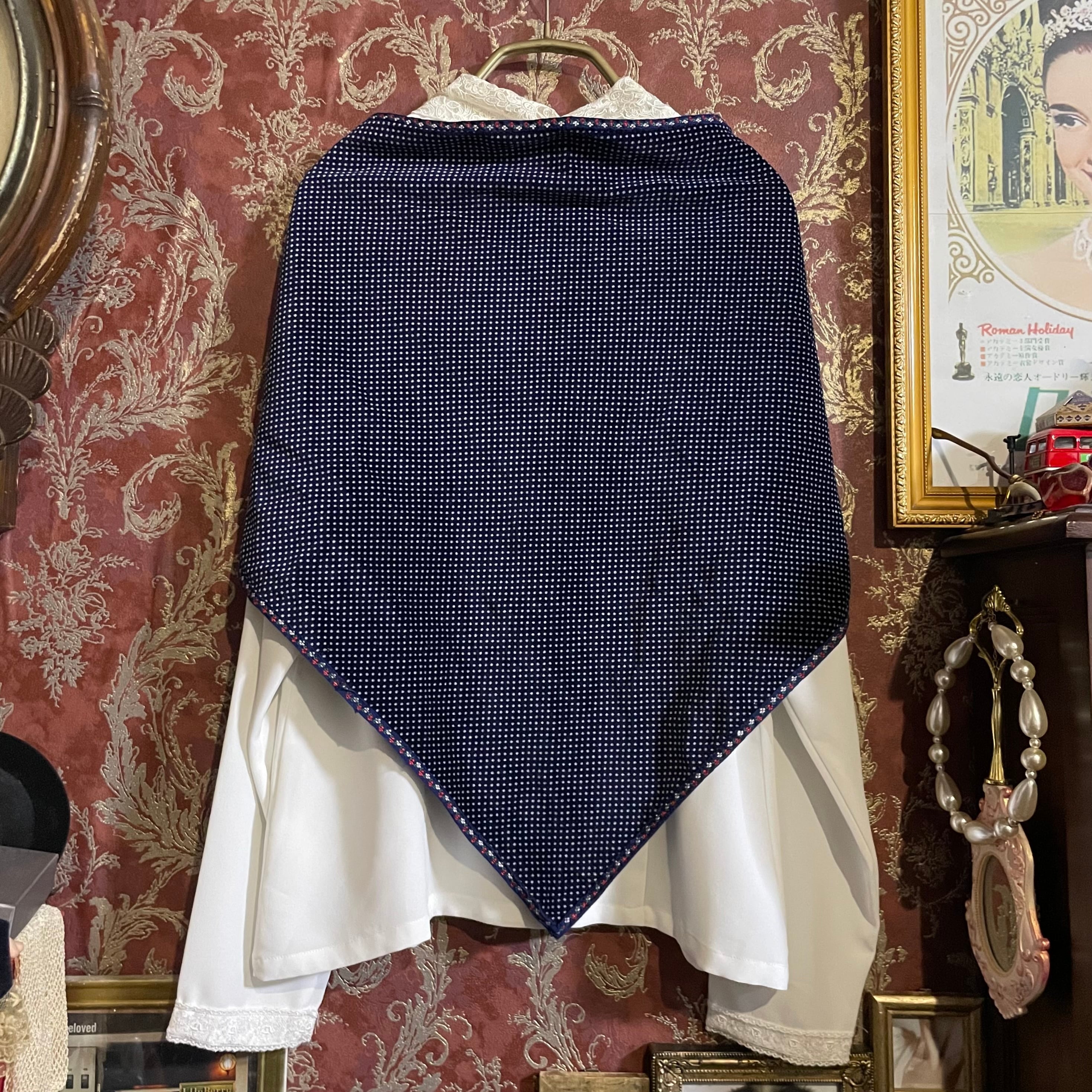 ネイビーのベルベット地に白のドット柄が映える、70年代頃の三角ショールとスカートのセットです。