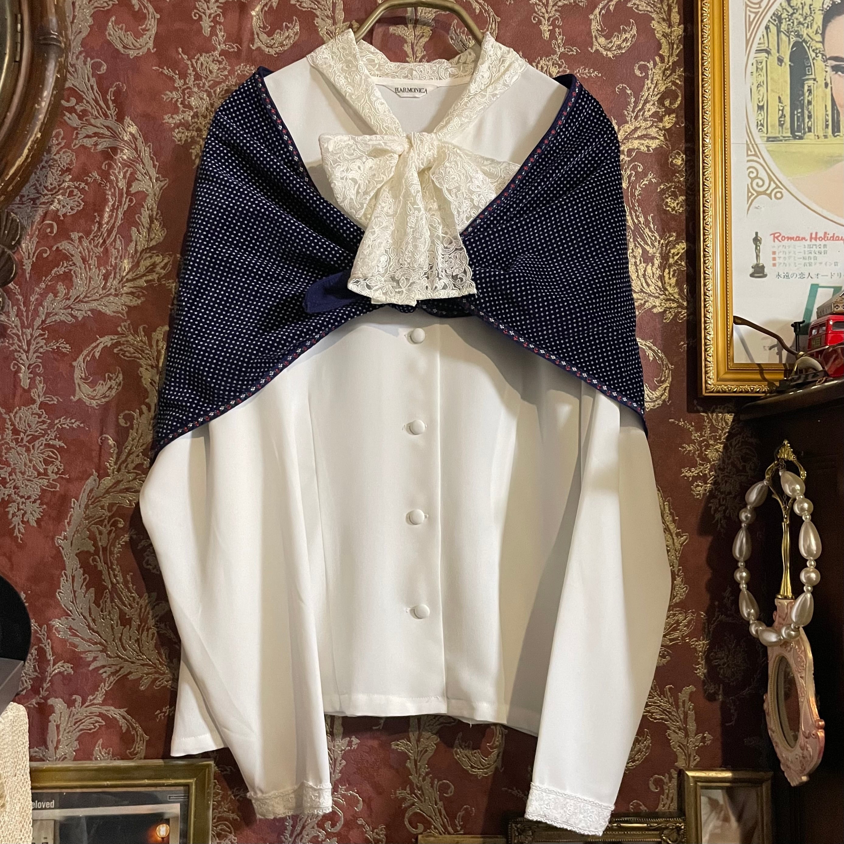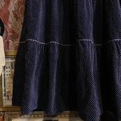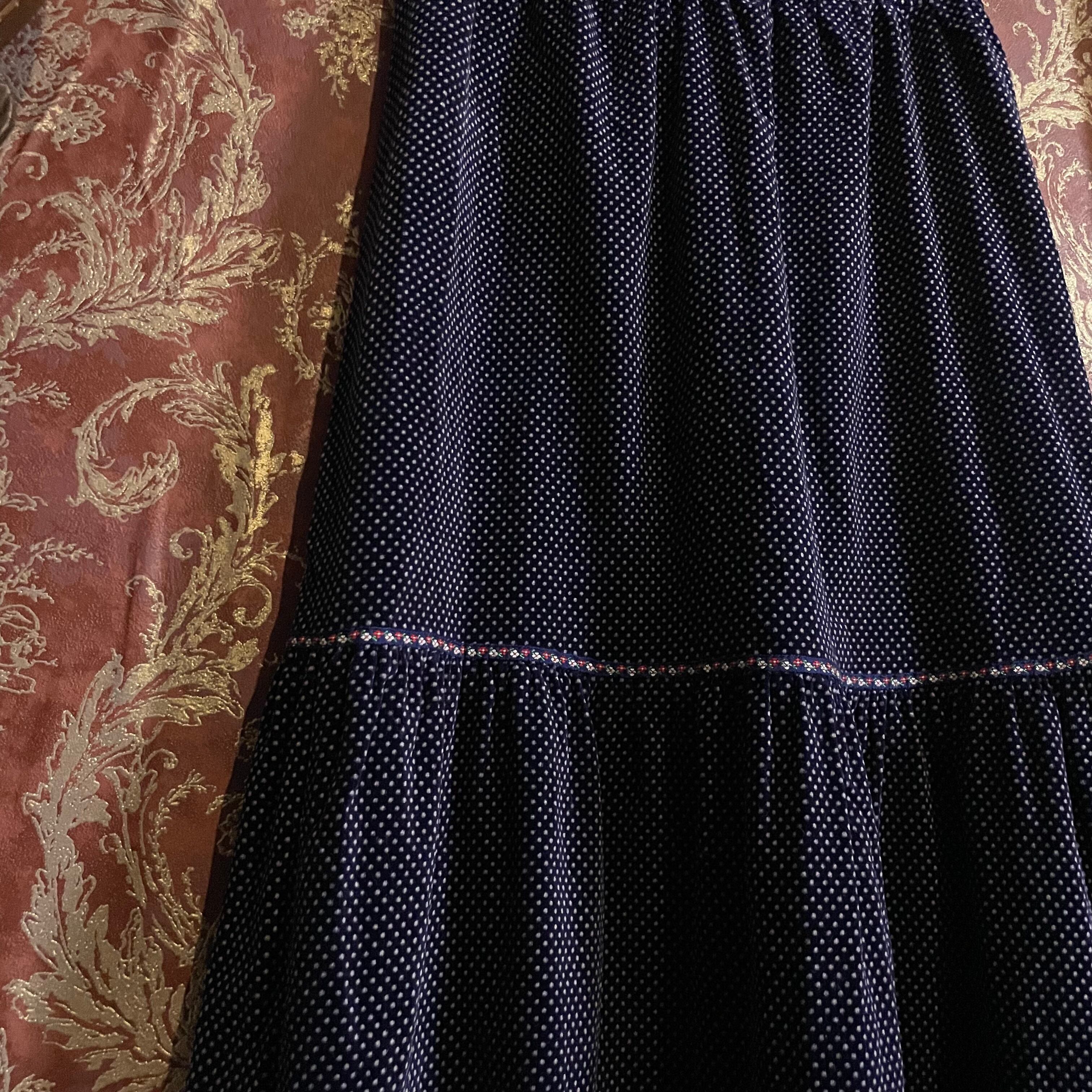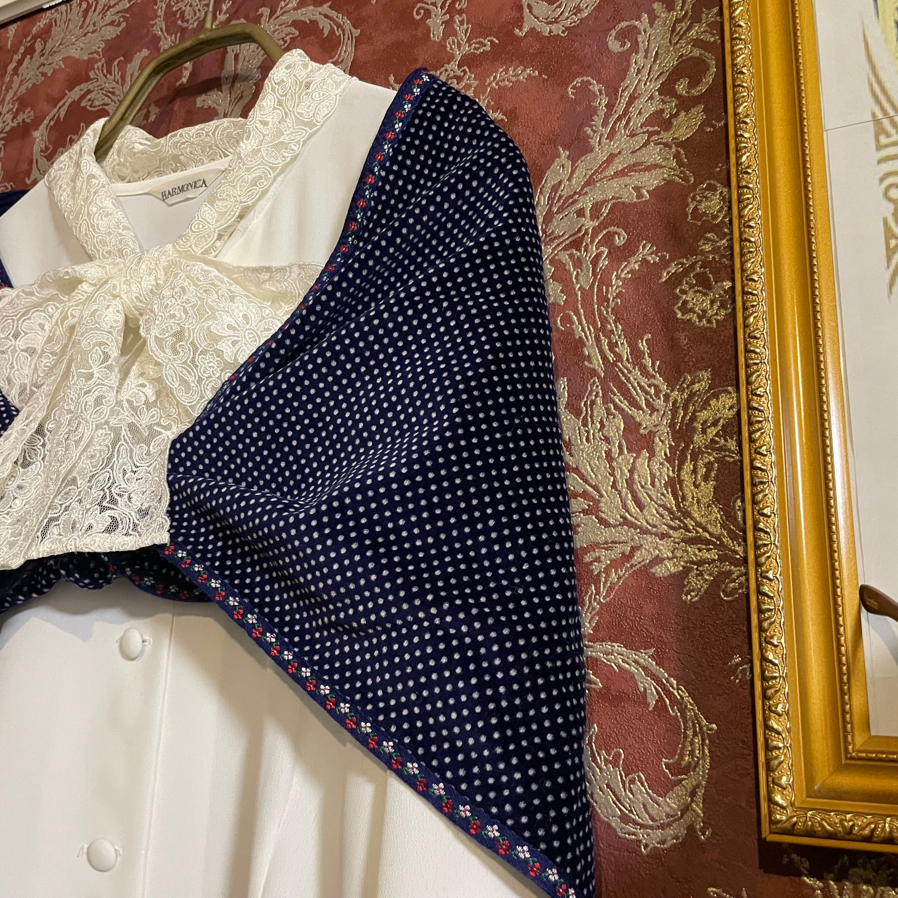 ネイビーのベルベット地に白のドット柄が映える、70年代頃の三角ショールとスカートのセットです。