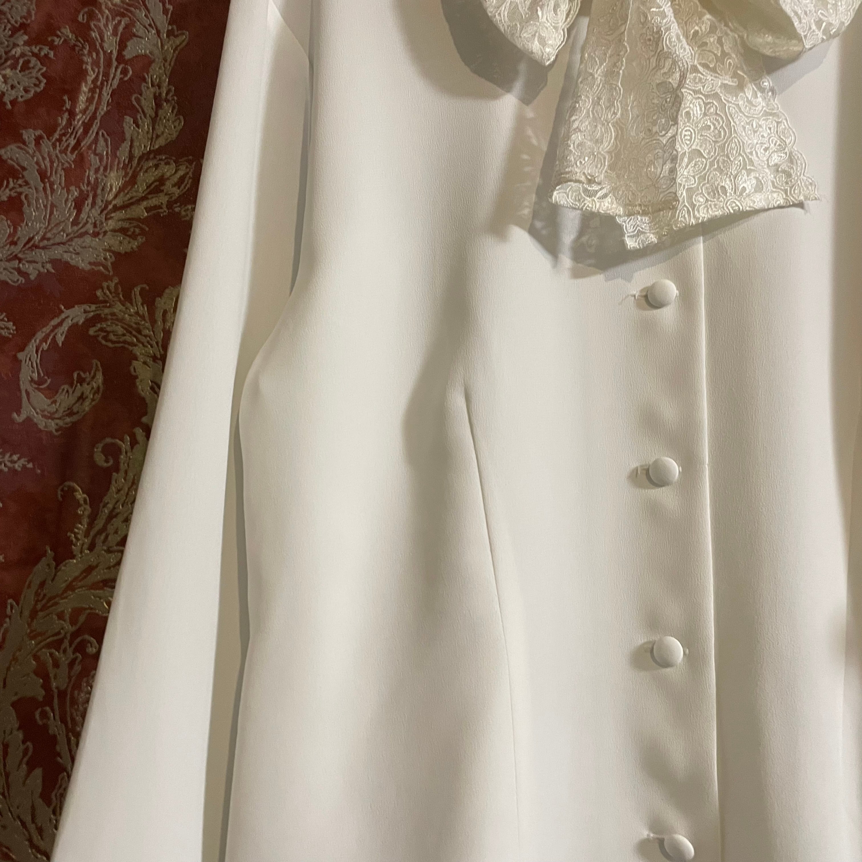 袖口にもさりげなくレースがあしらわれ、細部まで女性らしいこだわりが感じられます。