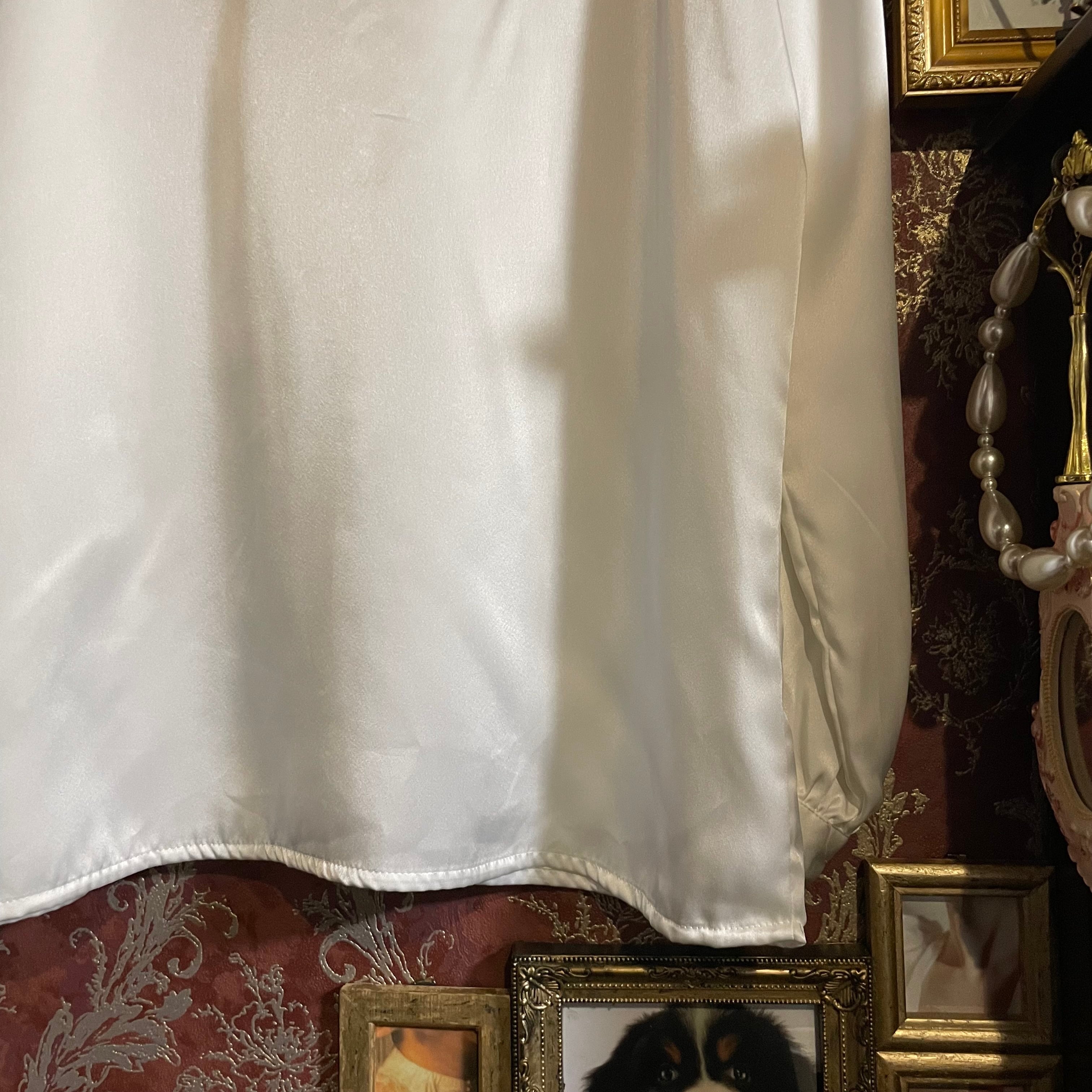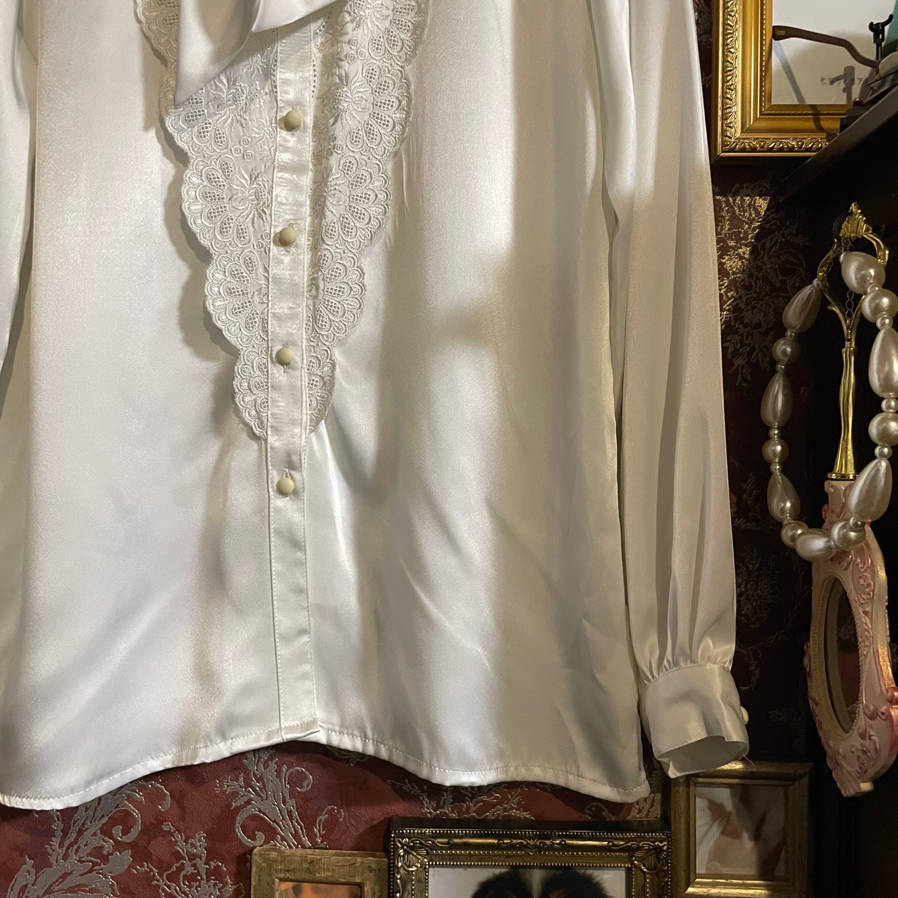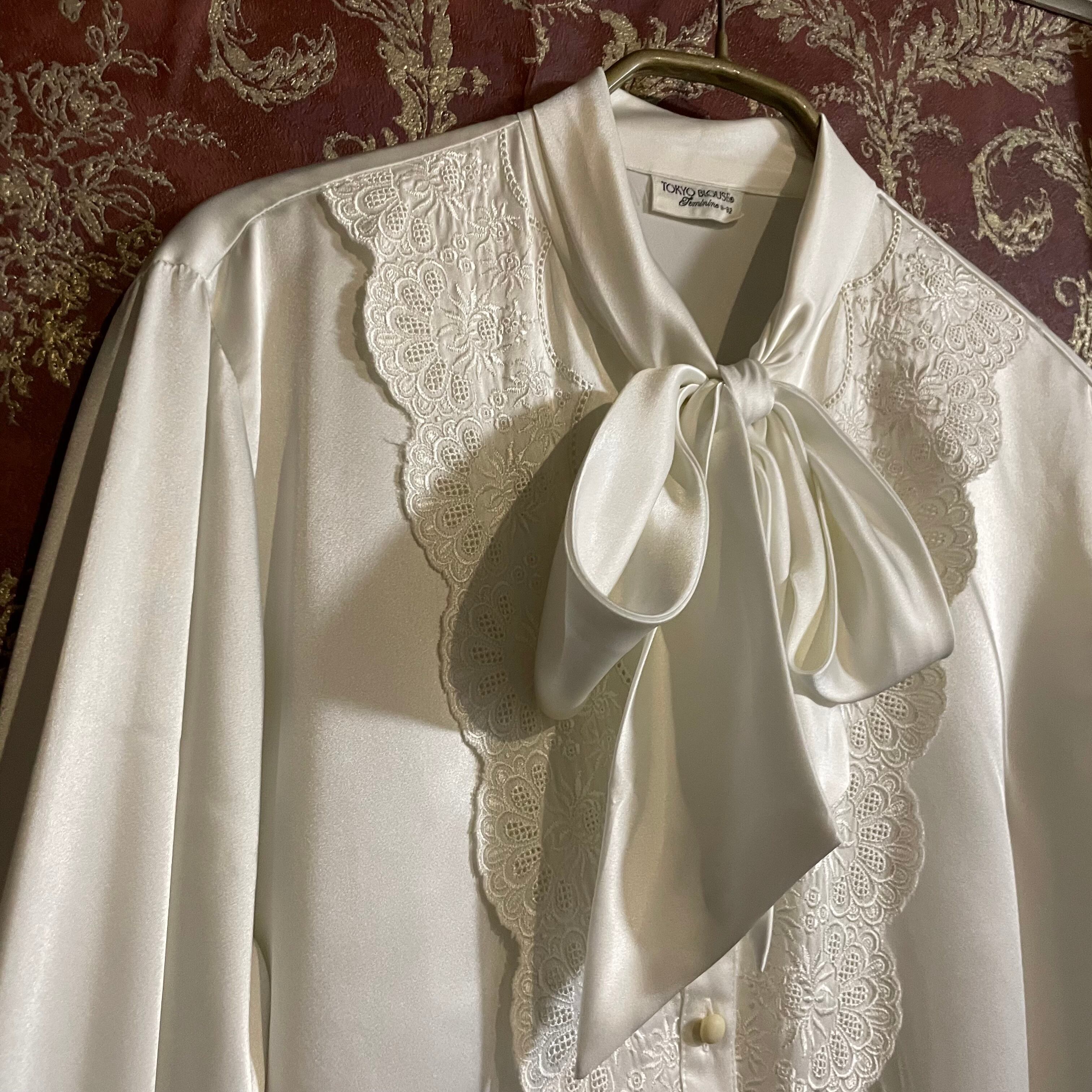 シルクのような光沢感が美しい、クラシカルなボウタイブラウスです。