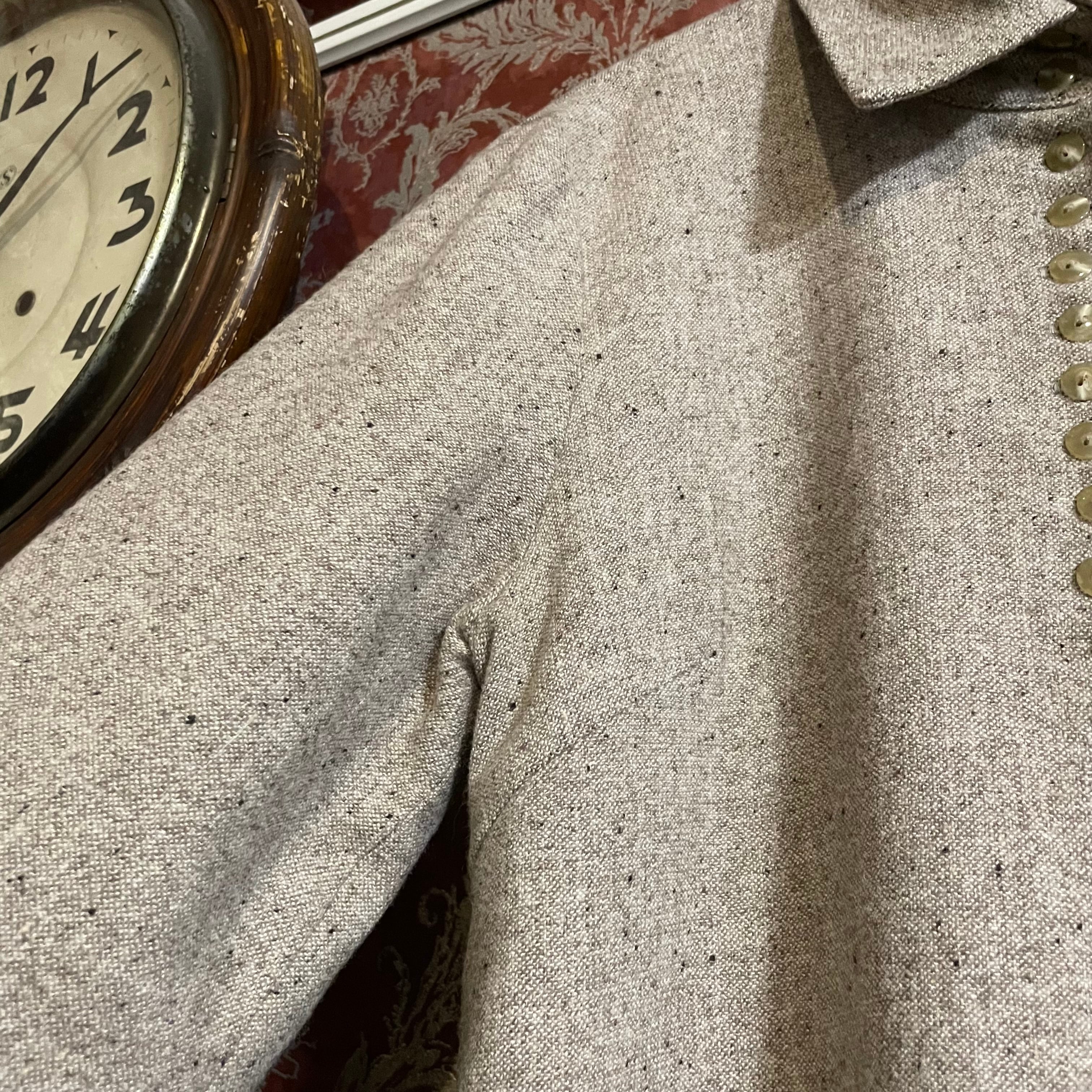 杢調のグレー生地を使用し、フロントに並ぶ小さなボタンがアンティーク風のクラシカルな印象を添えています。