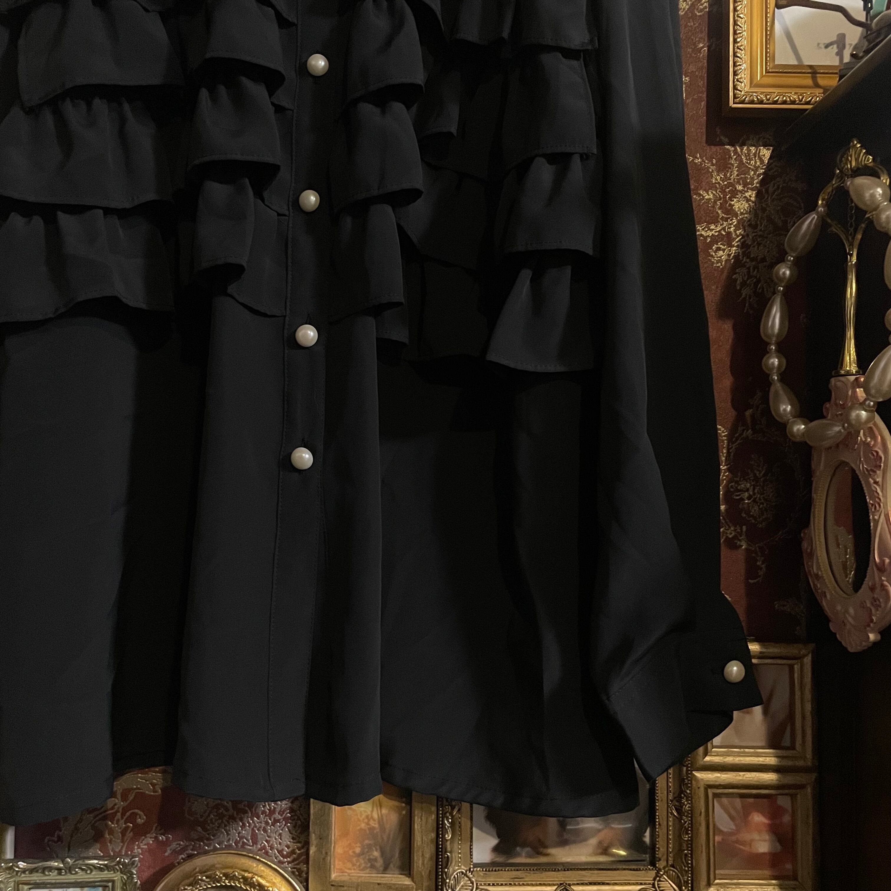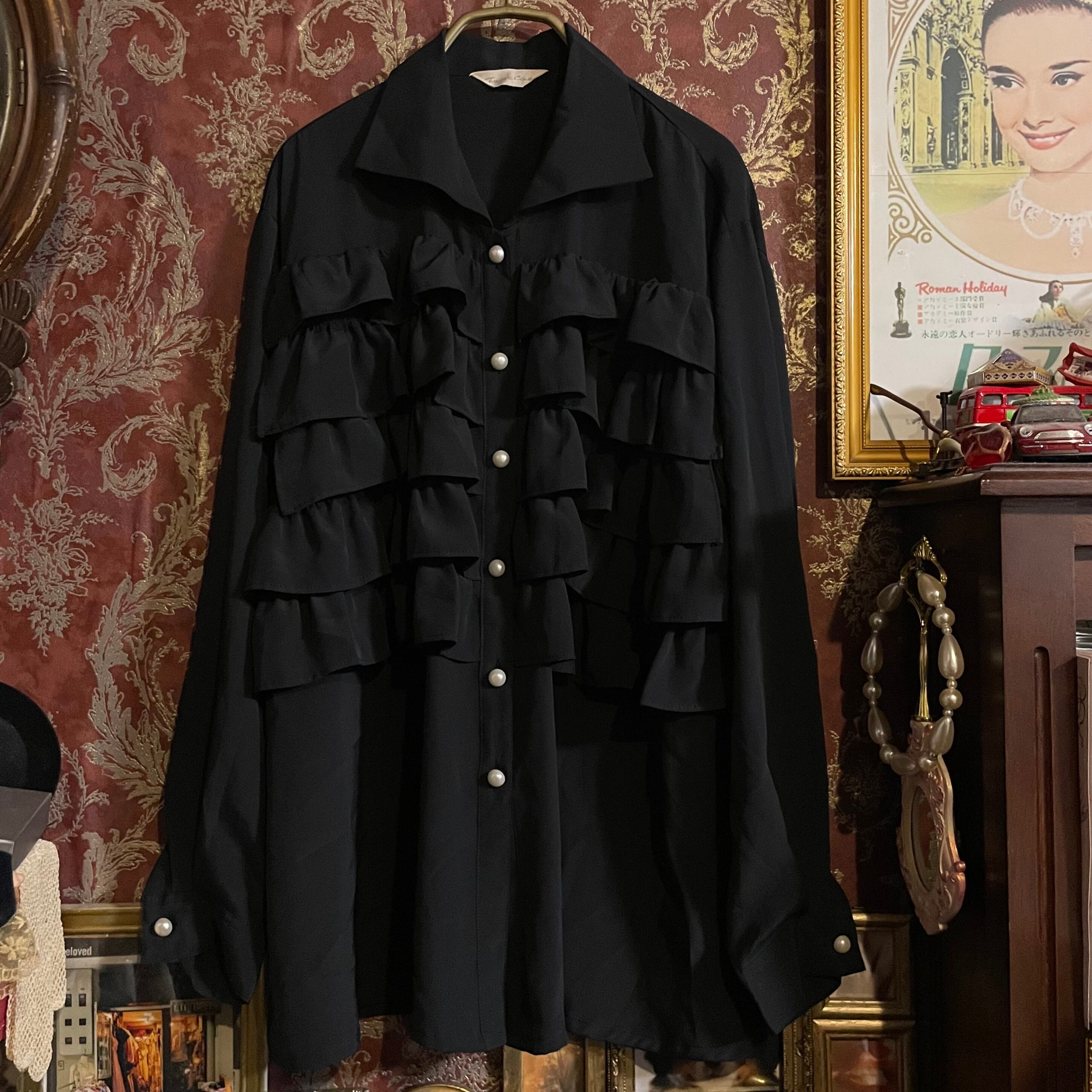 フロントにたっぷりとあしらわれたフリルが華やかなブラックブラウスです。