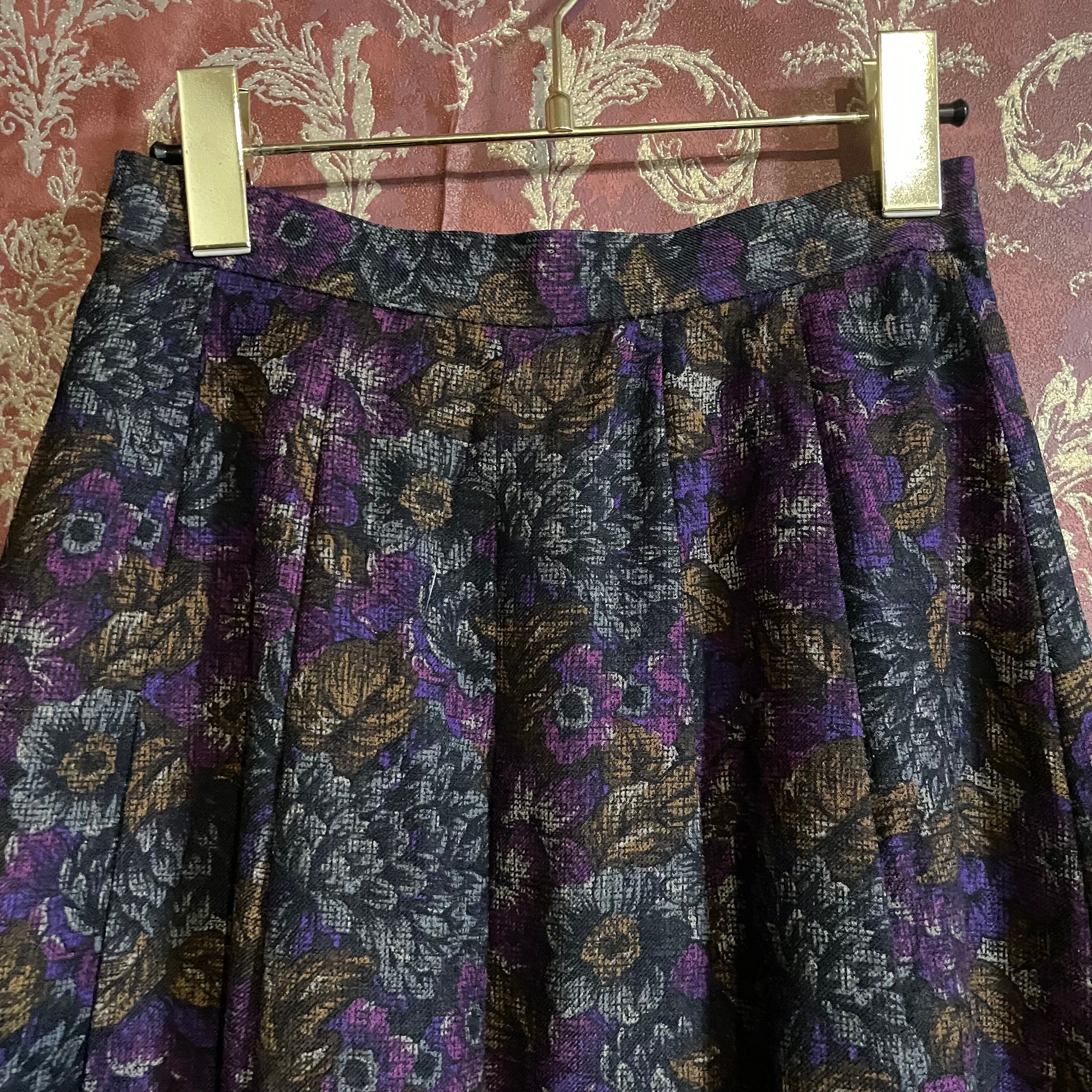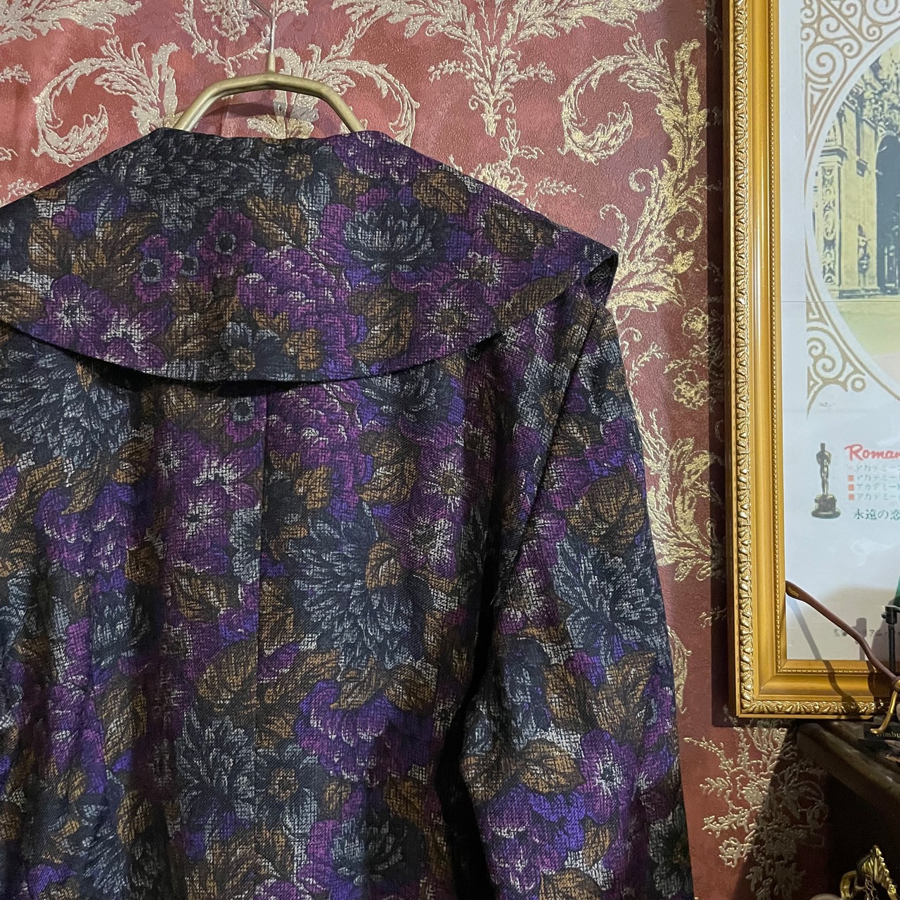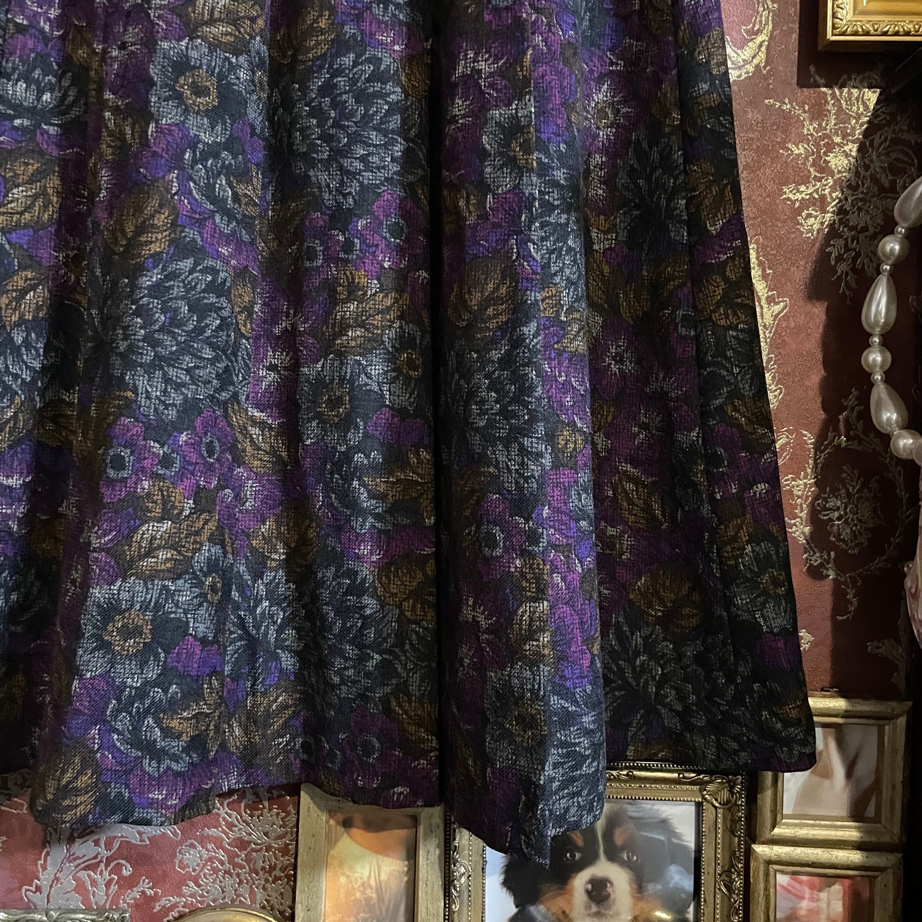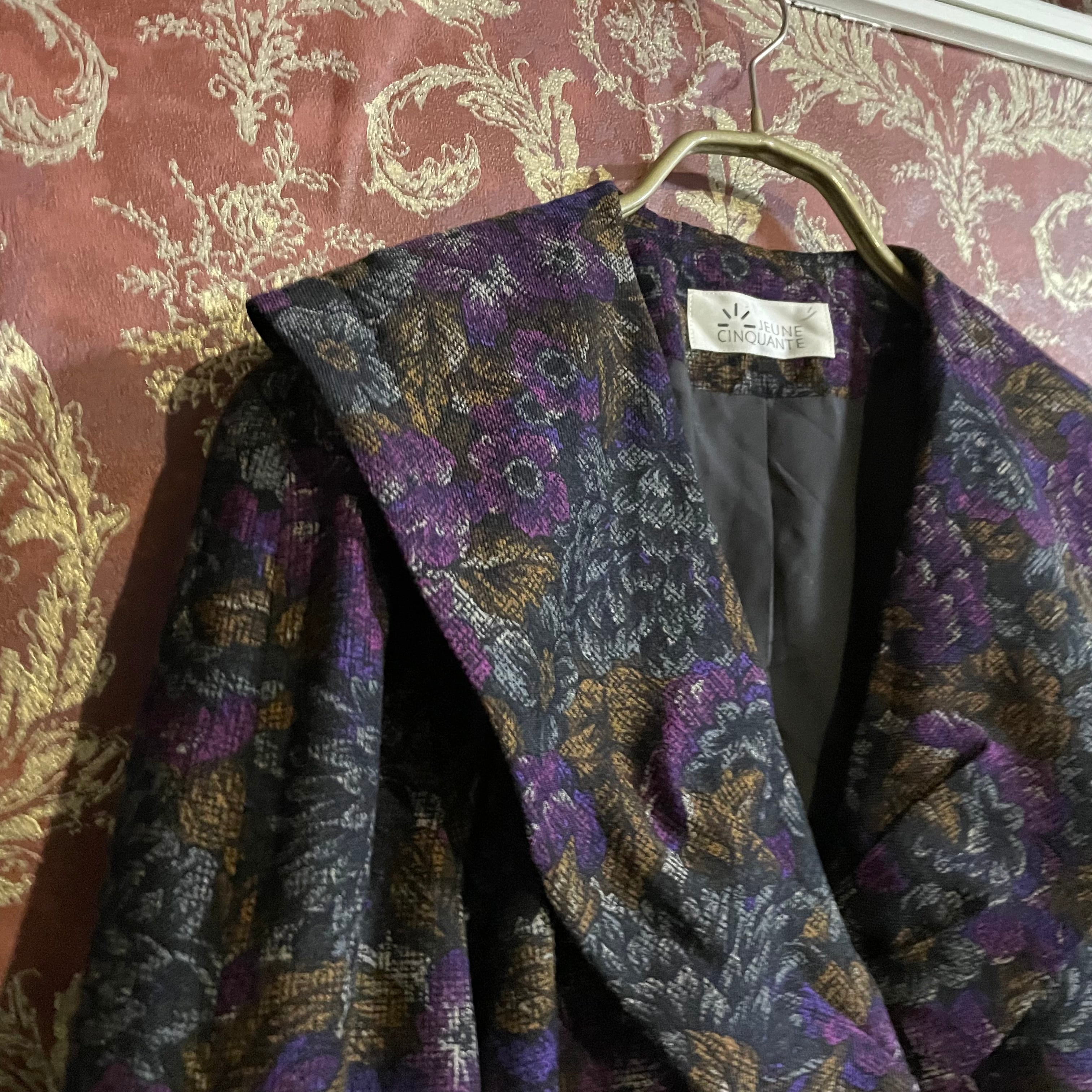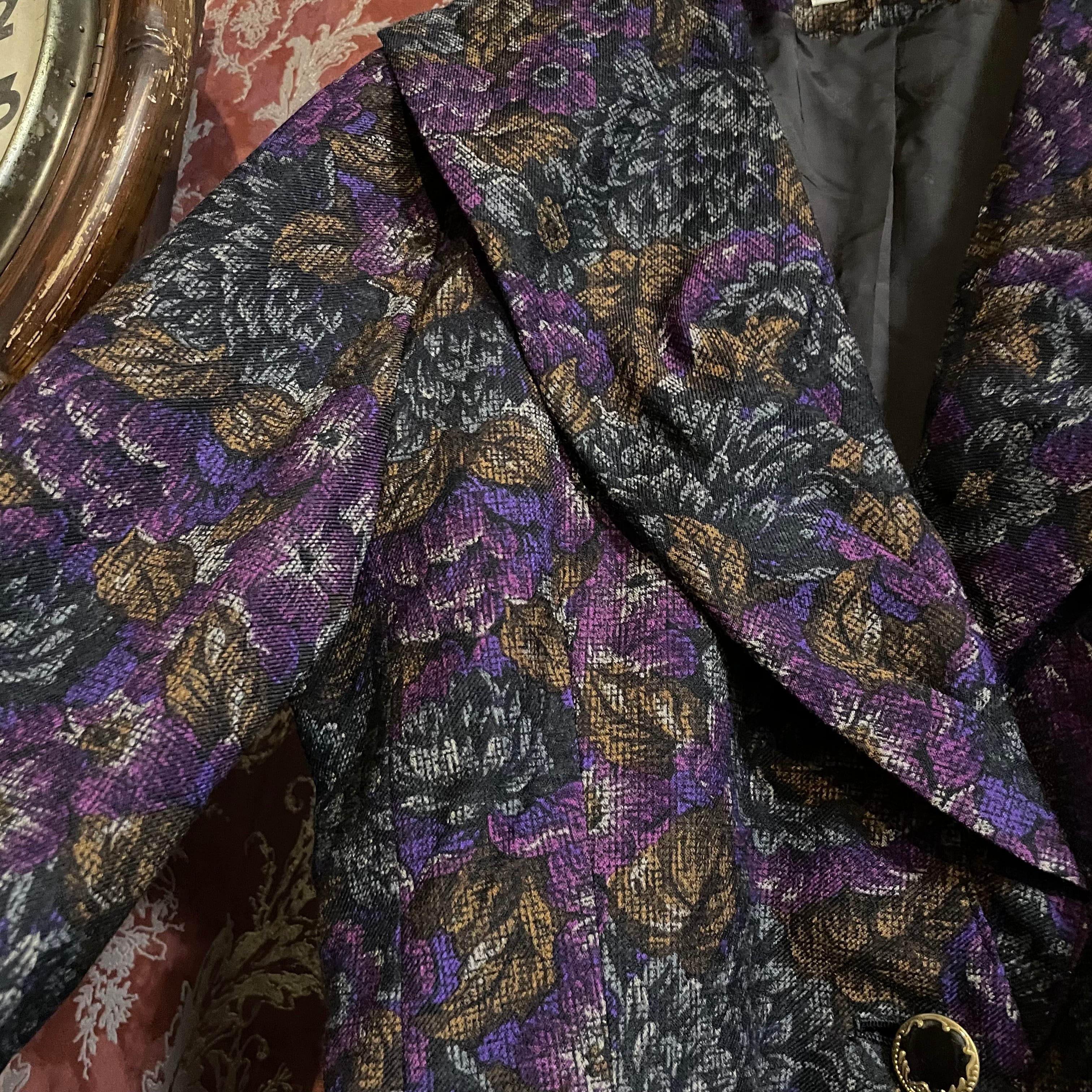 深みのある赤みパープルを基調に、ゴールドやグレーの花々が織り込まれたジャカード生地風の柄が印象的なセットアップです。