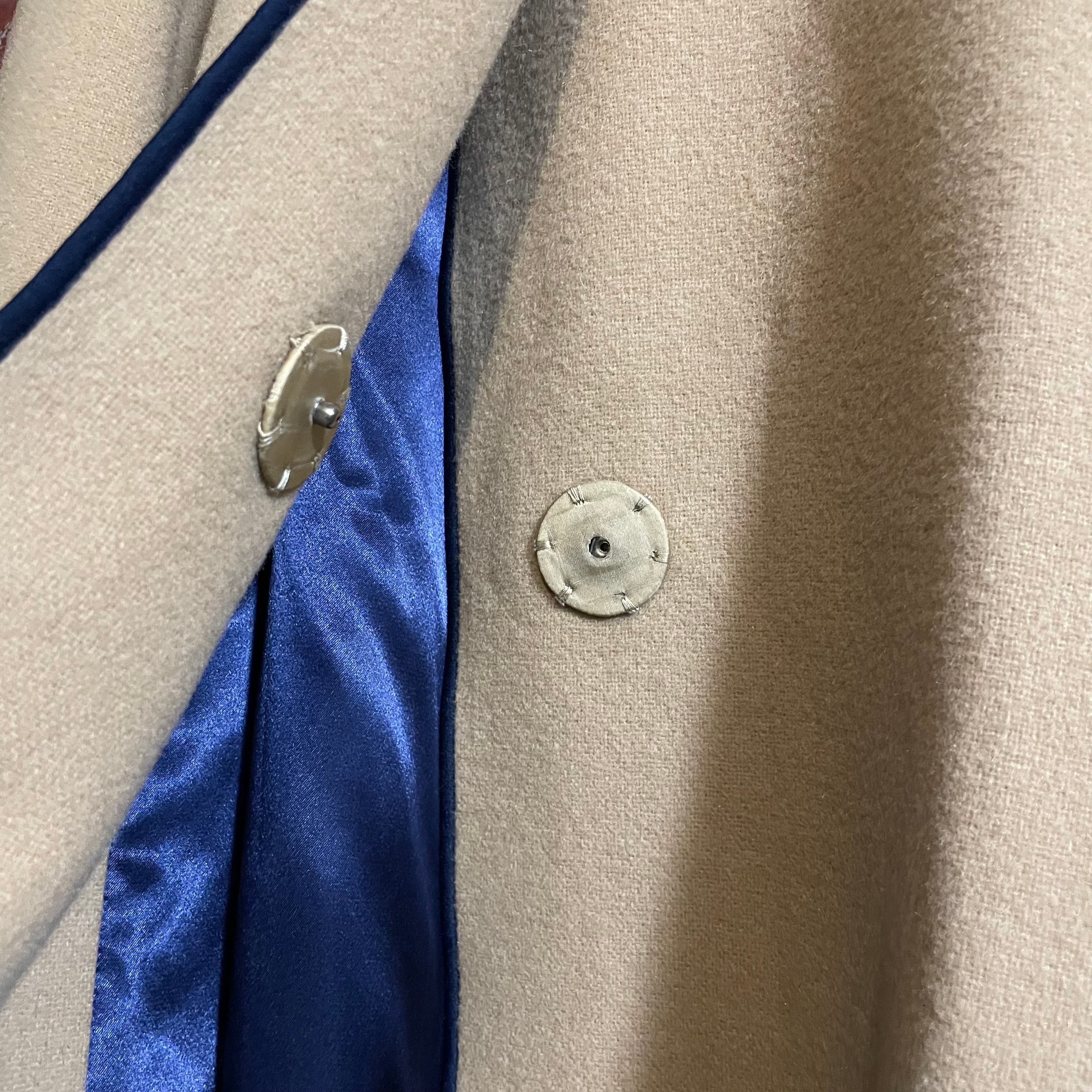襟や袖口、前立て、裾には細いネイビーのラインが入っており、優しいベージュカラーをきりっと引き締めるアクセントに。