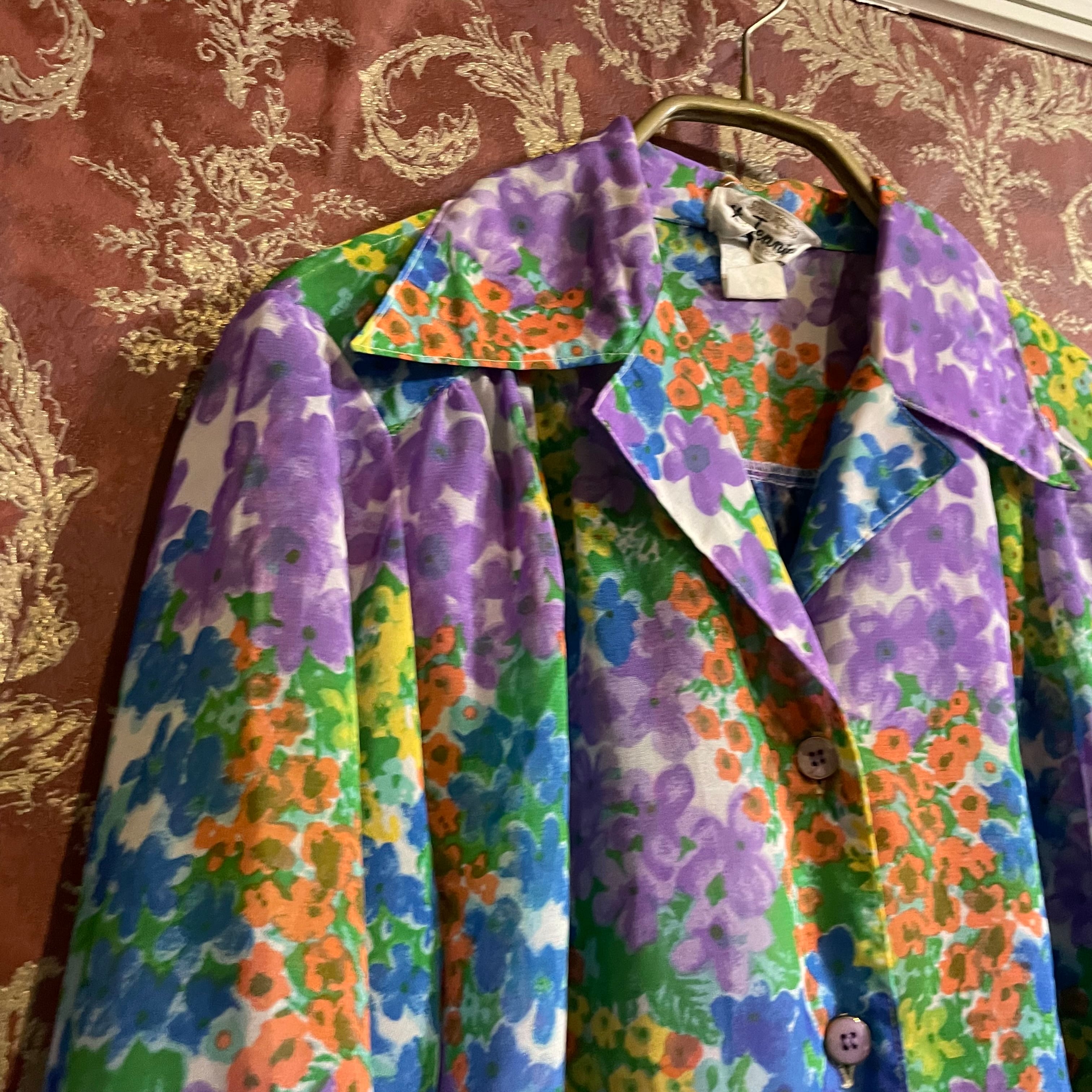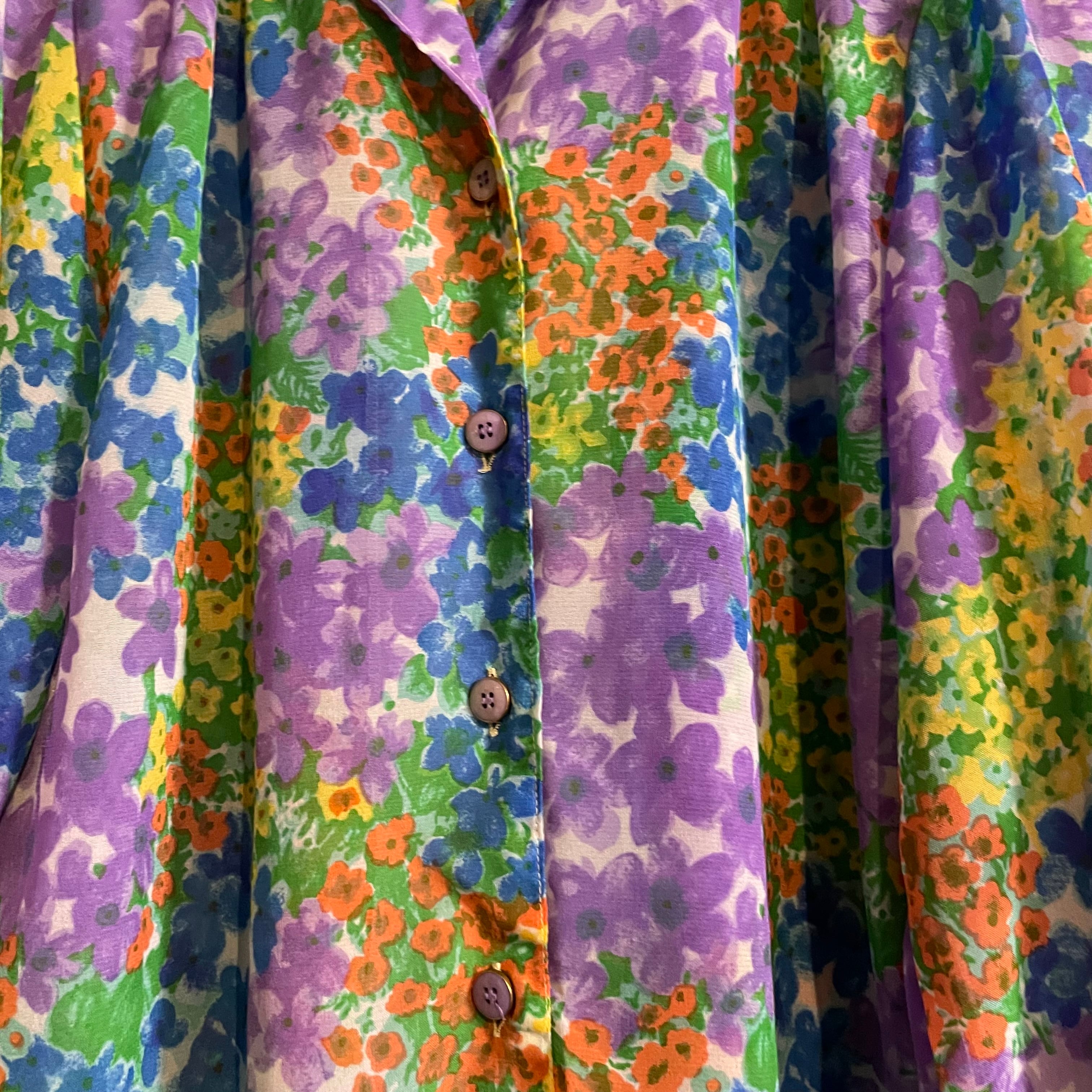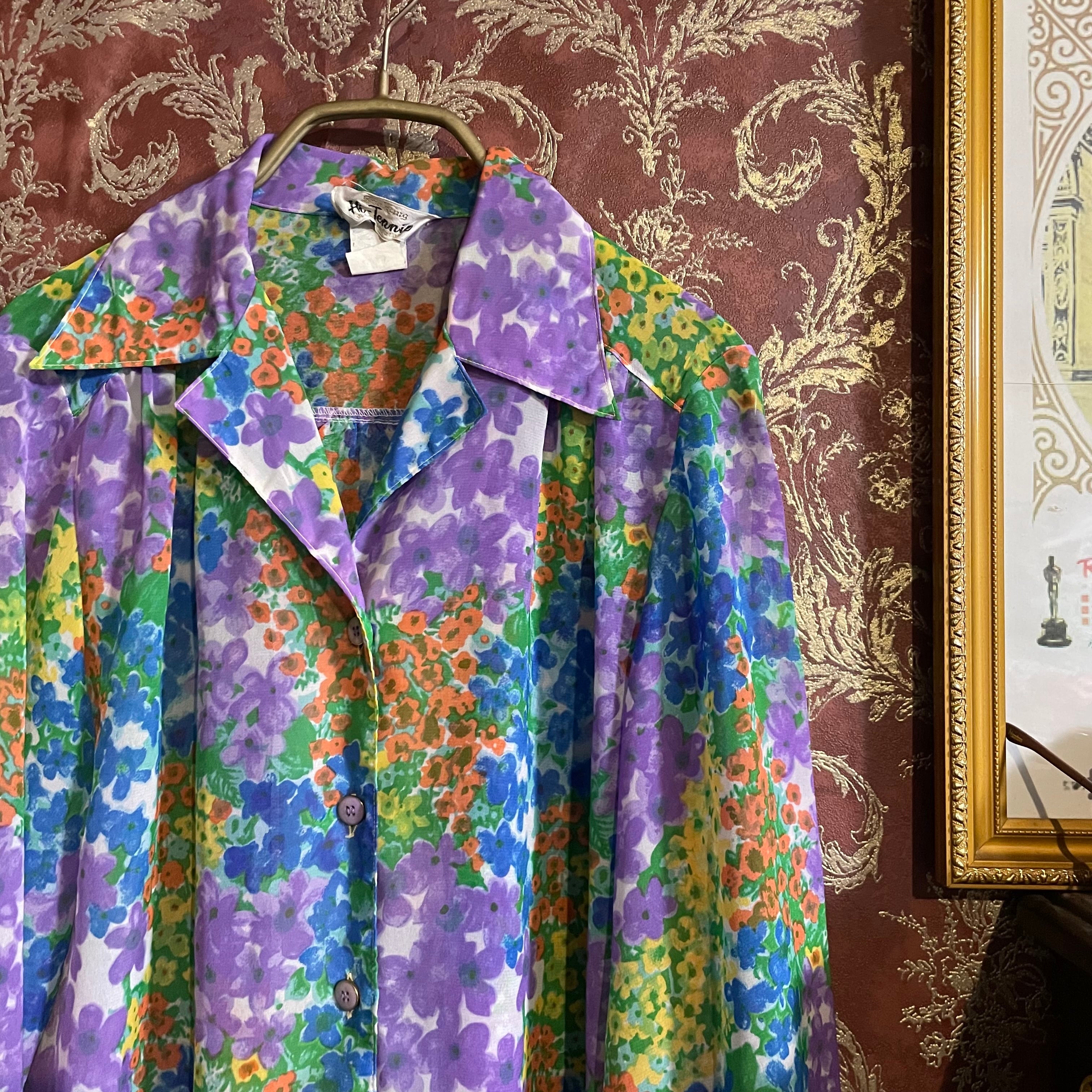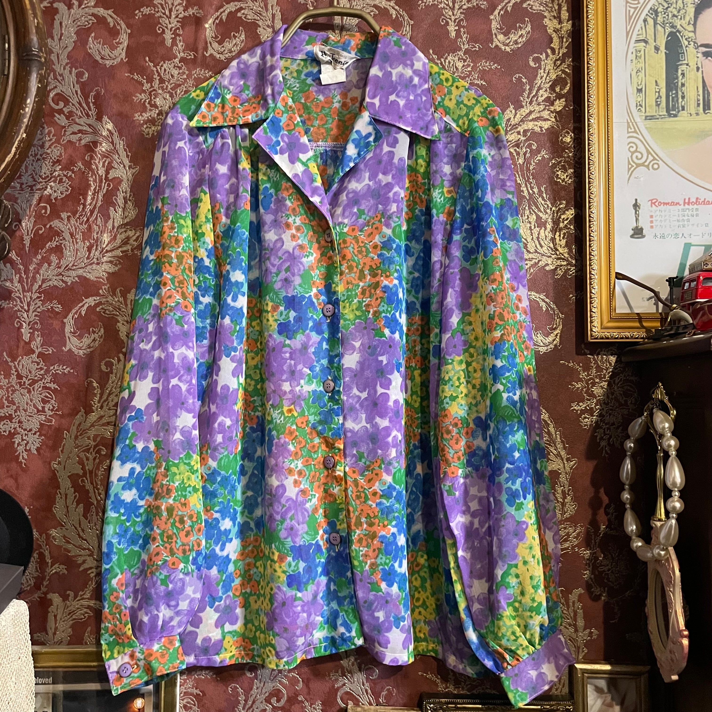 鮮やかなフラワープリントが目を引く、レトロな雰囲気のヴィンテージブラウスです。