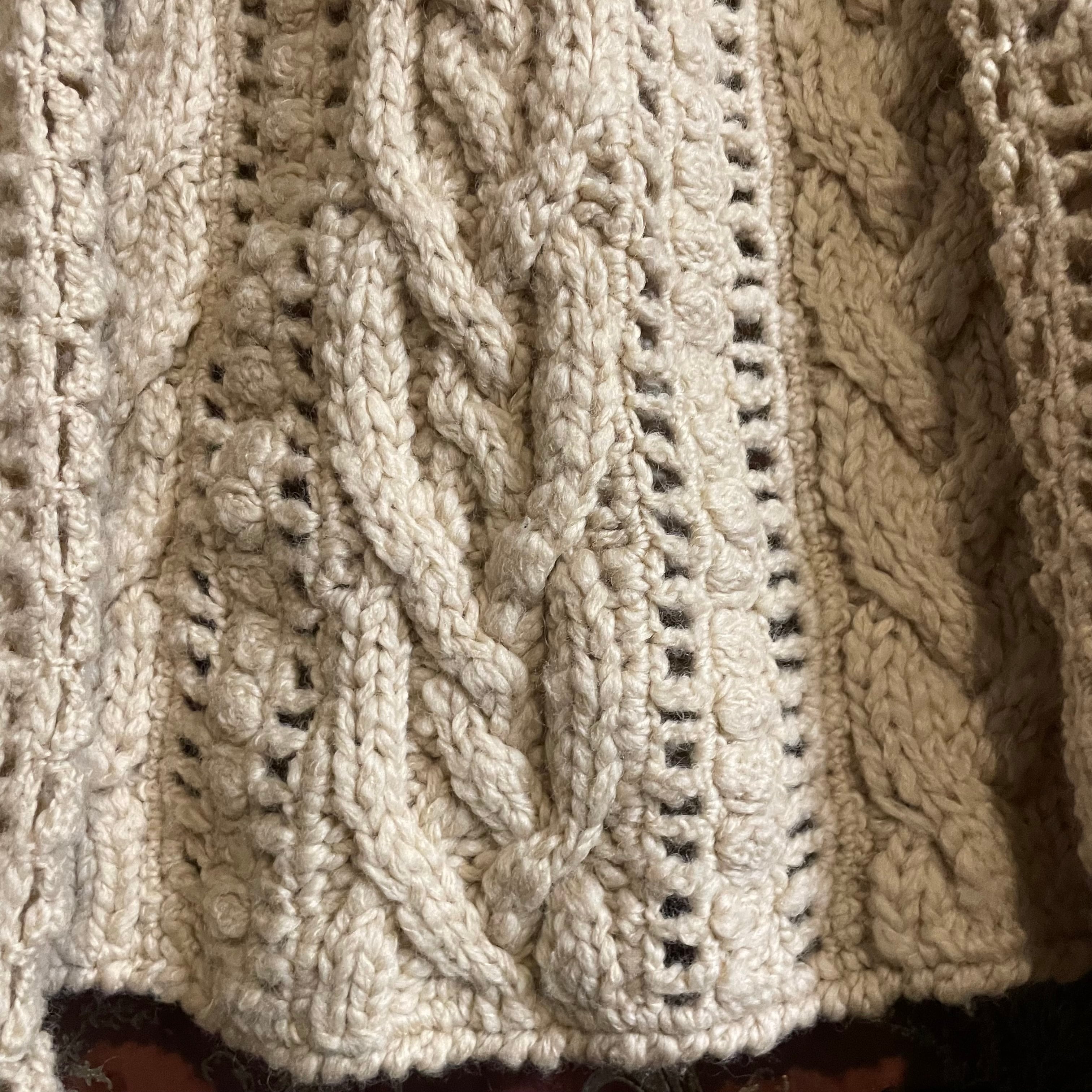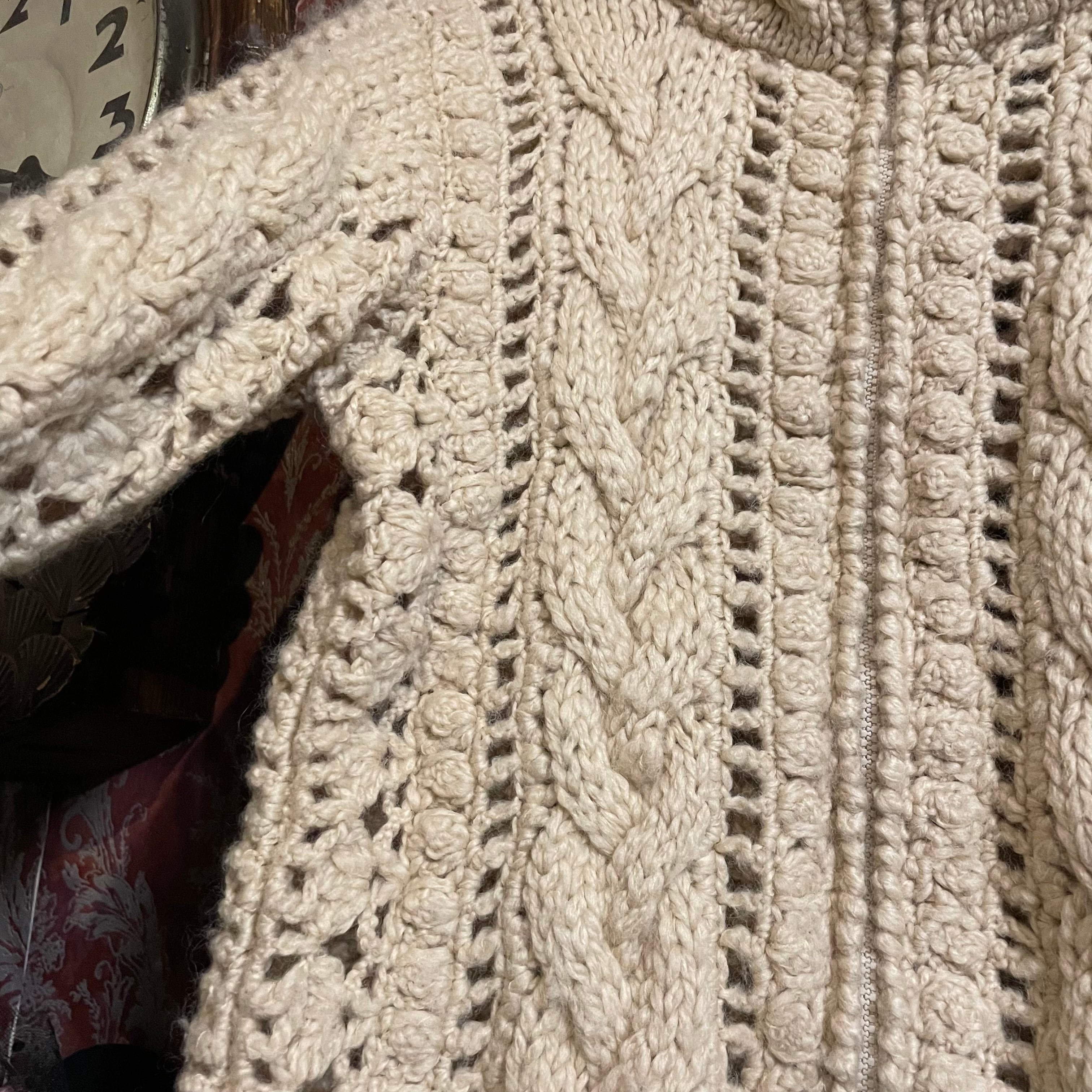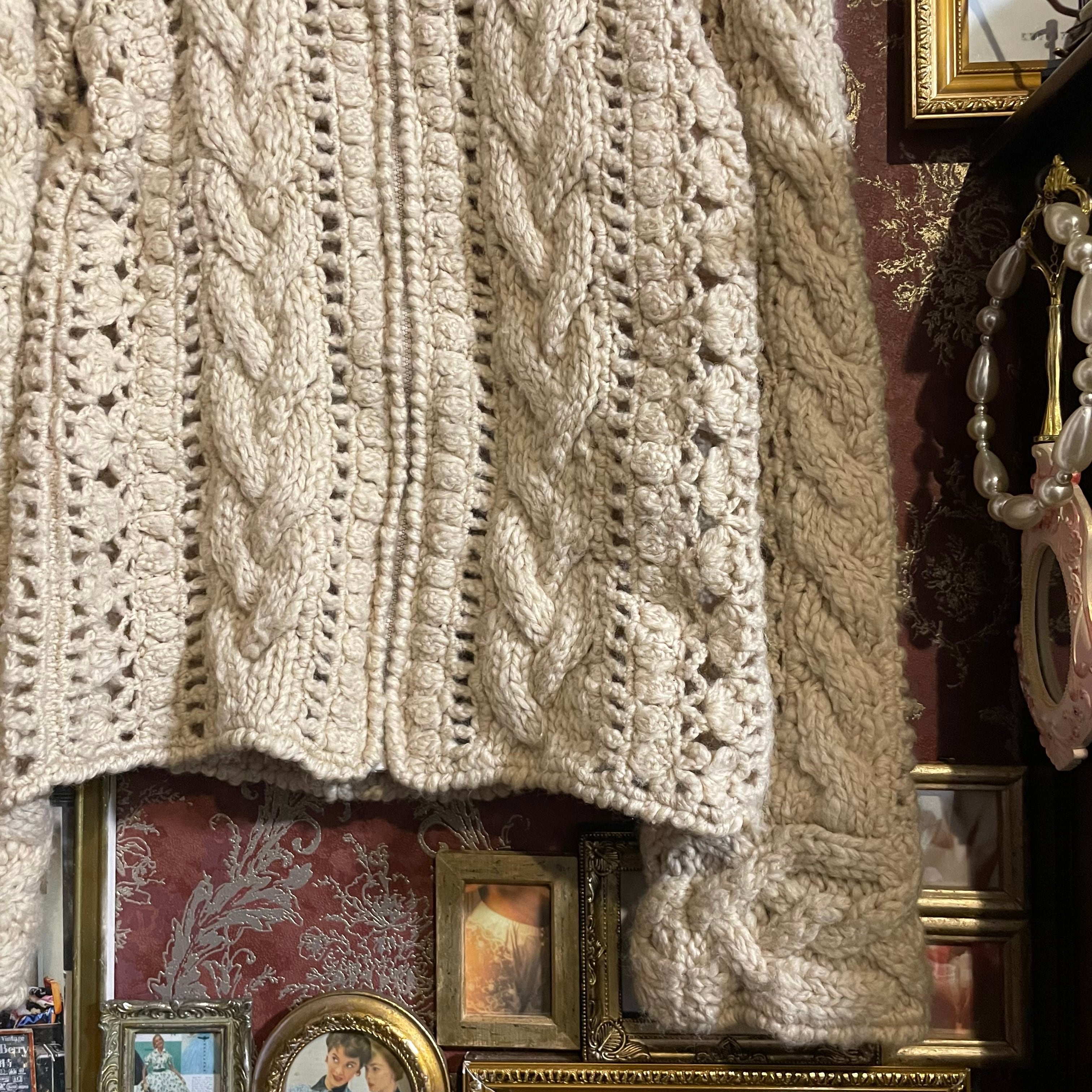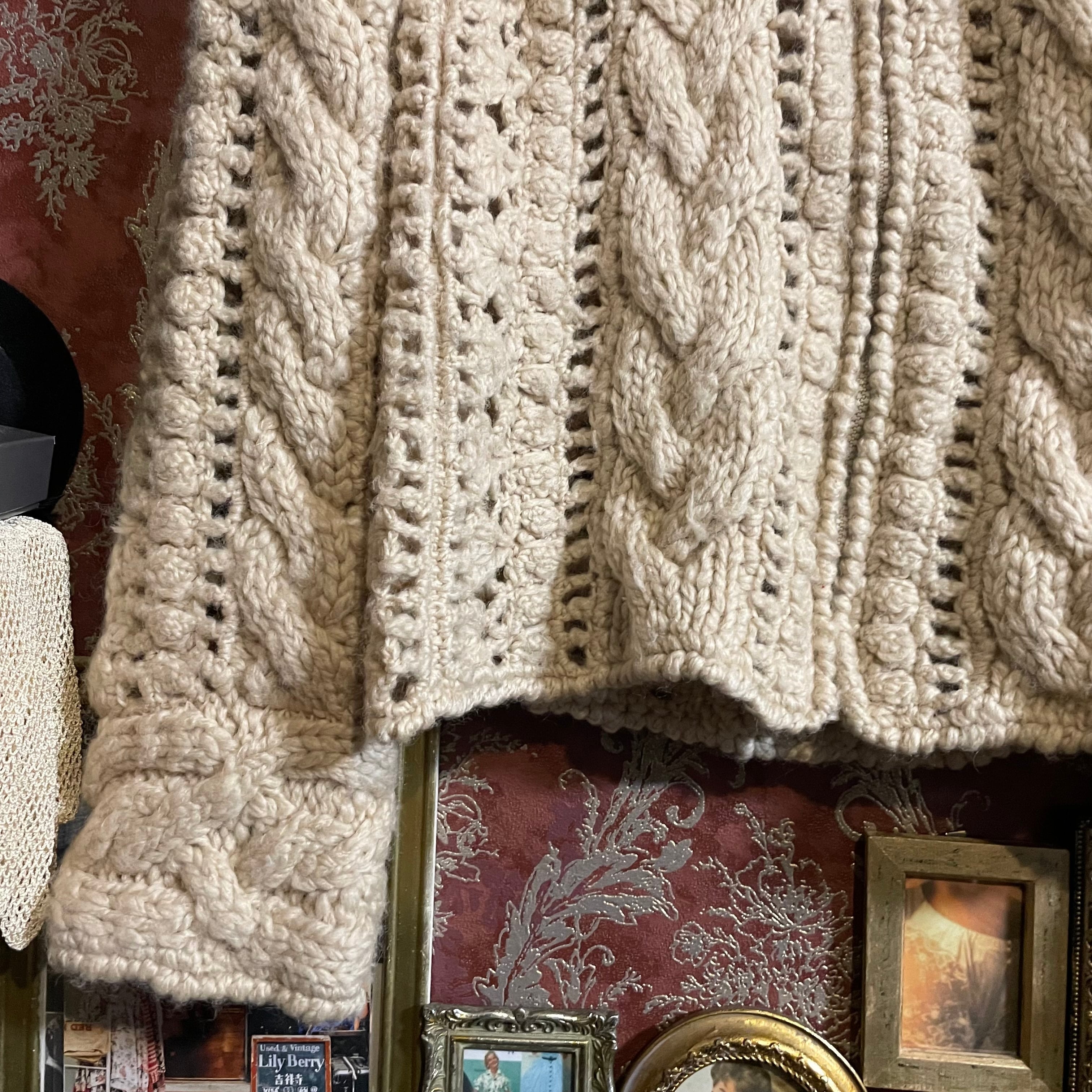 太めのウール糸で編み上げた立体的なケーブル模様に、かぎ針の透かし編みを組み合わせたデザインは、ナチュラルでありながらどこかエレガントな雰囲気を漂わせます。