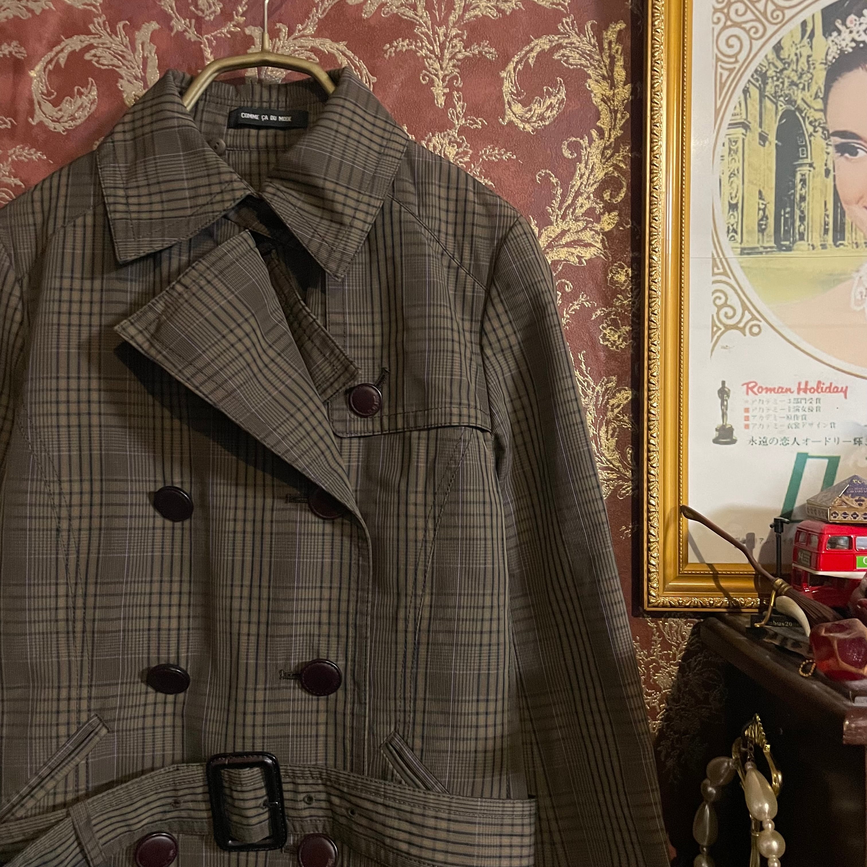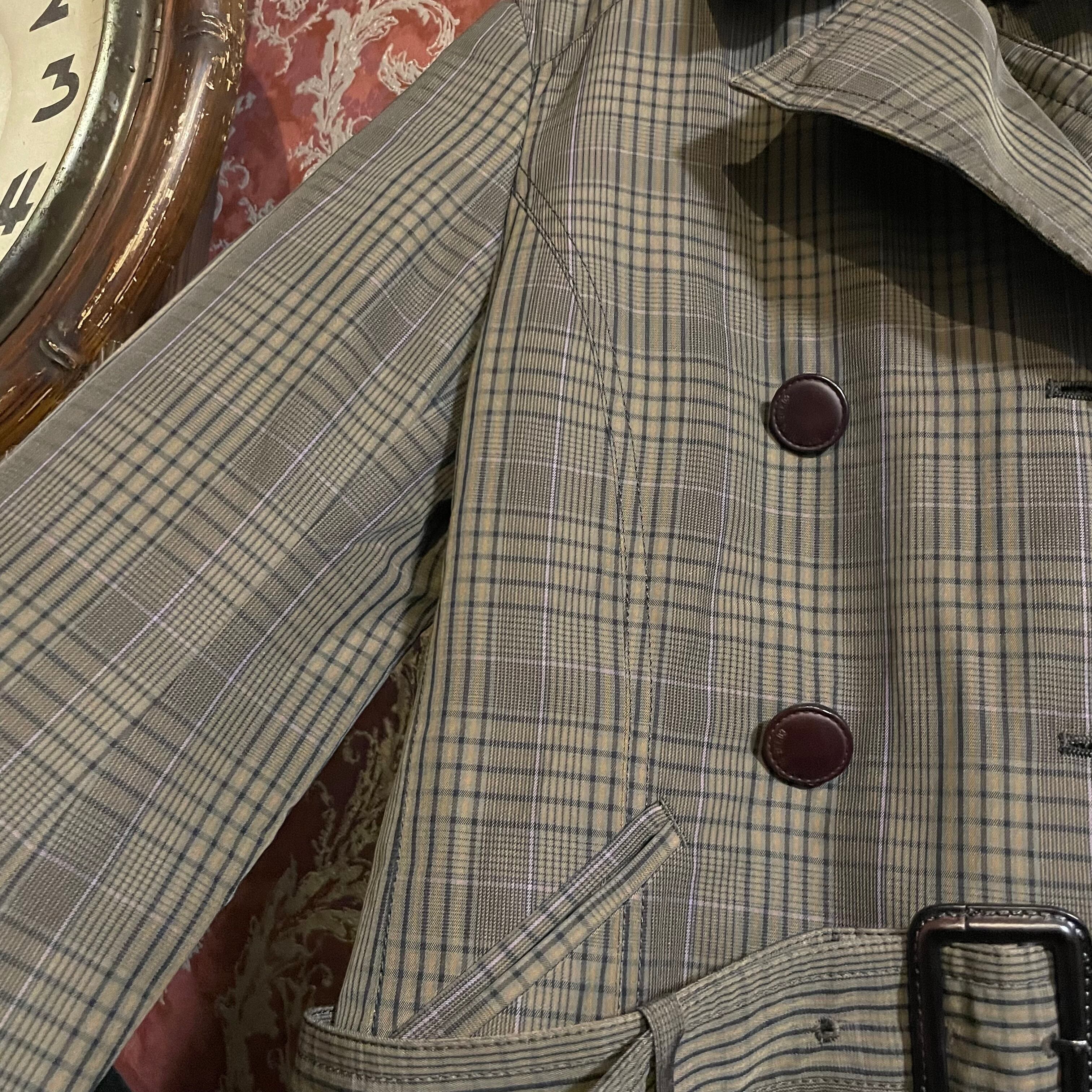 深みのあるカーキグレー(#3f4037)をベースにした、上品なグレンチェック柄のトレンチ風ショートジャケットです。