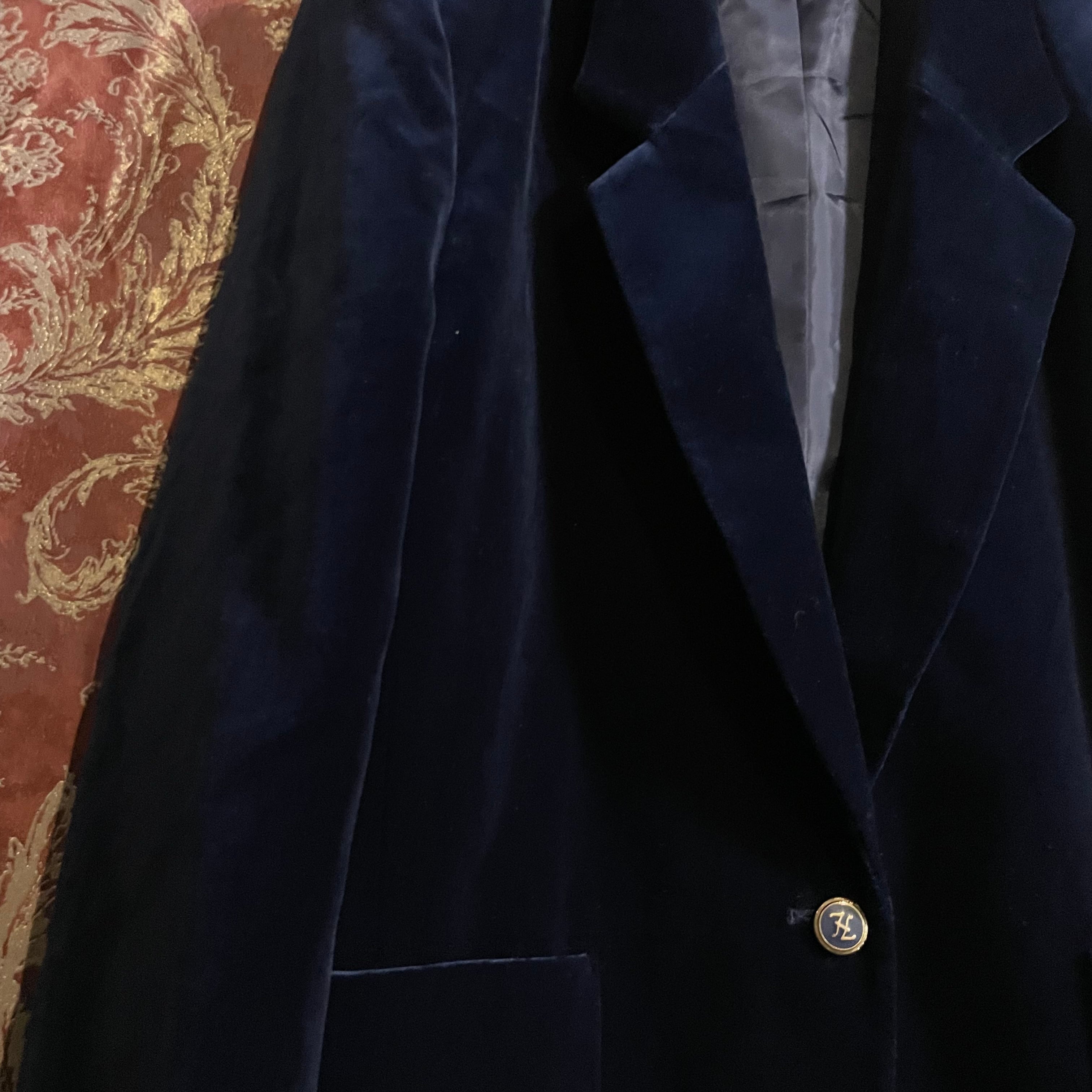深みのあるミッドナイトネイビー(#1a1a2e)の光沢が美しい、ベルベットのジャケットとスカートのセットアップです。