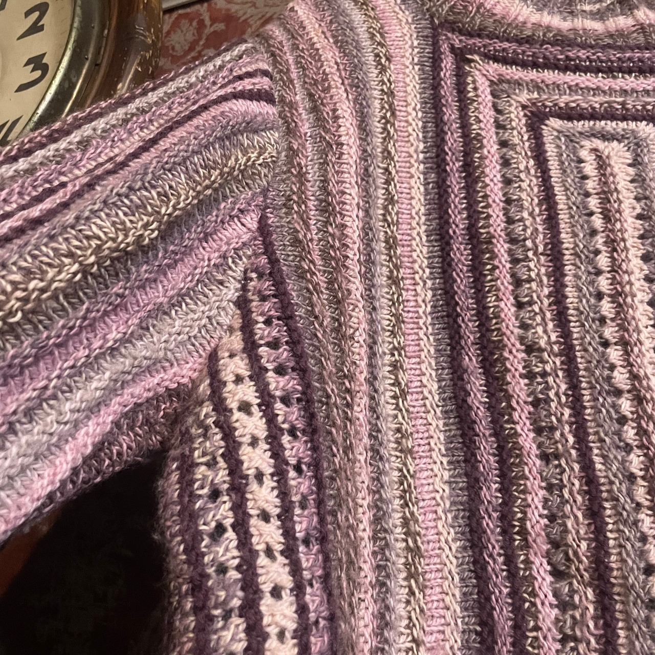 やさしいラベンダーやグレー、モーブトーンが織りなす手編みのマルチストライプニットです。