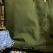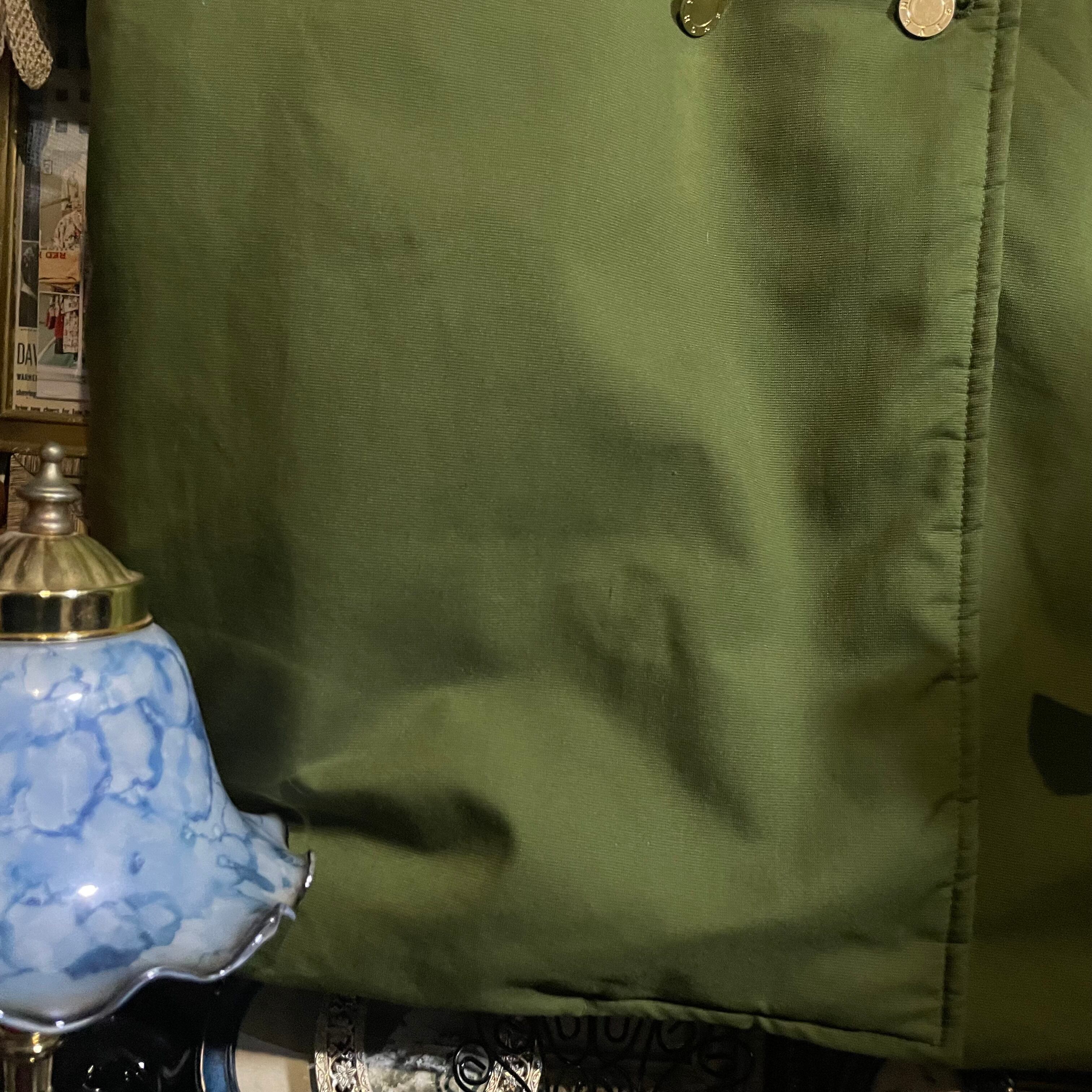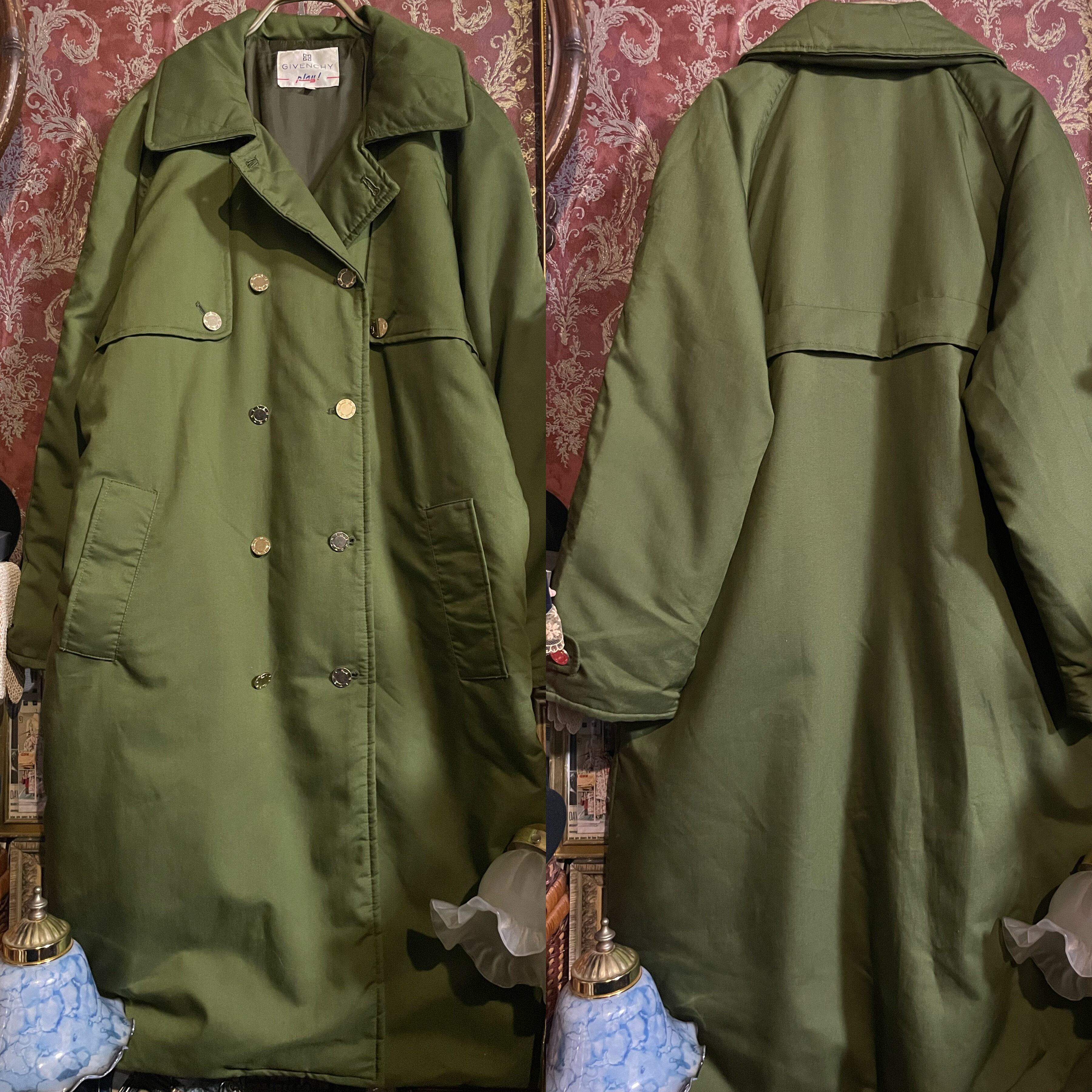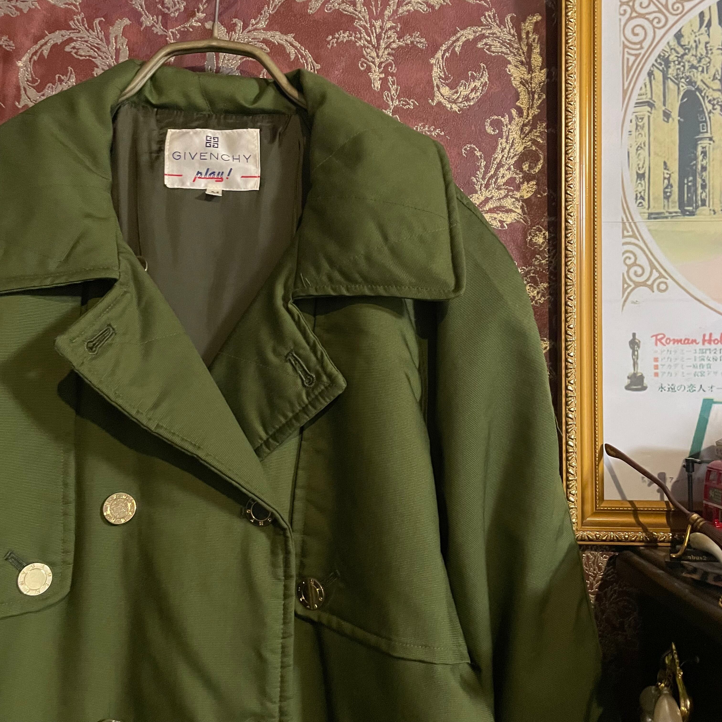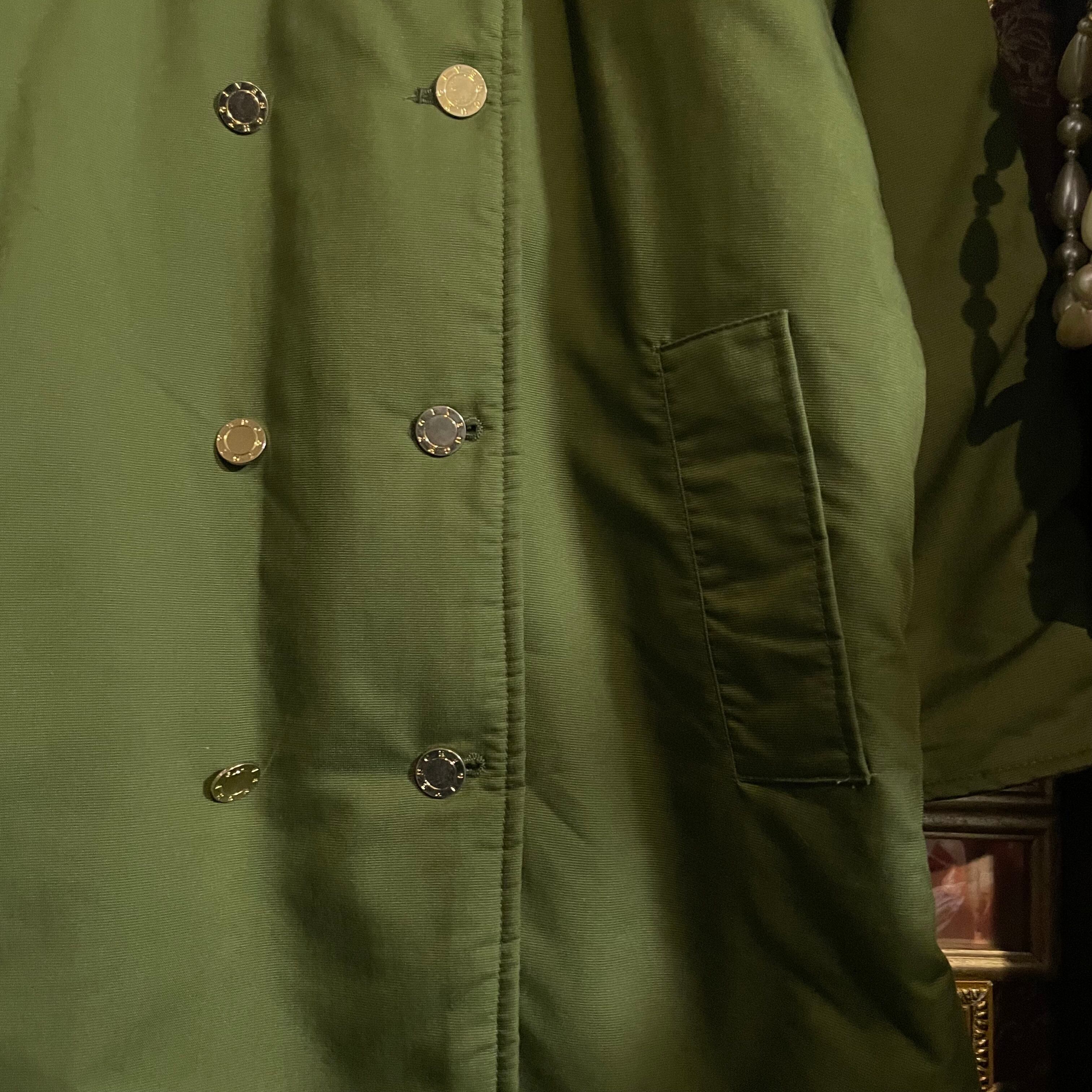 ミリタリーテイストをベースにした抹茶のような明るいカーキカラーと、クラシカルなダブルボタンデザインが印象的です。