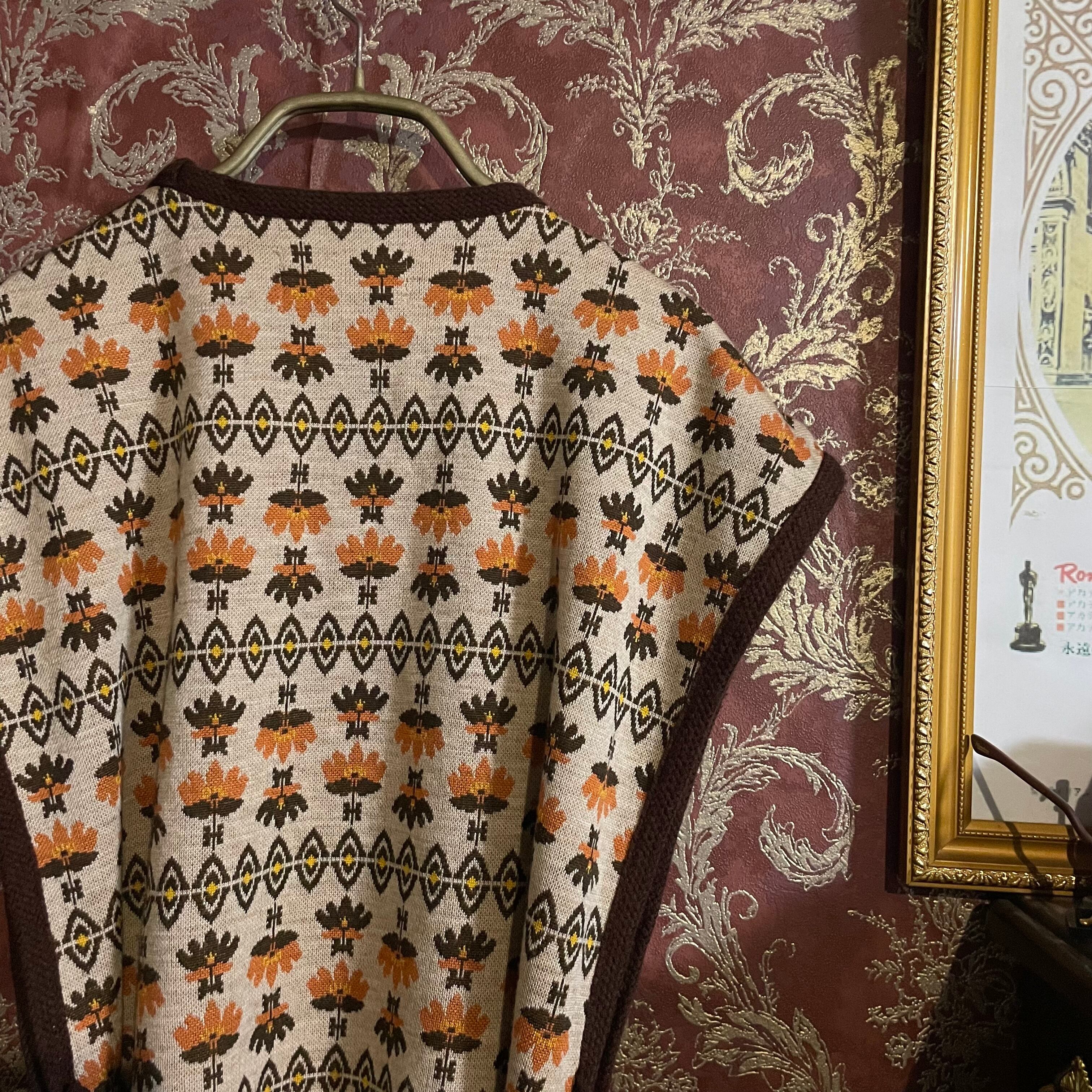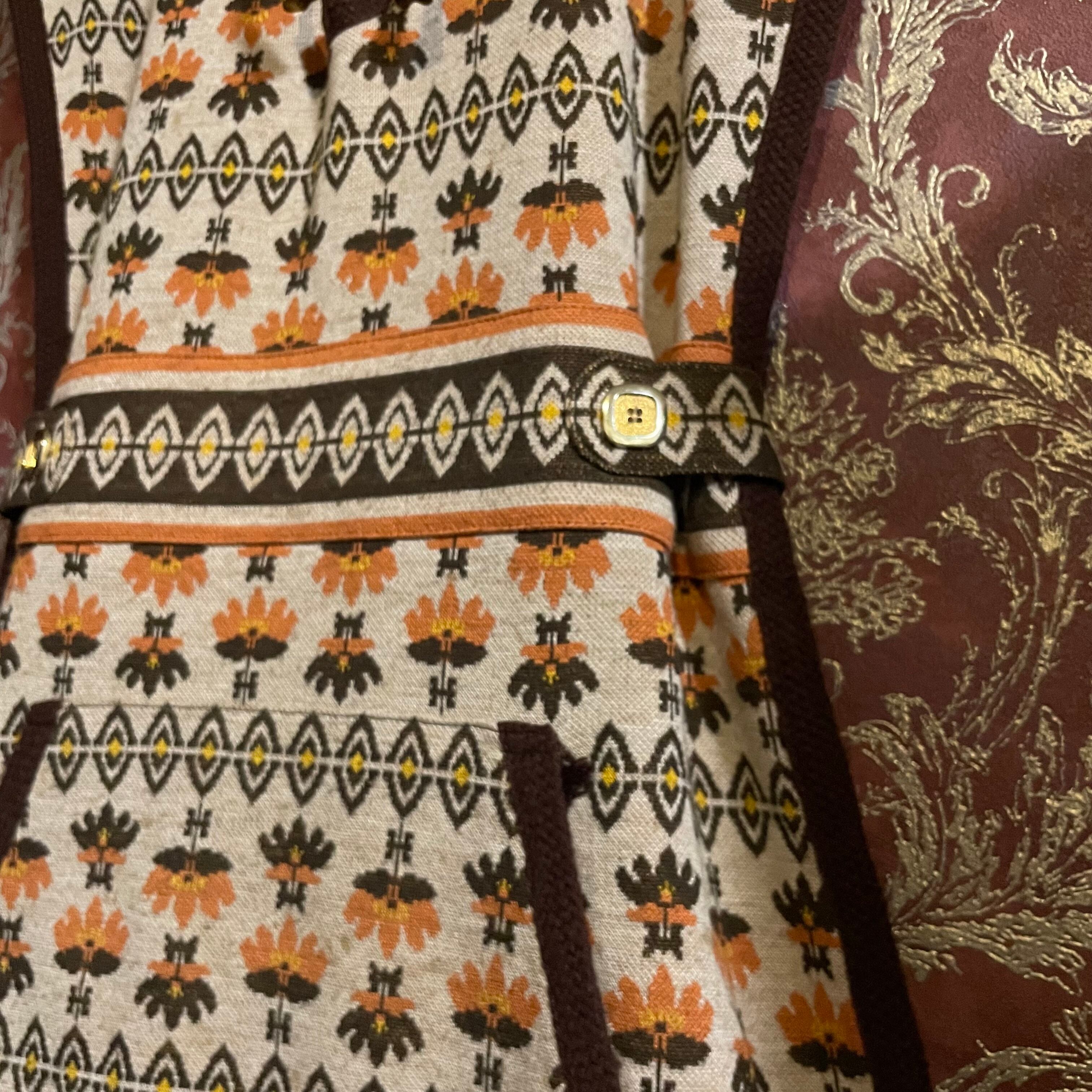 落ち着いたベージュをベースに、オレンジ×ブラウンの小花柄とジオメトリック模様を組み合わせた、レトロ感たっぷりのフォークロア調ベストです。