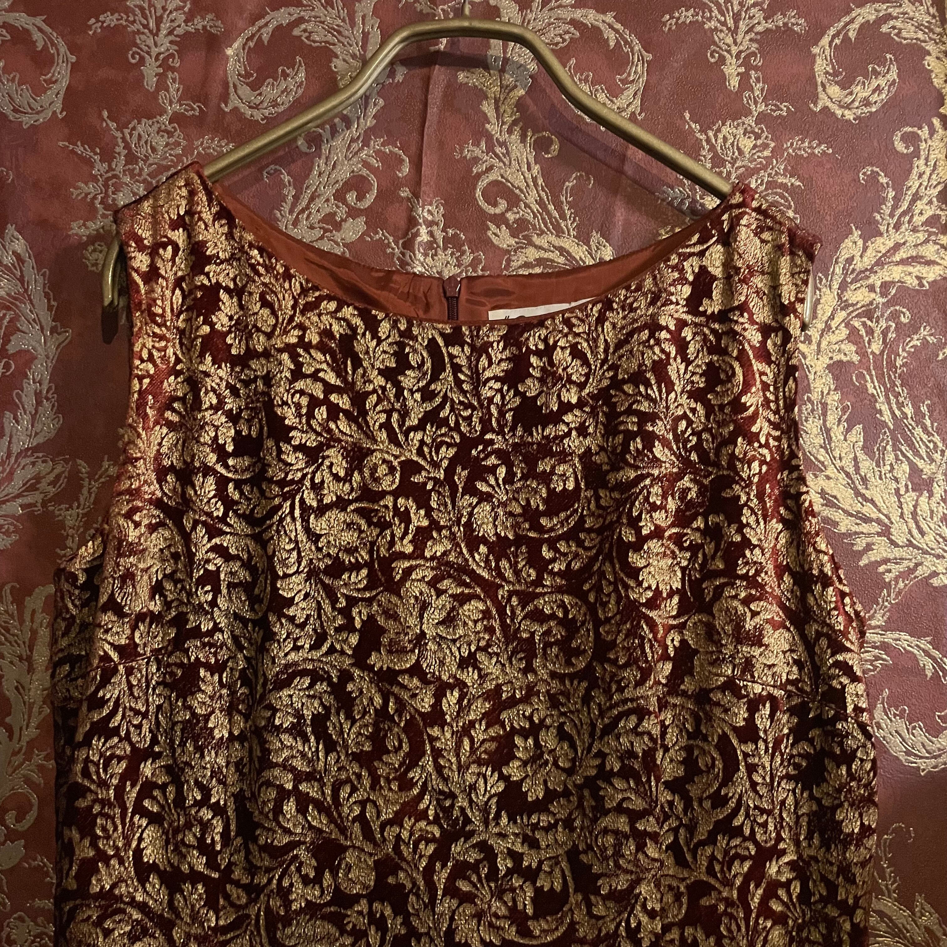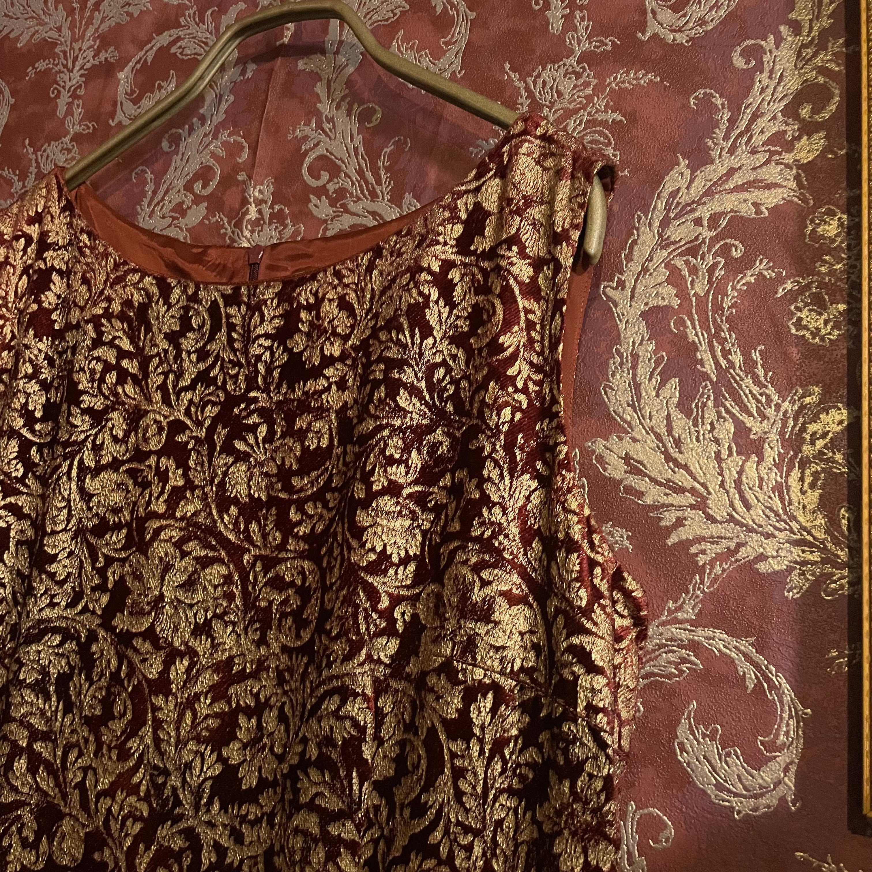 深みのあるボルドー地に、ゴールドの植物唐草模様が浮かび上がるカットベルベット(カットパイルジャカード)で作られています。
