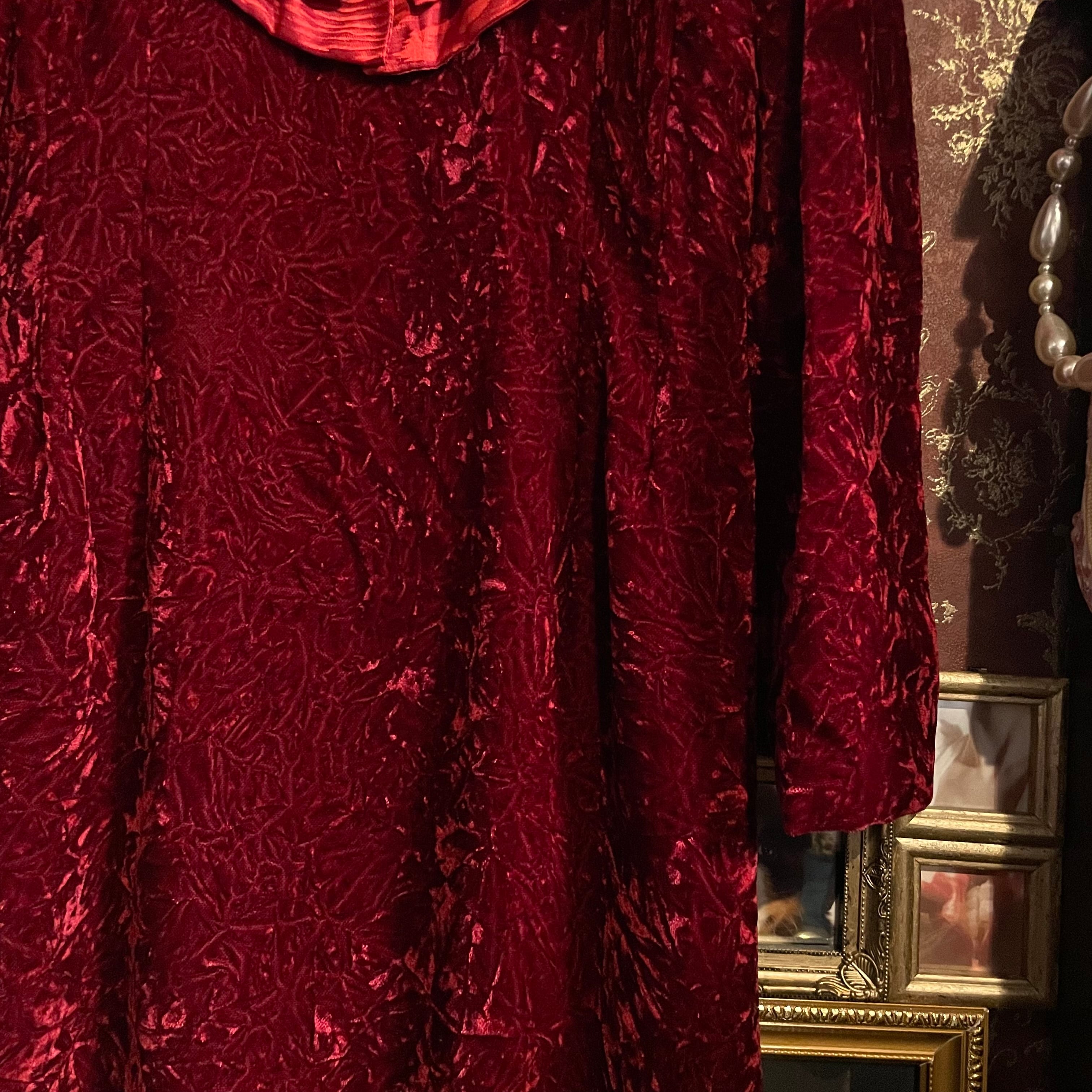 深いワインレッド(#5E0B1F)の光沢が揺れる、クラッシュベロア特有の陰影が美しいヴィンテージドレスです。