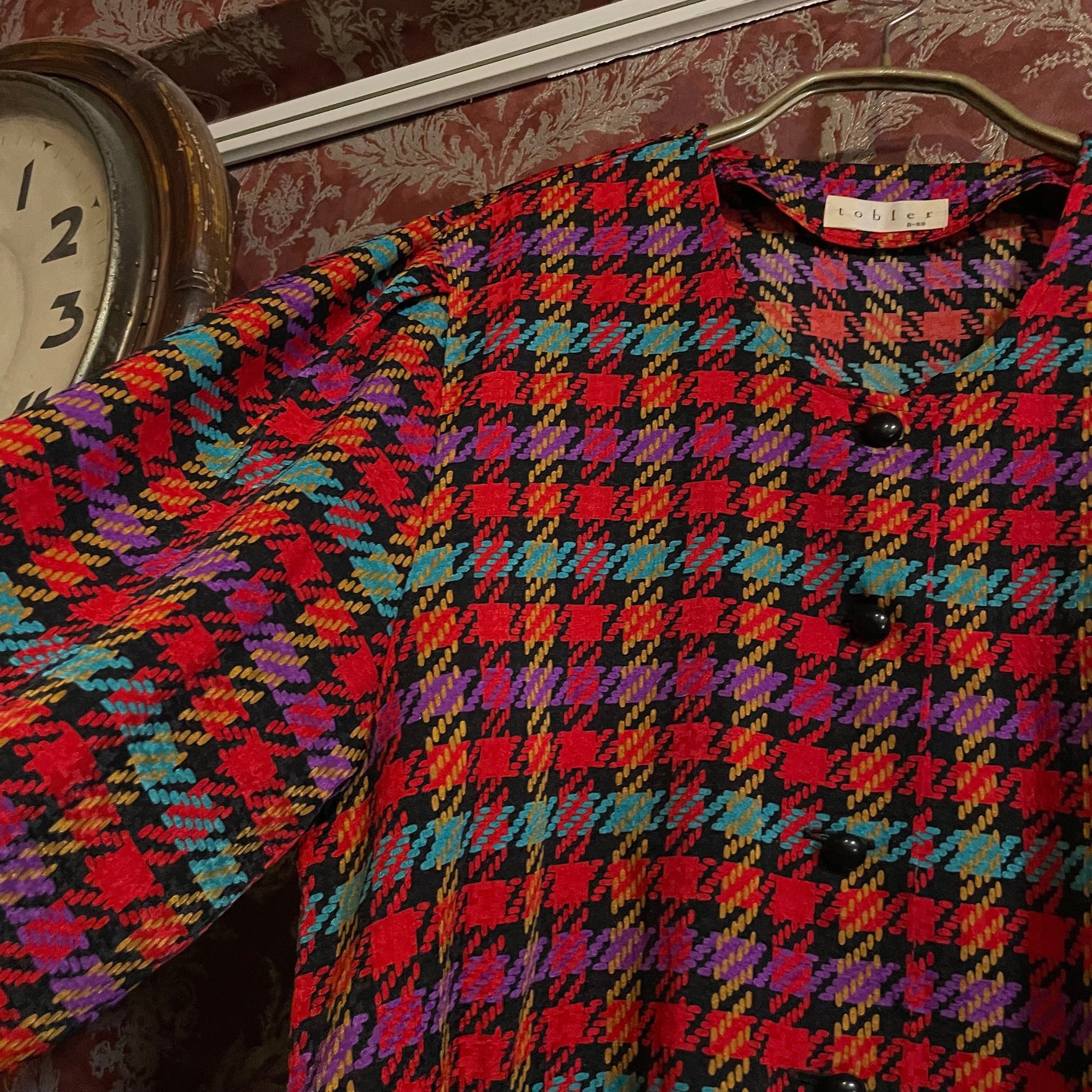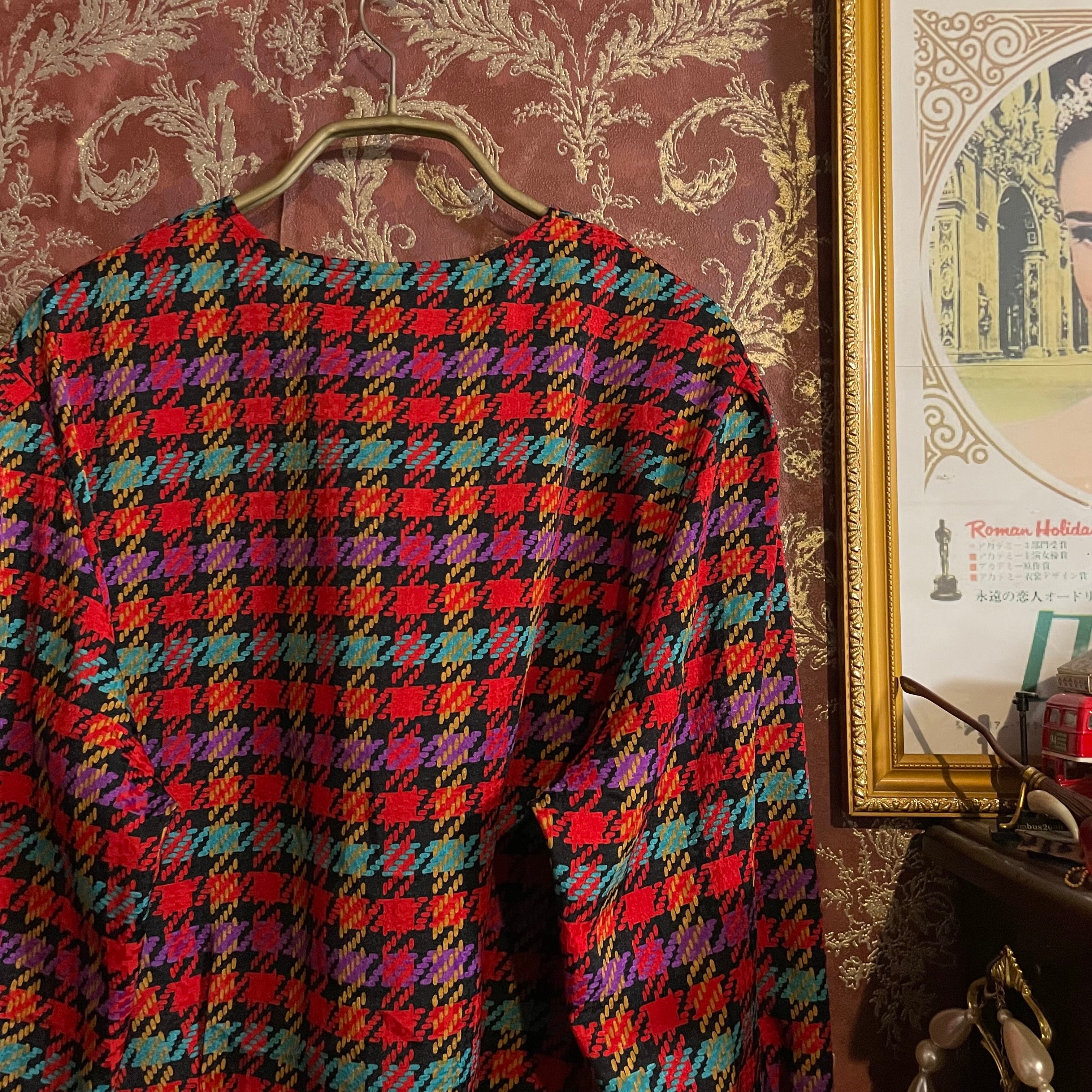 鮮やかな赤・パープル・ターコイズを組み合わせた存在感抜群のチェック柄ブラウスです。