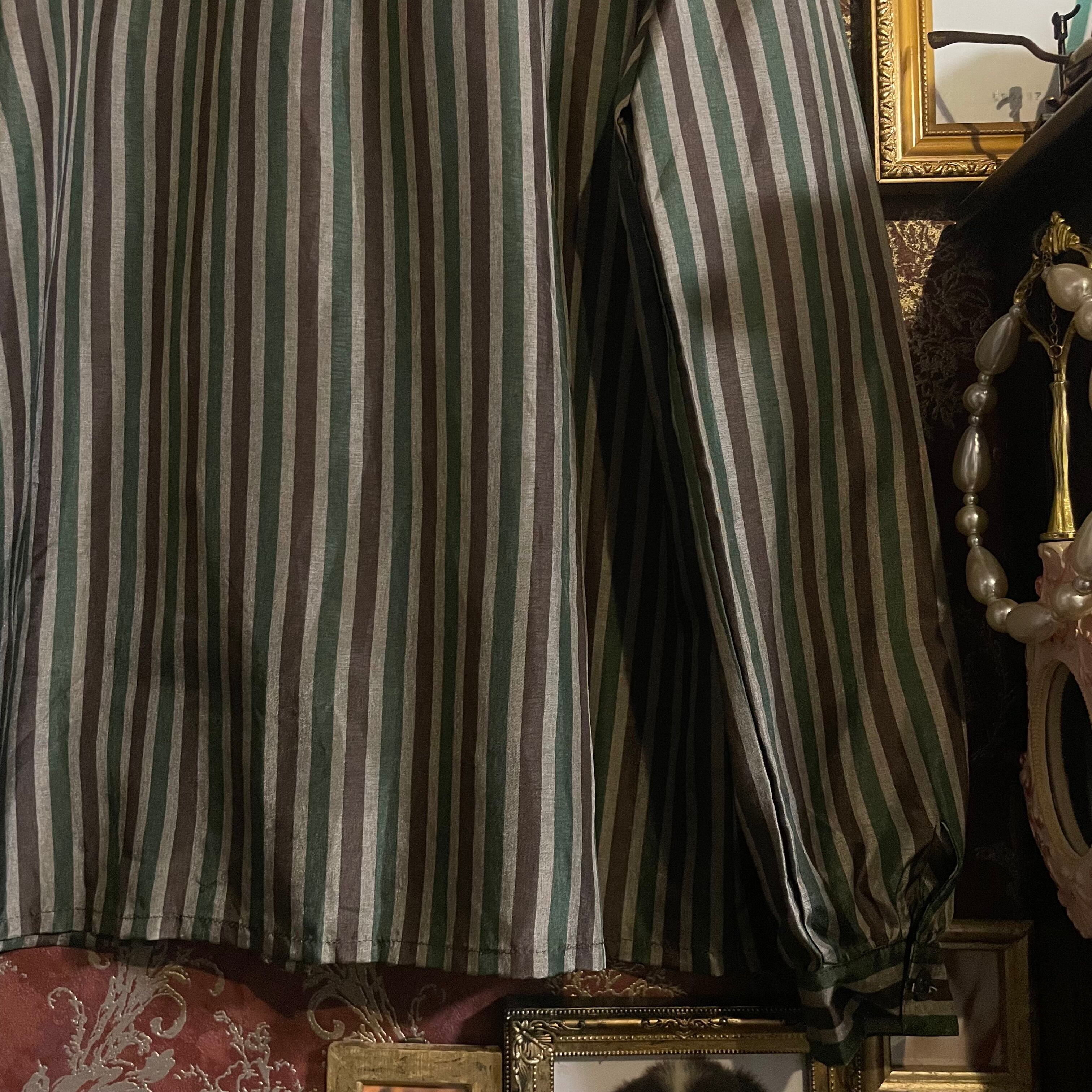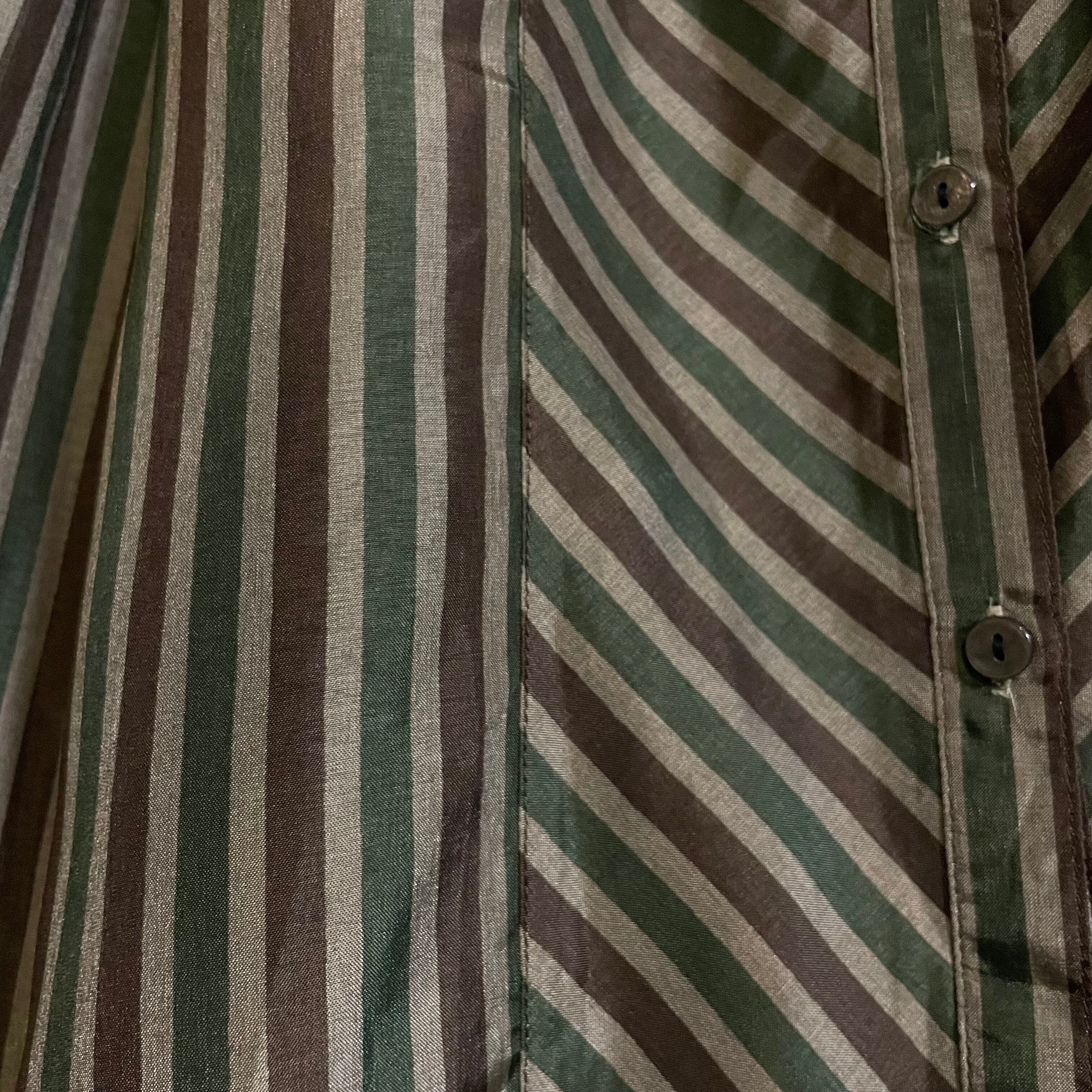 シルバーに近いグレージュ・ブラウン・グリーンが絶妙に混ざり合う、深みのあるストライプ柄のヴィンテージブラウスです。
