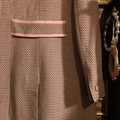 ピンク×ブラウンの細かな幾何学織りが柔らかく奥行きのある表情をつくり、襟にあしらわれた淡いピンクのパイピングが女性らしいアクセントに。