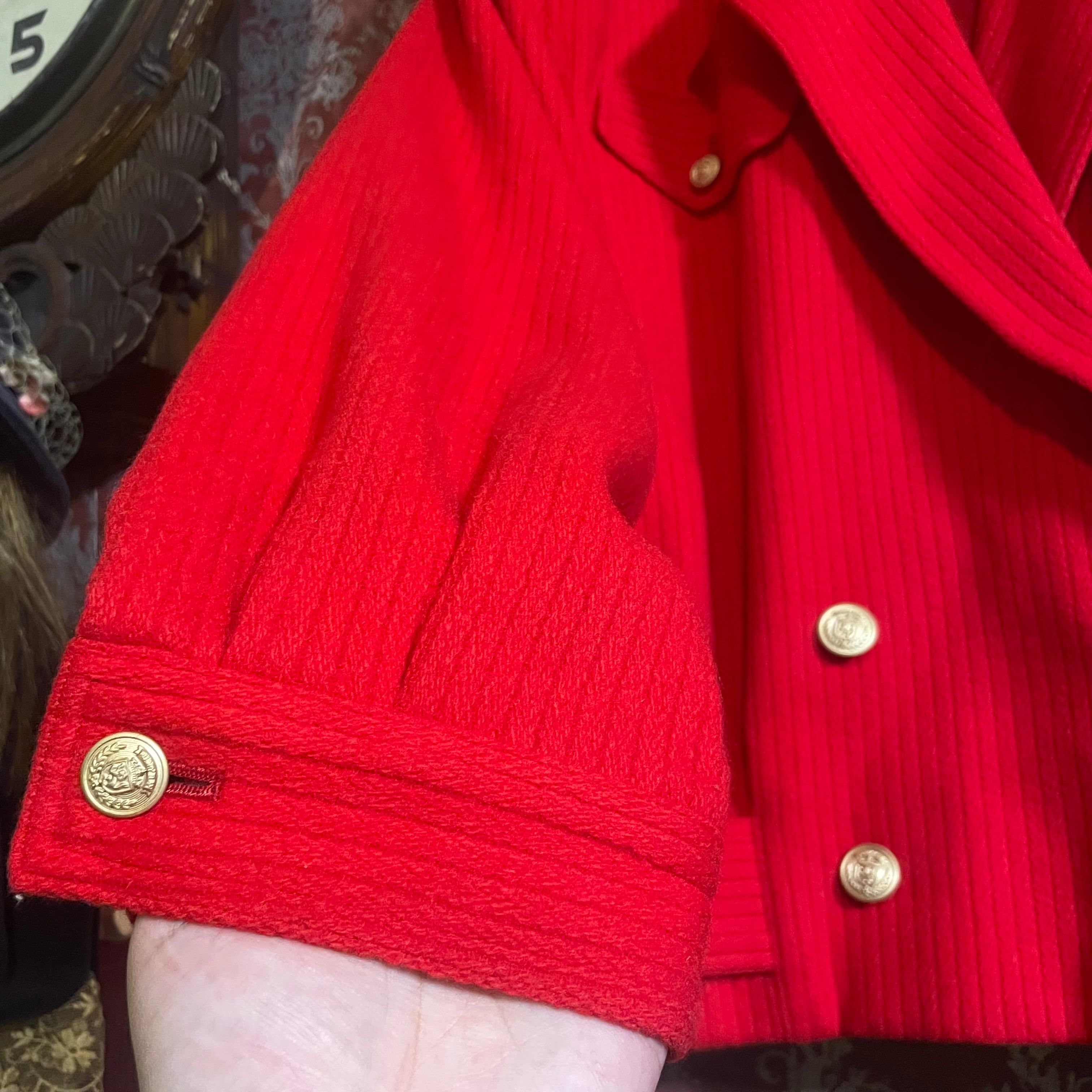 ジャケットはダブルブレストで、アンティークゴールド調のメタルボタンがエレガントな印象です。