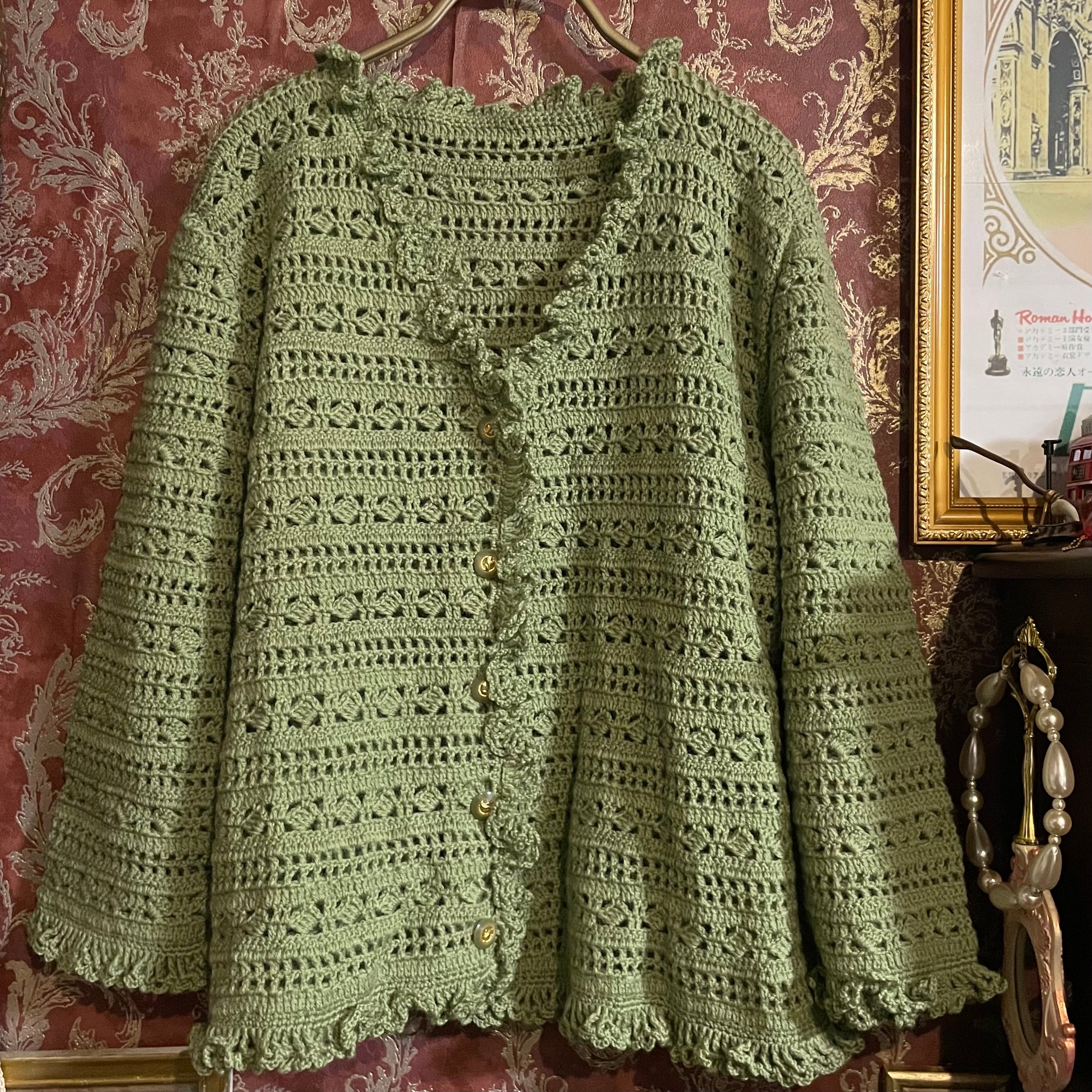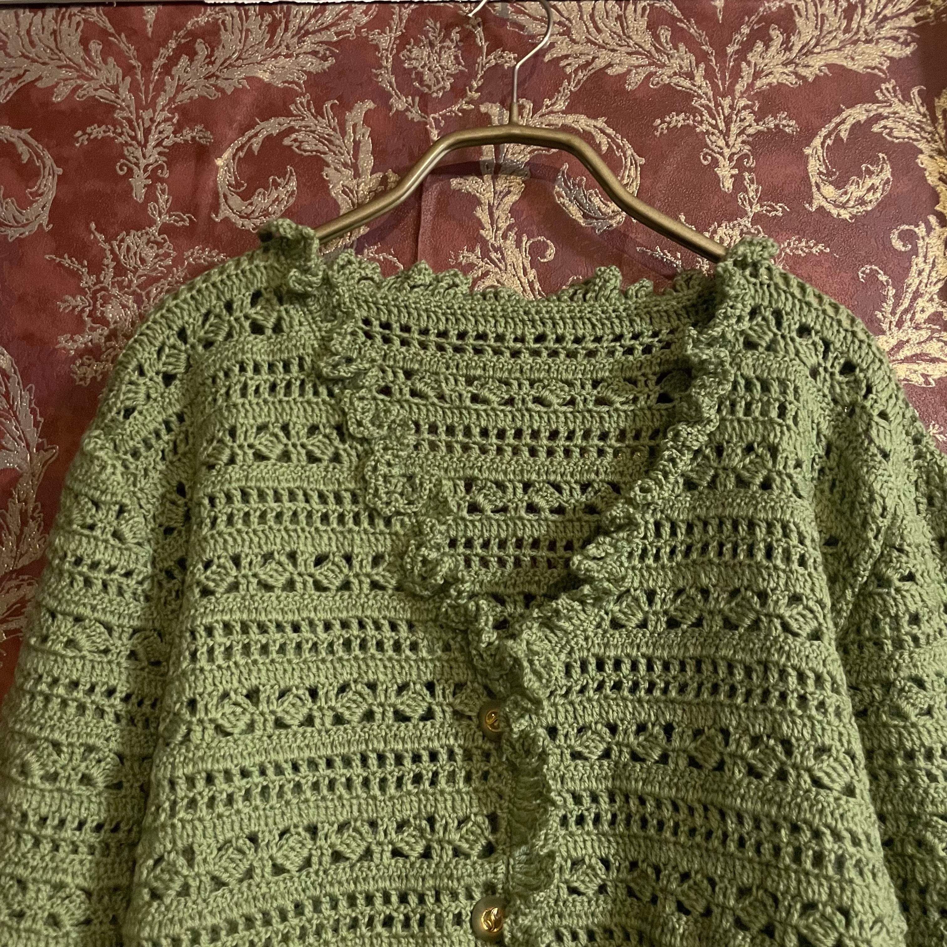 落ち着いたグリーン(#708c64)が優しく映える、ハンドメイドのかぎ針編みカーディガンです。