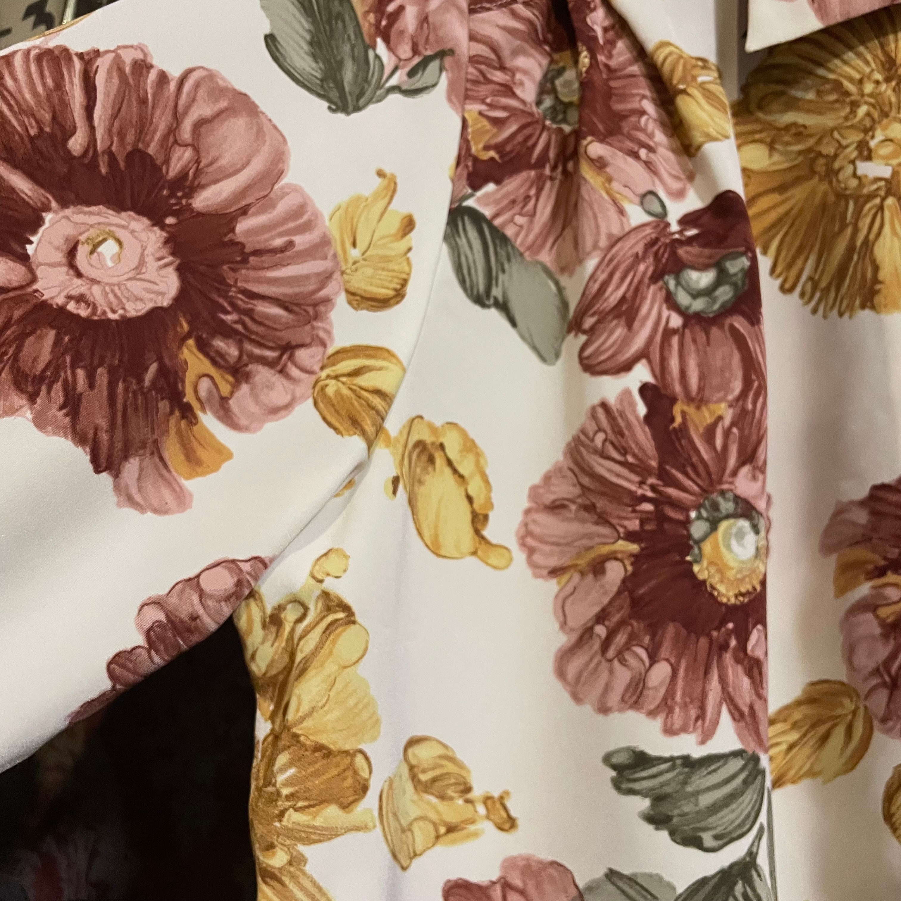 アイボリーに近いホワイトに、ピンク、イエロー、グリーンなどのくすみトーンで統一された花々が咲き誇り、存在感のある一枚に仕上がっています。