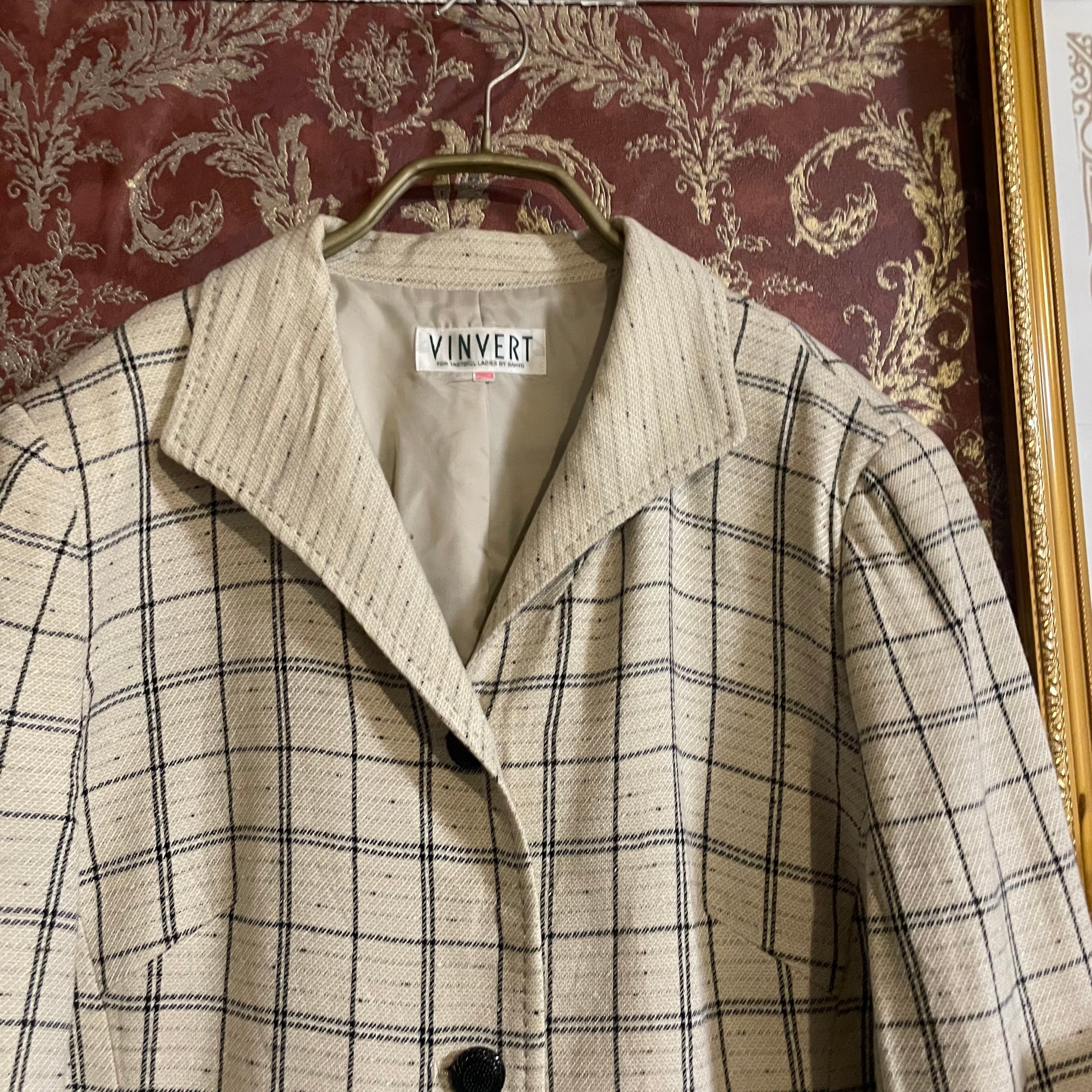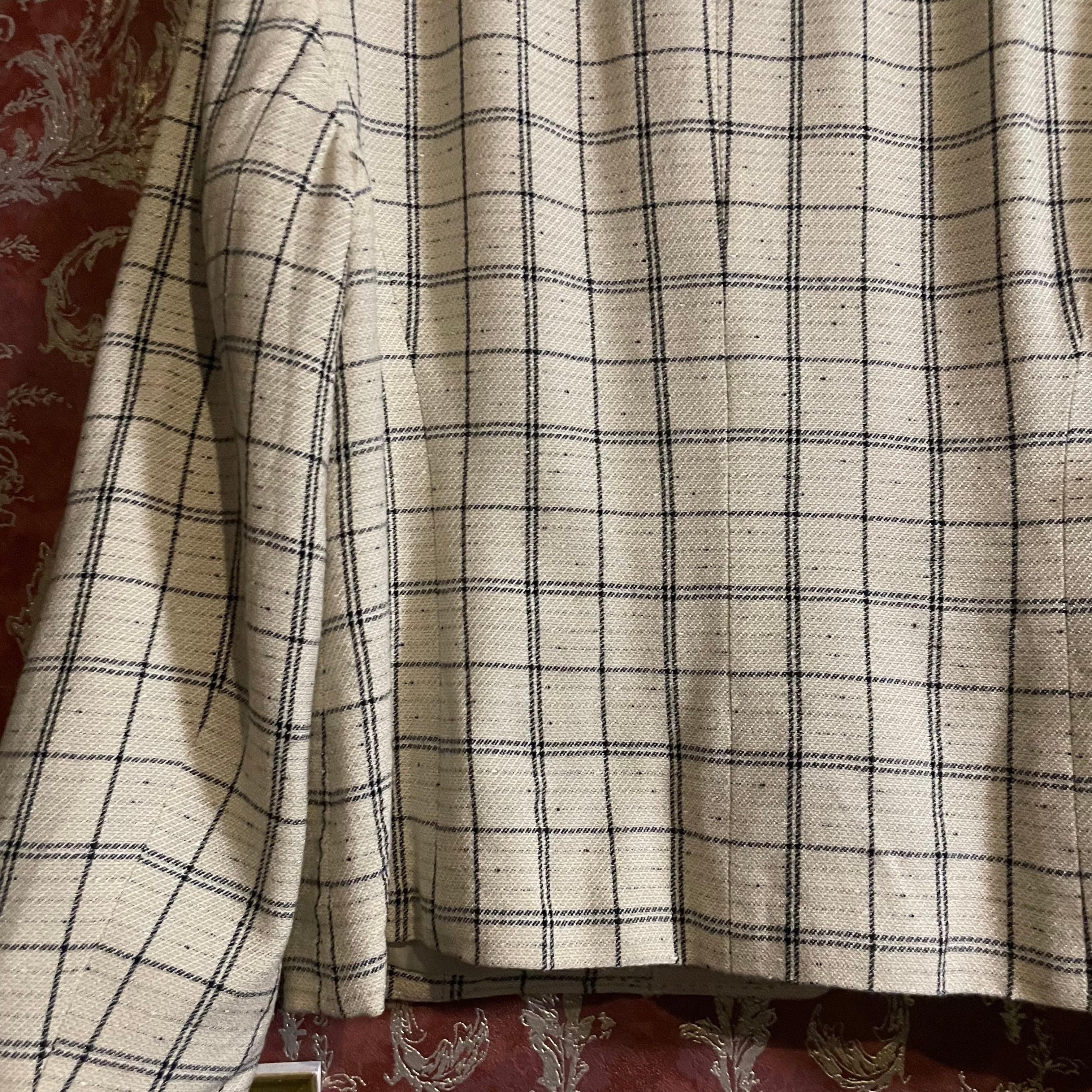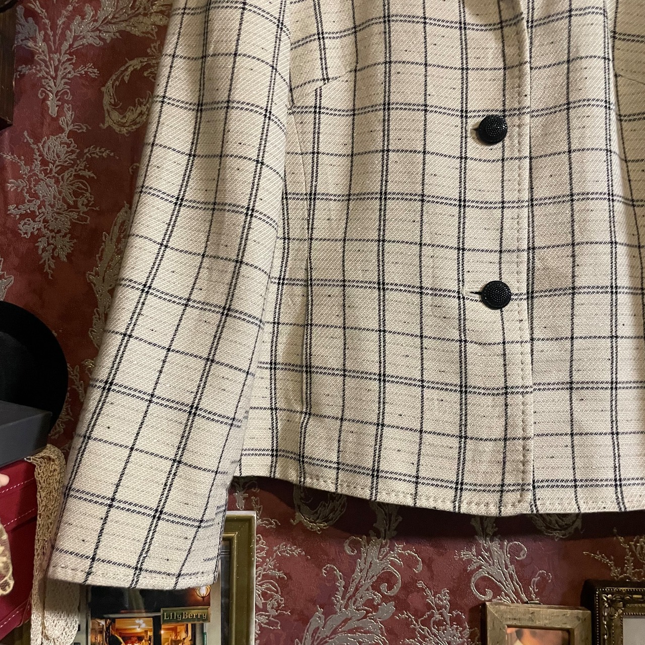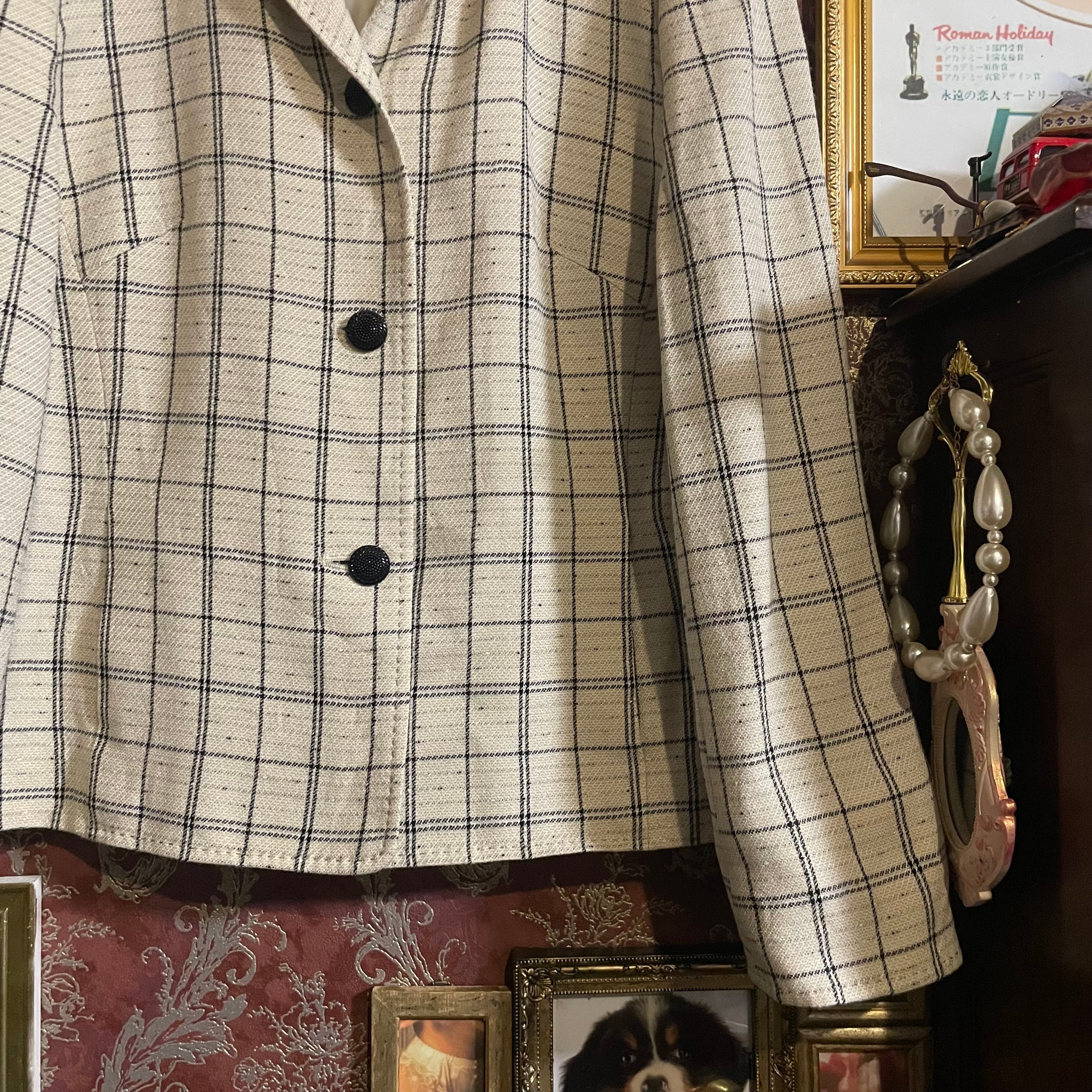 ナチュラルな生成りカラーをベースに、繊細なブラックとネイビーのラインで描かれたチェック柄が印象的な、ジャケットとスカートのセットアップです。