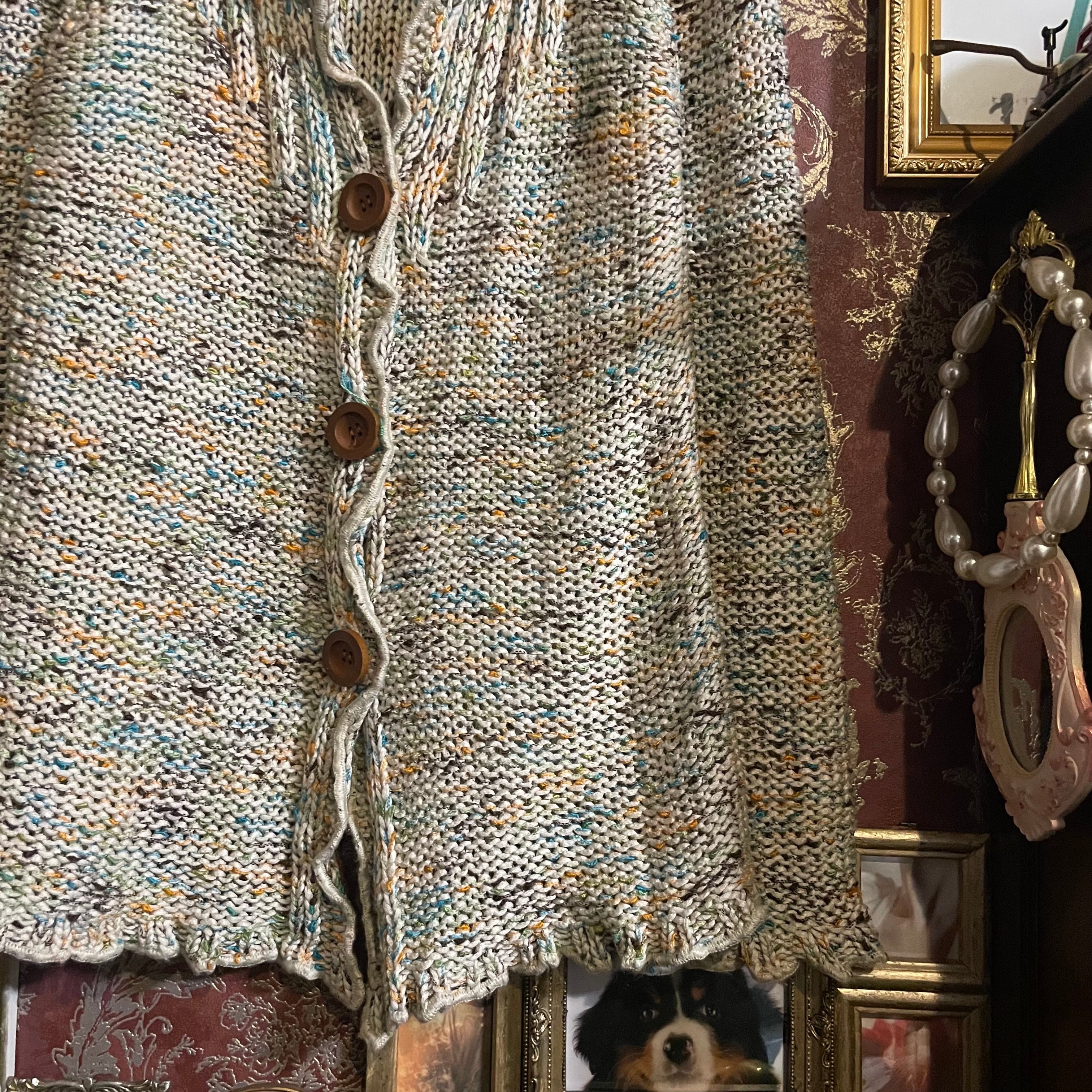 ざっくりとした編み地ながらも、フリルのように波打つ前立てや裾のディテールがフェミニンな印象を添えています。